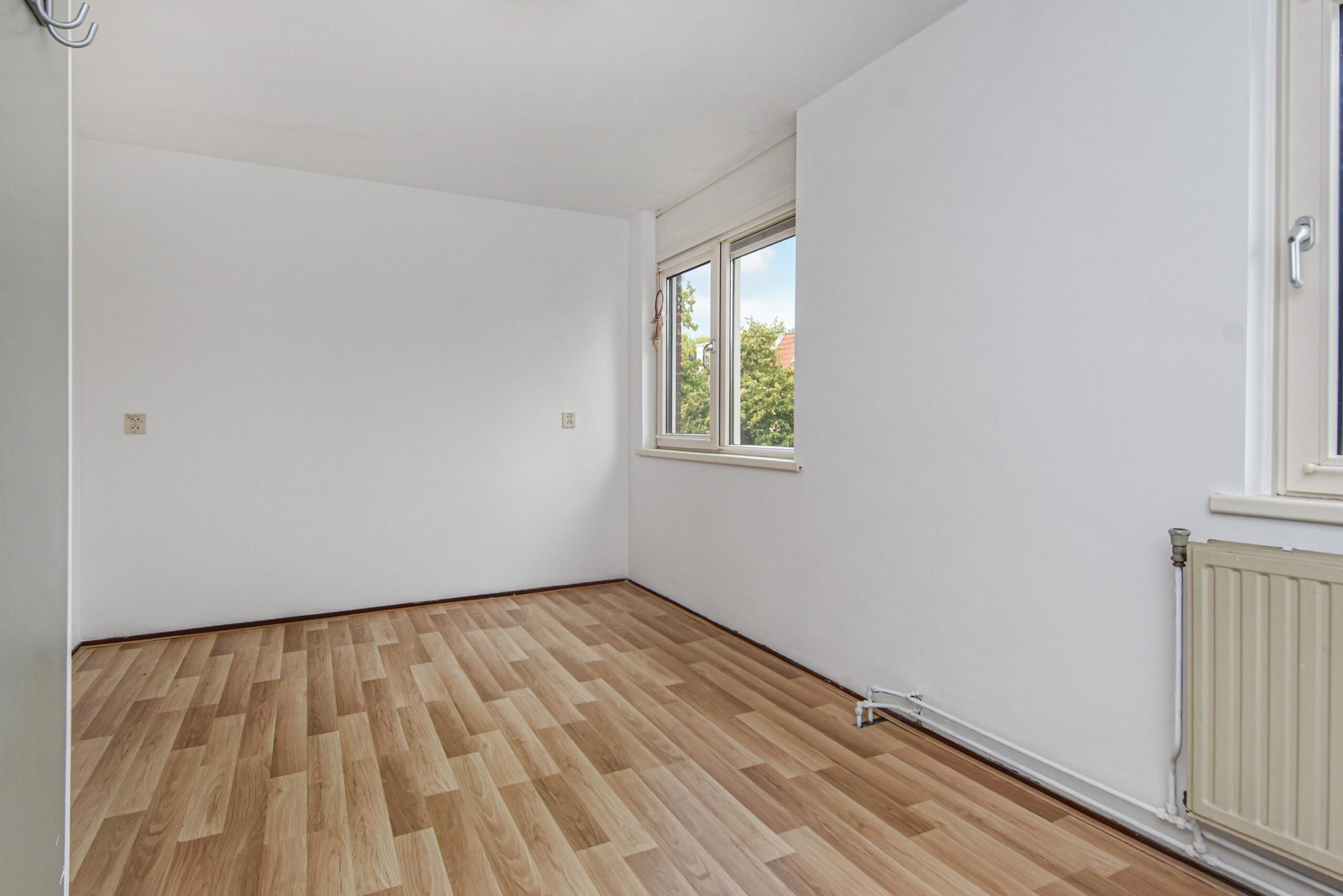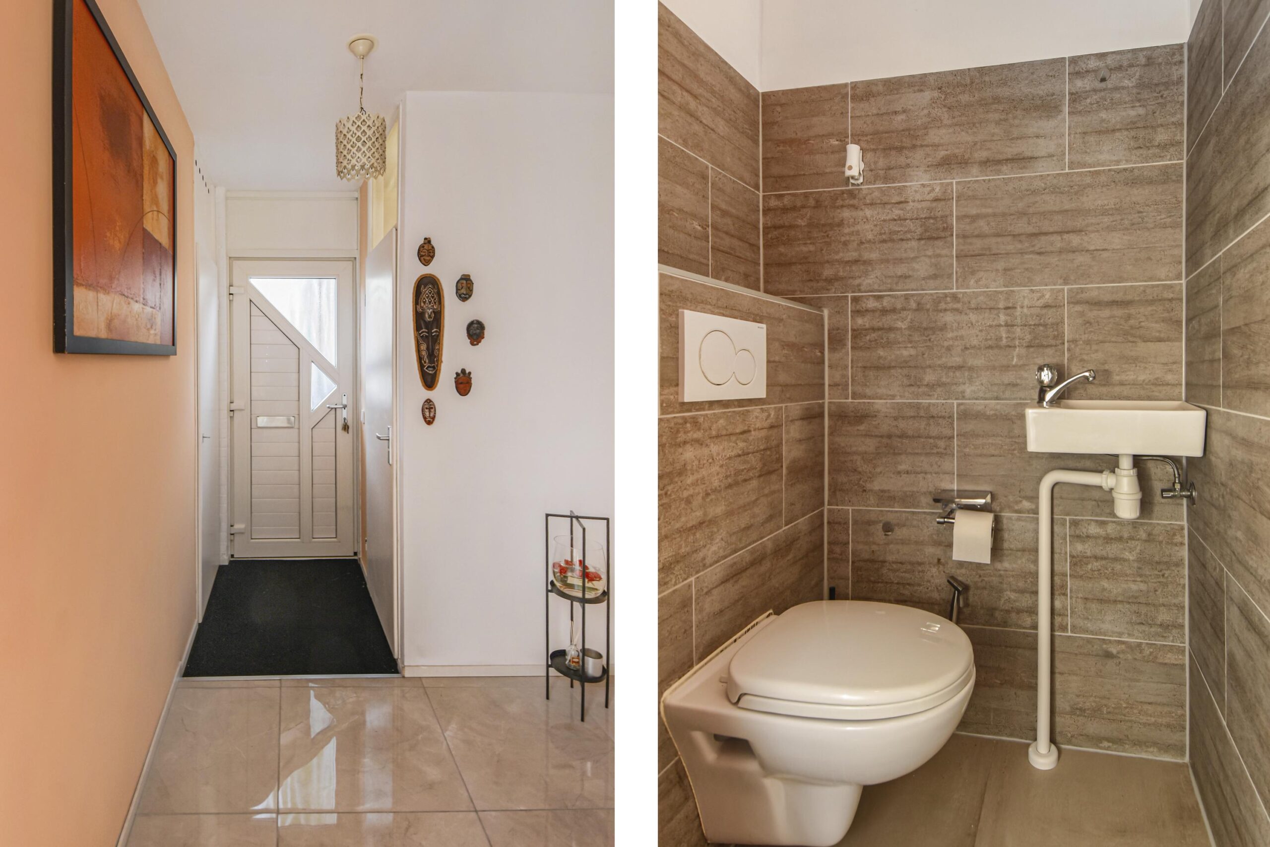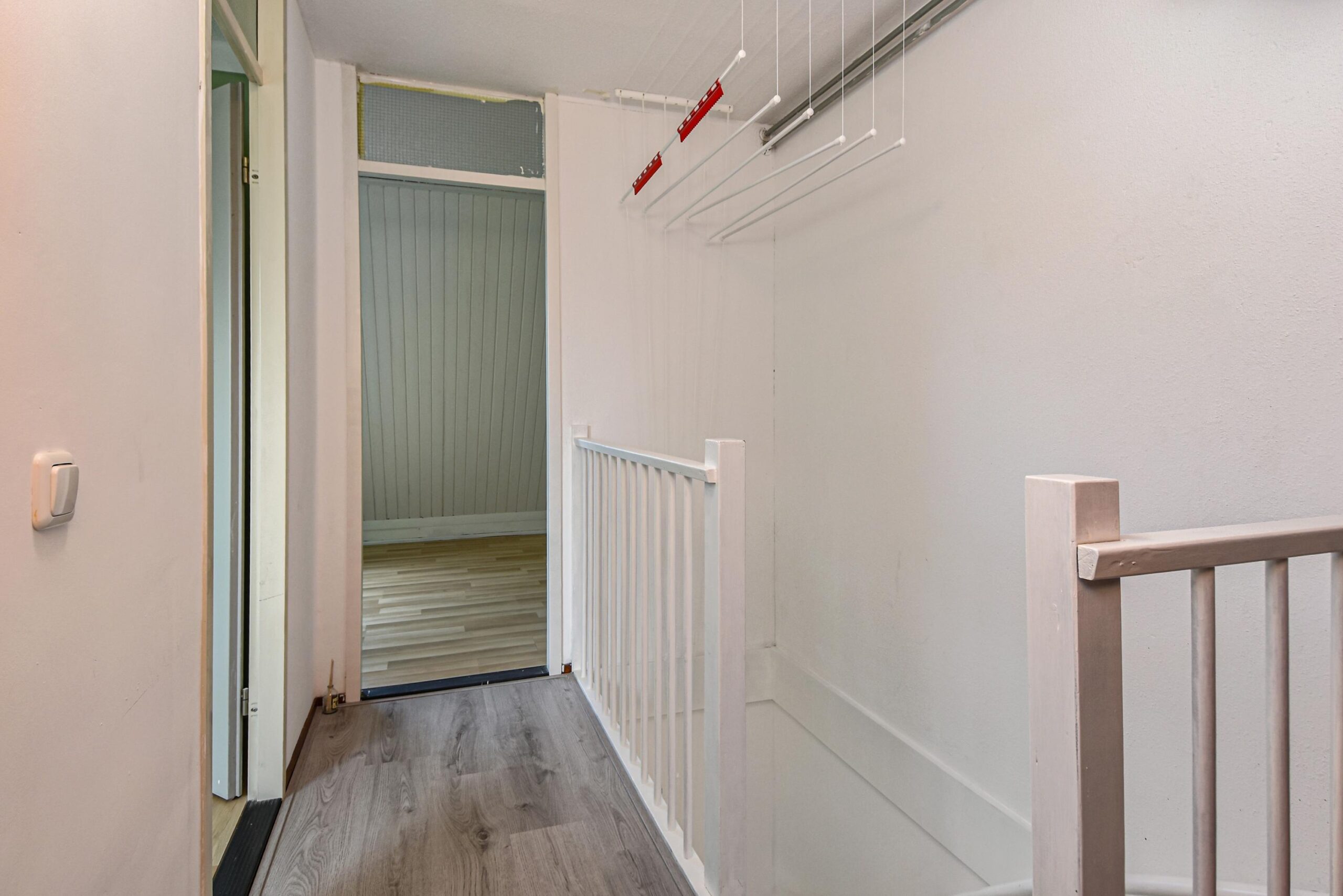 Via de trap bereik je de eerste verdieping. Hier bevinden zich twee slaapkamers van goed formaat, één aan de voorzijde en één aan de achterzijde van de woning. In het midden van de verdieping ligt de badkamer, voorzien van een wastafelmeubel, douche, tweede toilet, handdoekradiator en opstelplaats voor de wasmachine.