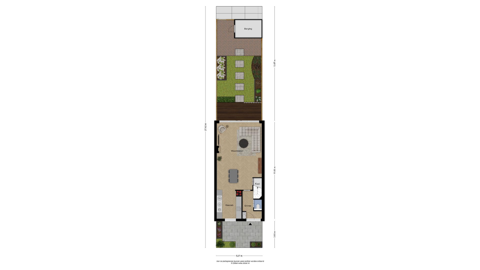 Achterin staat een stenen berging met elektra en stopcontacten. De tuin is bereikbaar via een achterom en voorzien van schuttingen (geplaatst in 2021). Het knikarmscherm over de volle breedte van de woning heeft een uitval van 3 meter en zorgt voor schaduw op warme dagen. Daarnaast is er een gevelkraan aanwezig in de achtertuin.
