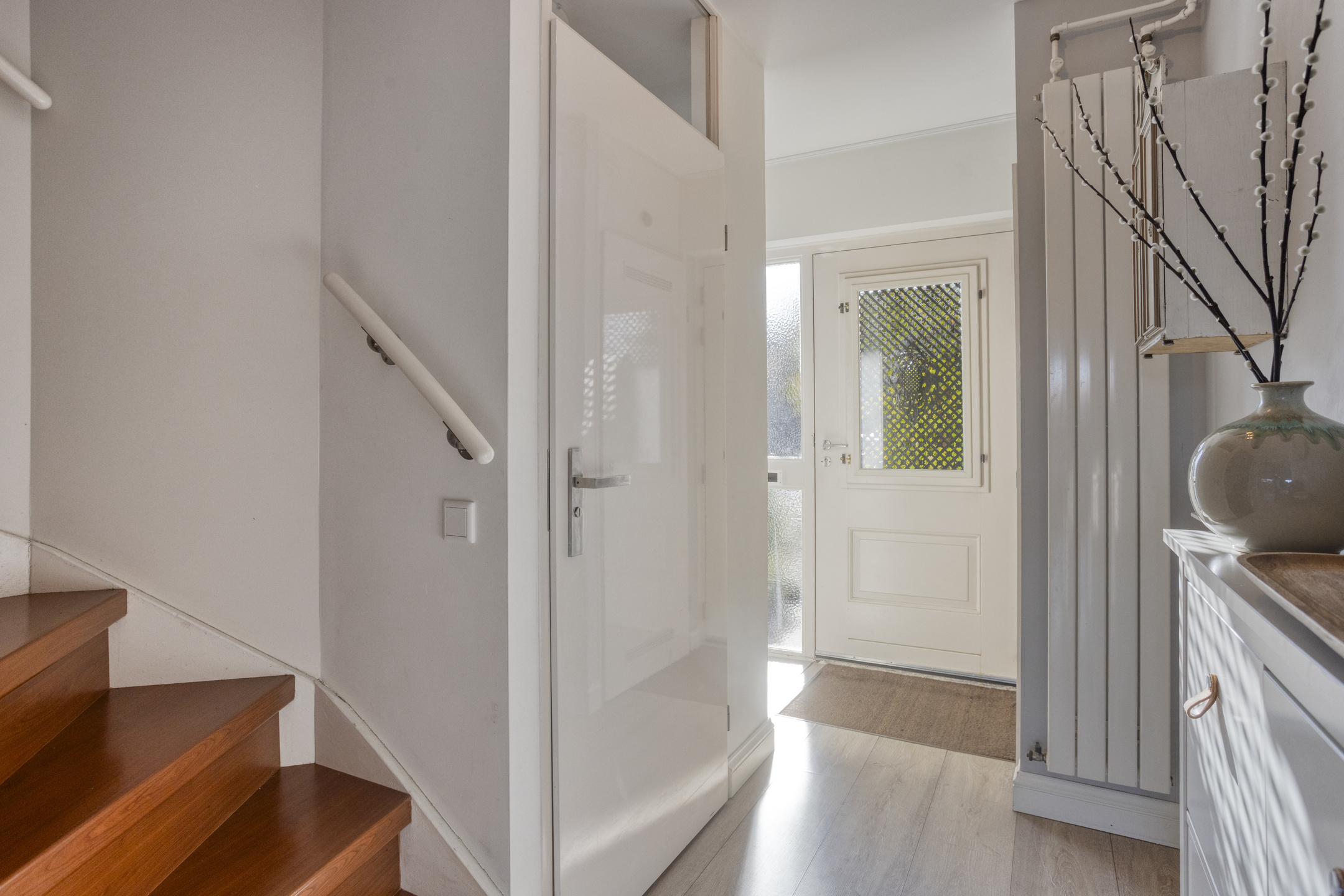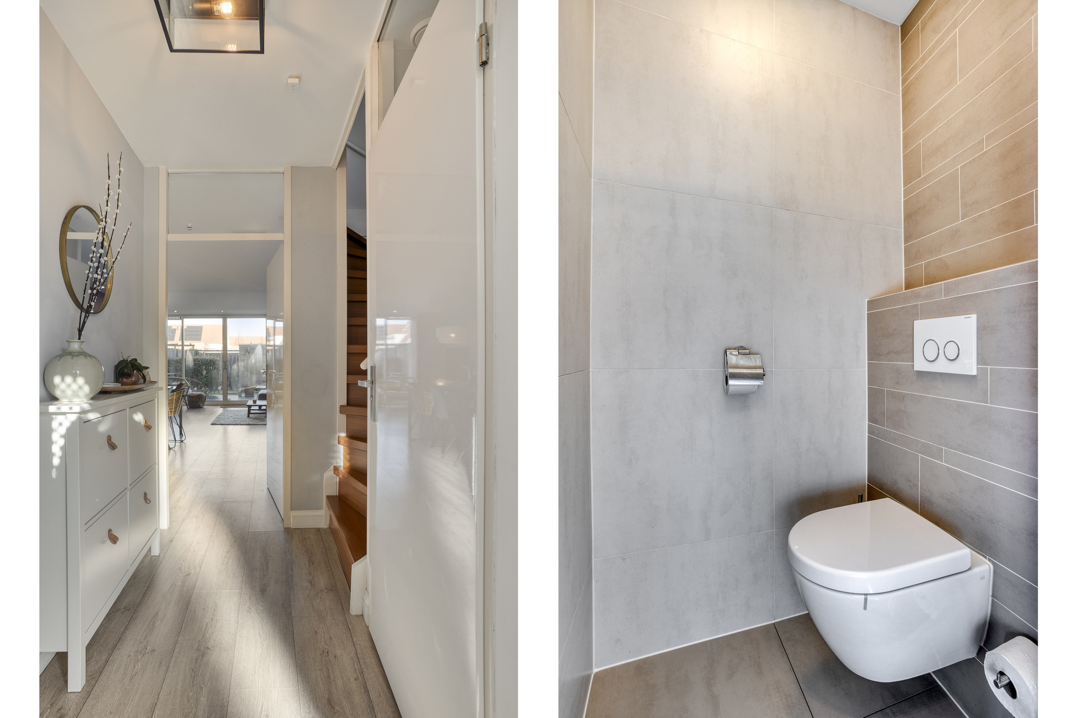 Via de speels aangelegde voortuin bereik je de entree van de woning. De hal is strak afgewerkt en voorzien van een laminaatvloer met vloerverwarming die doorloopt over de gehele begane grond. Hier bevinden zich de vernieuwde meterkast, de volledig betegelde toiletruimte met zwevend toilet en de trap naar de eerste verdieping, afgewerkt met hout door Upstairs.