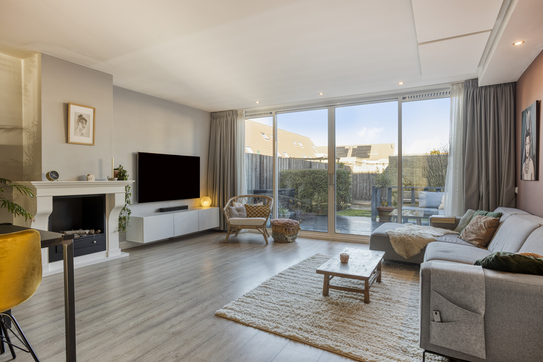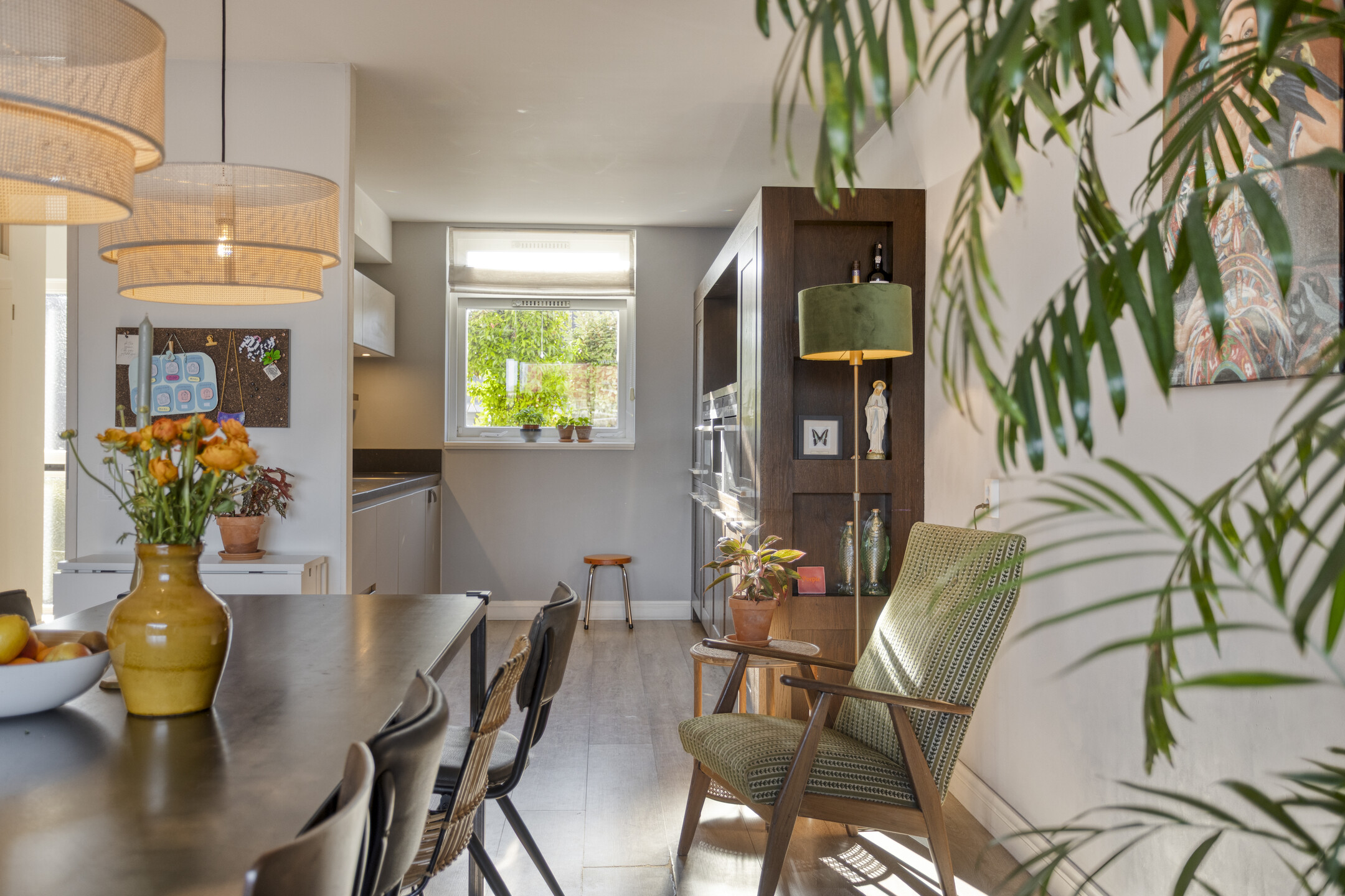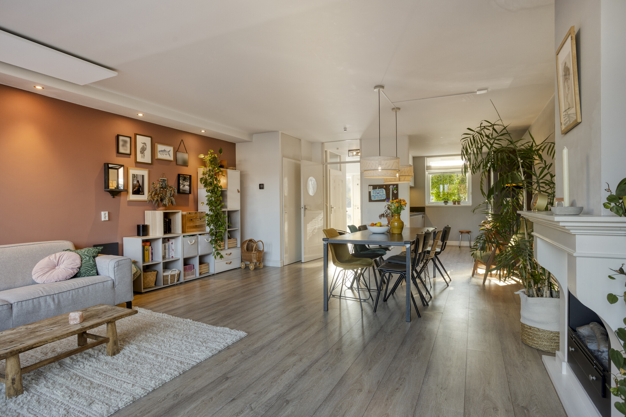 De woonkamer is uitgebouwd met 3 meter en voelt licht en ruim aan. De grote schuifpui zorgt voor veel daglicht en geeft direct toegang tot de achtertuin. Verder vind je hier een trapkast, een schouw met sierhaard, een koof met inbouwspots en strak gestucte wanden en plafonds.