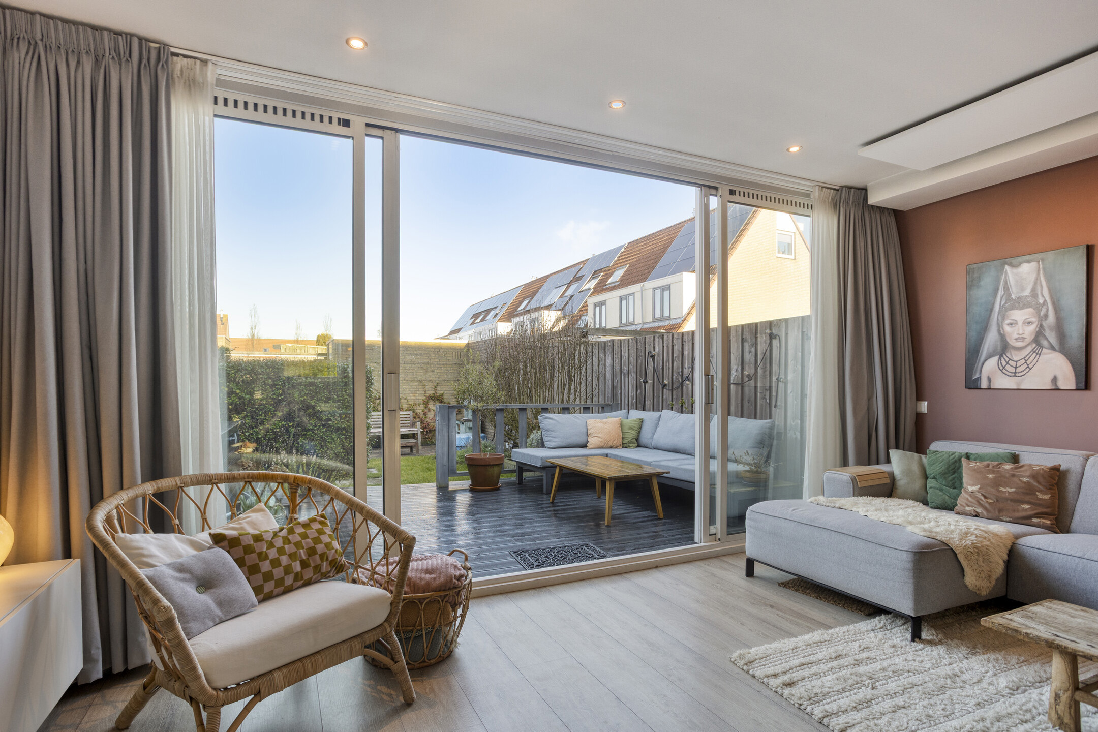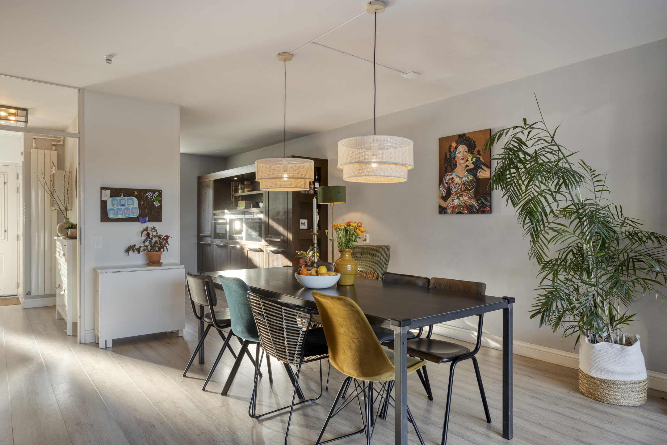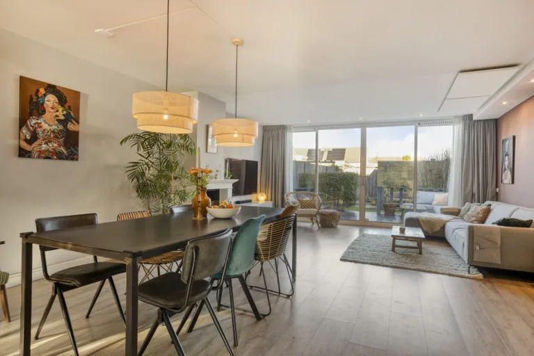 De woonkamer is uitgebouwd met 3 meter en voelt licht en ruim aan. De grote schuifpui zorgt voor veel daglicht en geeft direct toegang tot de achtertuin. Verder vind je hier een trapkast, een schouw met sierhaard, een koof met inbouwspots en strak gestucte wanden en plafonds.