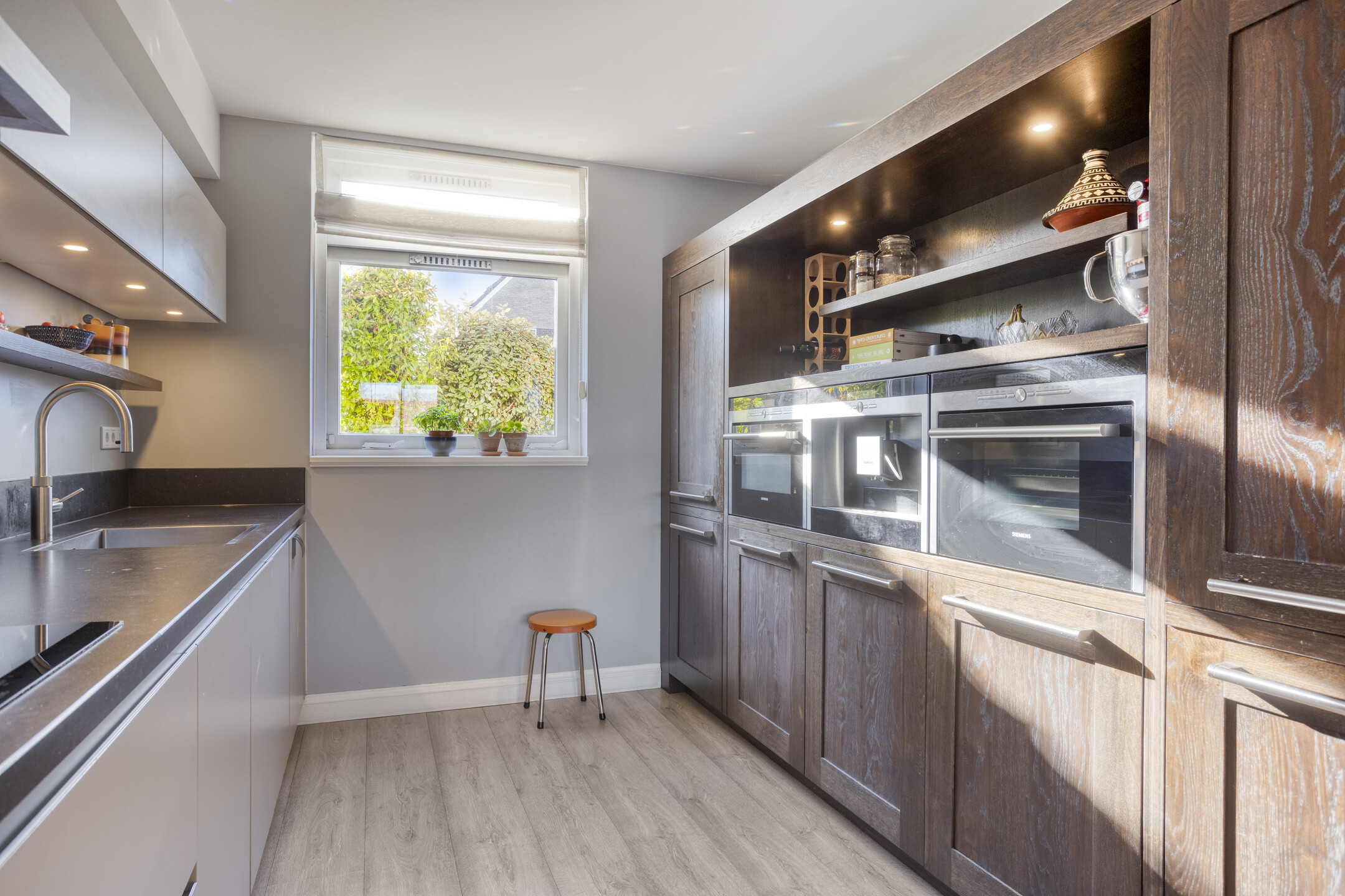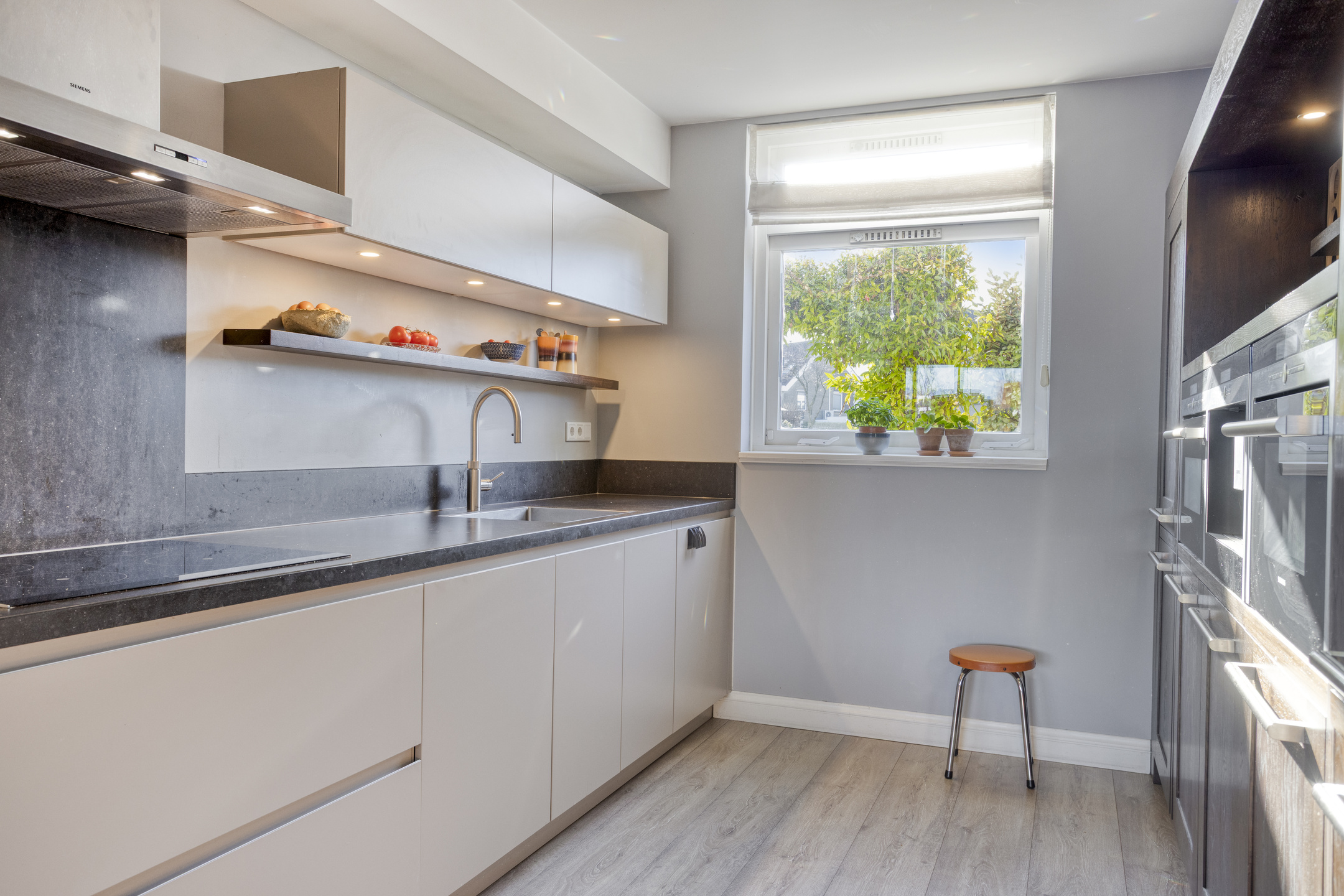 De open keuken sluit naadloos aan op de woonkamer. Het rechte werkblad is uitgevoerd in composiet en voorzien van een 4-pits inductiekookplaat, afzuigkap en een Quooker. Aan de andere zijde staan massief eikenhouten hoge kasten van Woodcreations met inbouwspots en diverse Siemens inbouwapparatuur, waaronder een koelkast, vriezer, combi oven/magnetron, oven met stoomfunctie en een ingebouwd koffiezetapparaat. Ook hier is de afwerking strak en verzorgd.