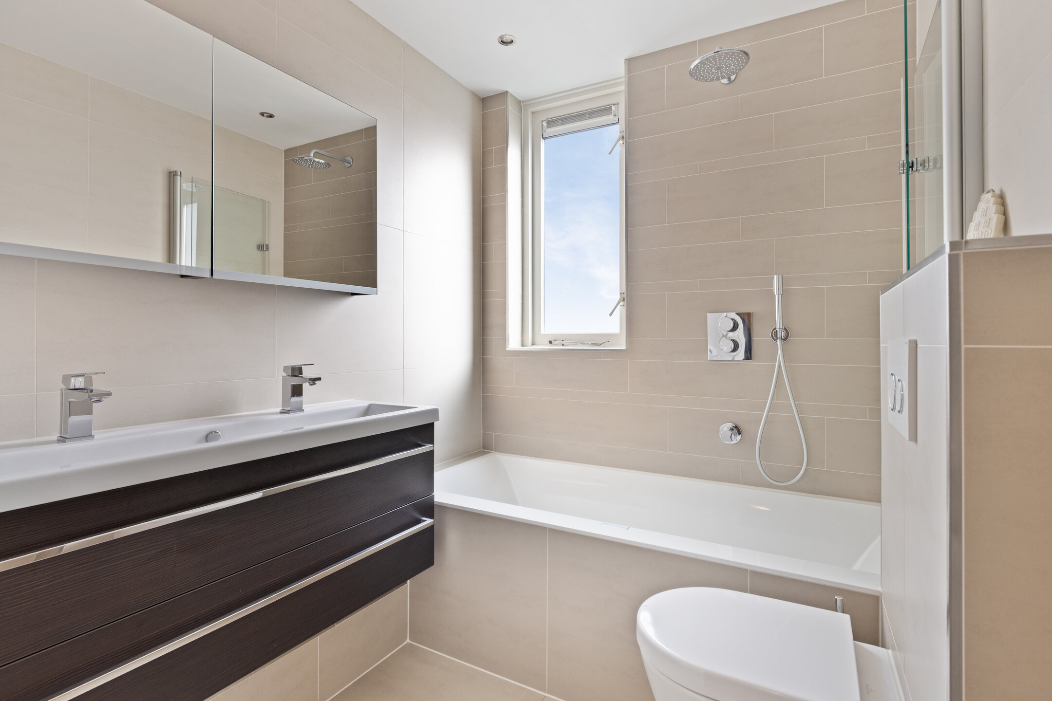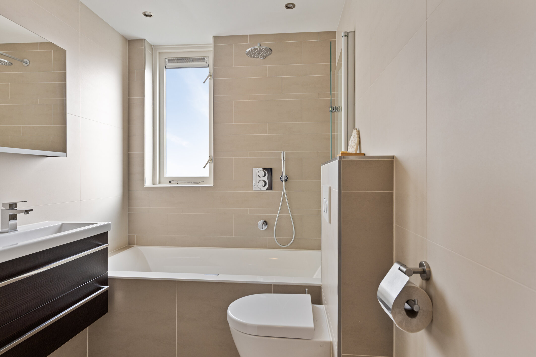 De moderne badkamer is volledig betegeld en ingericht met een wastafelmeubel met dubbele wastafel, een zwevend toilet en een ligbad met regendouche, handdouche en vouwscherm. Daarnaast is er vloerverwarming, mechanische ventilatie en een verlaagd plafond met inbouwspots.