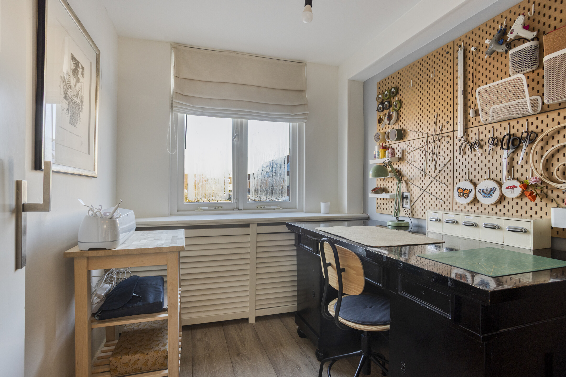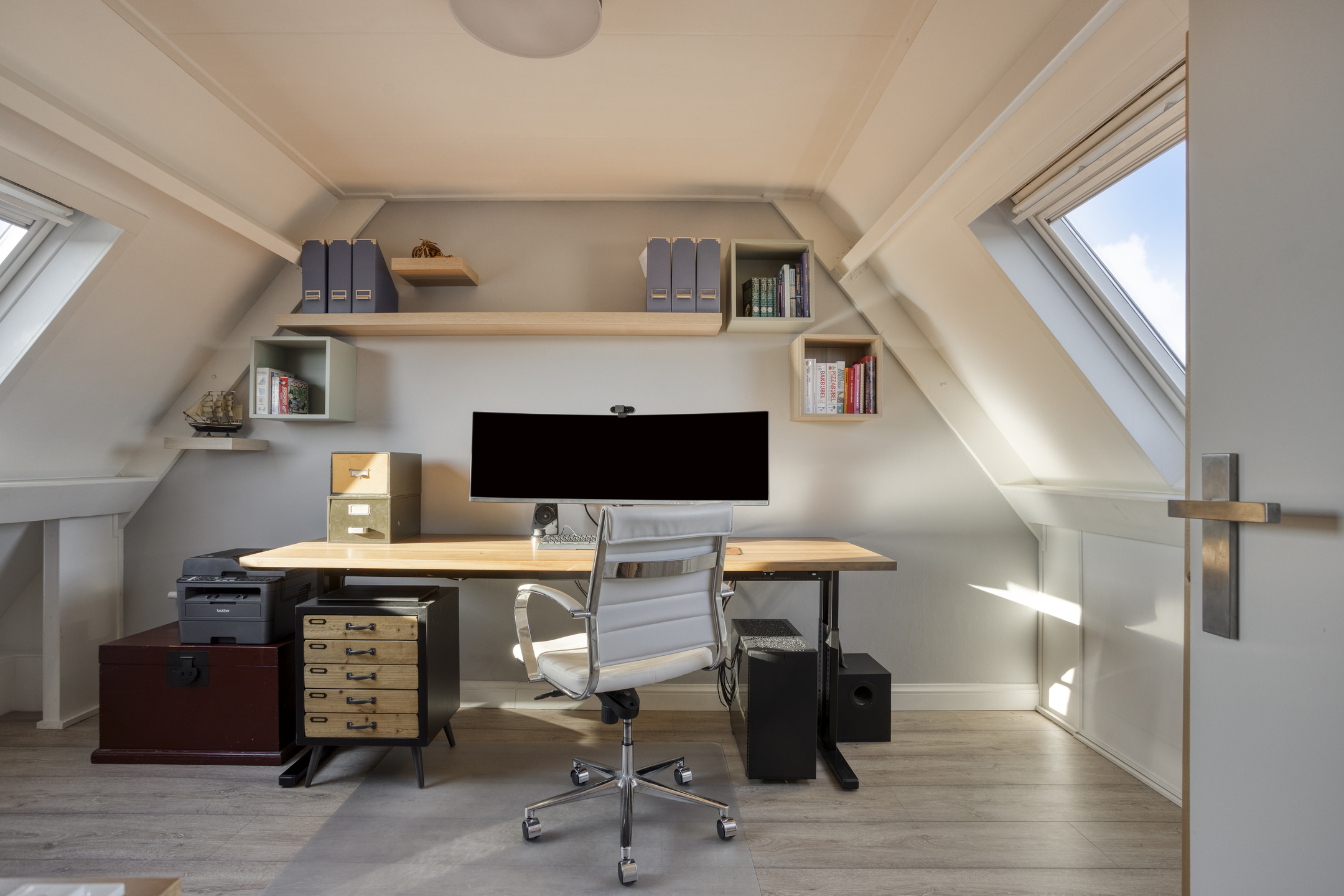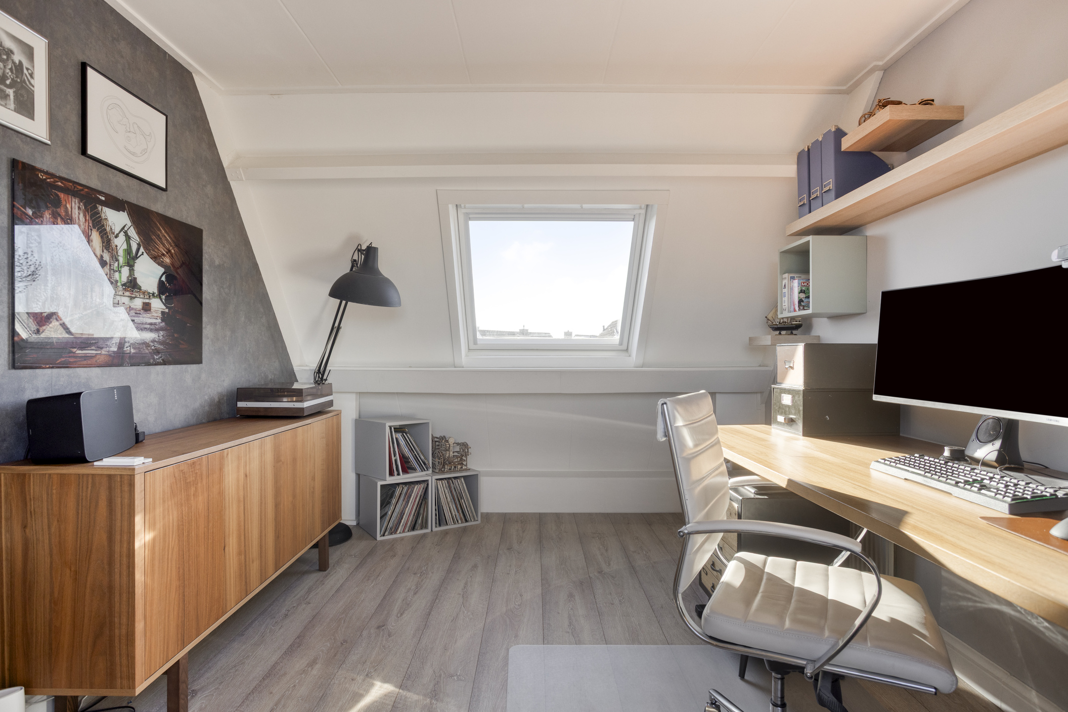 De vierde slaapkamer is ruim en voorzien van twee Velux dakramen met zonwering, knieschotten en een laminaatvloer. Dit is een fijne plek als hoofdslaapkamer, werkruimte of hobbykamer.