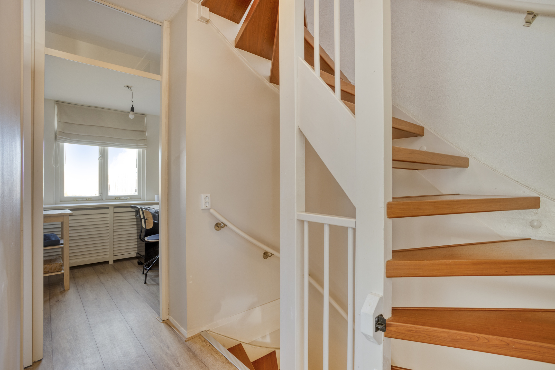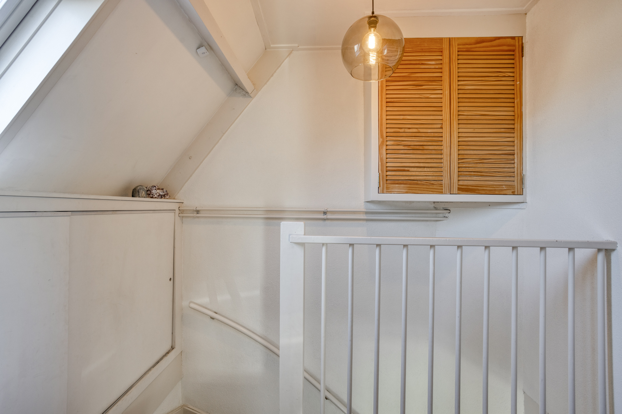 Op de overloop vind je een Velux dakraam met zonwering, bergruimte en een praktische kast in het trapgat. Hier is ook de aparte wasruimte met wasmachine- en drogeraansluiting en de opstelling van de cv-ketel (geplaatst in 2020). Via een vlizotrap bereik je de vliering met extra bergruimte.
