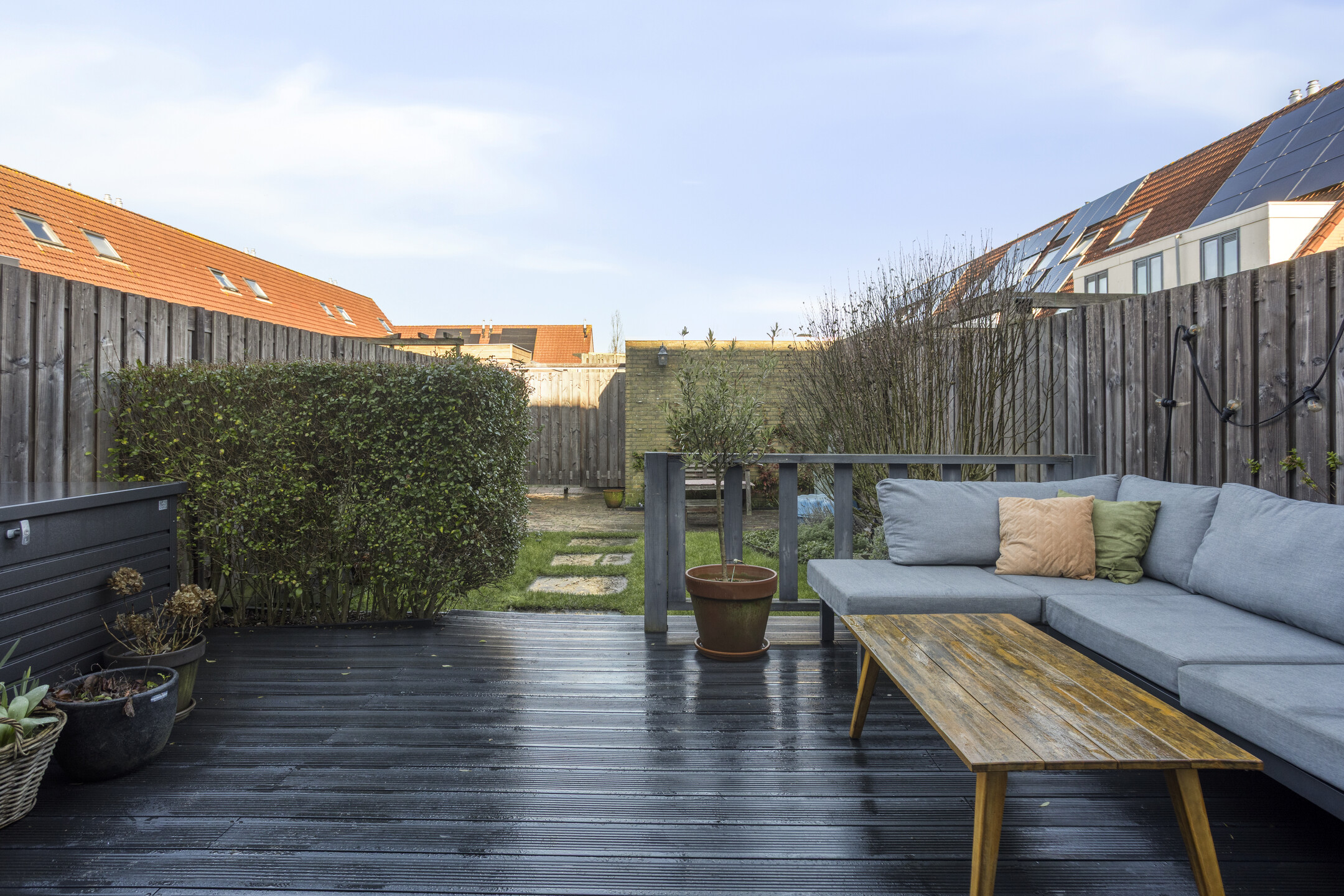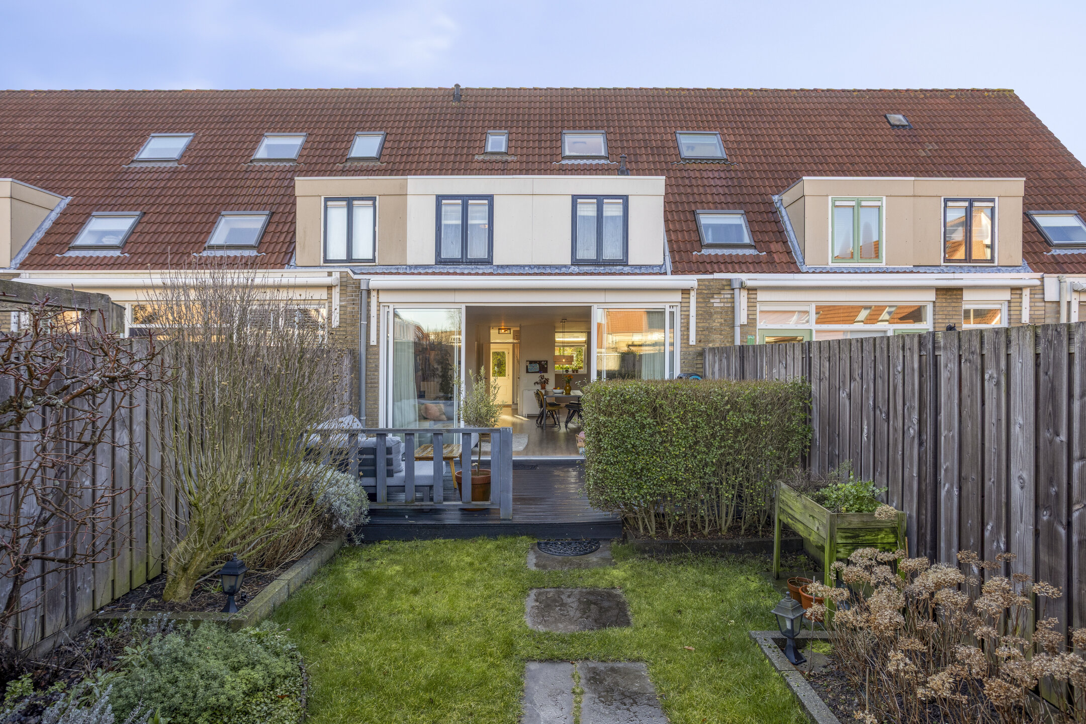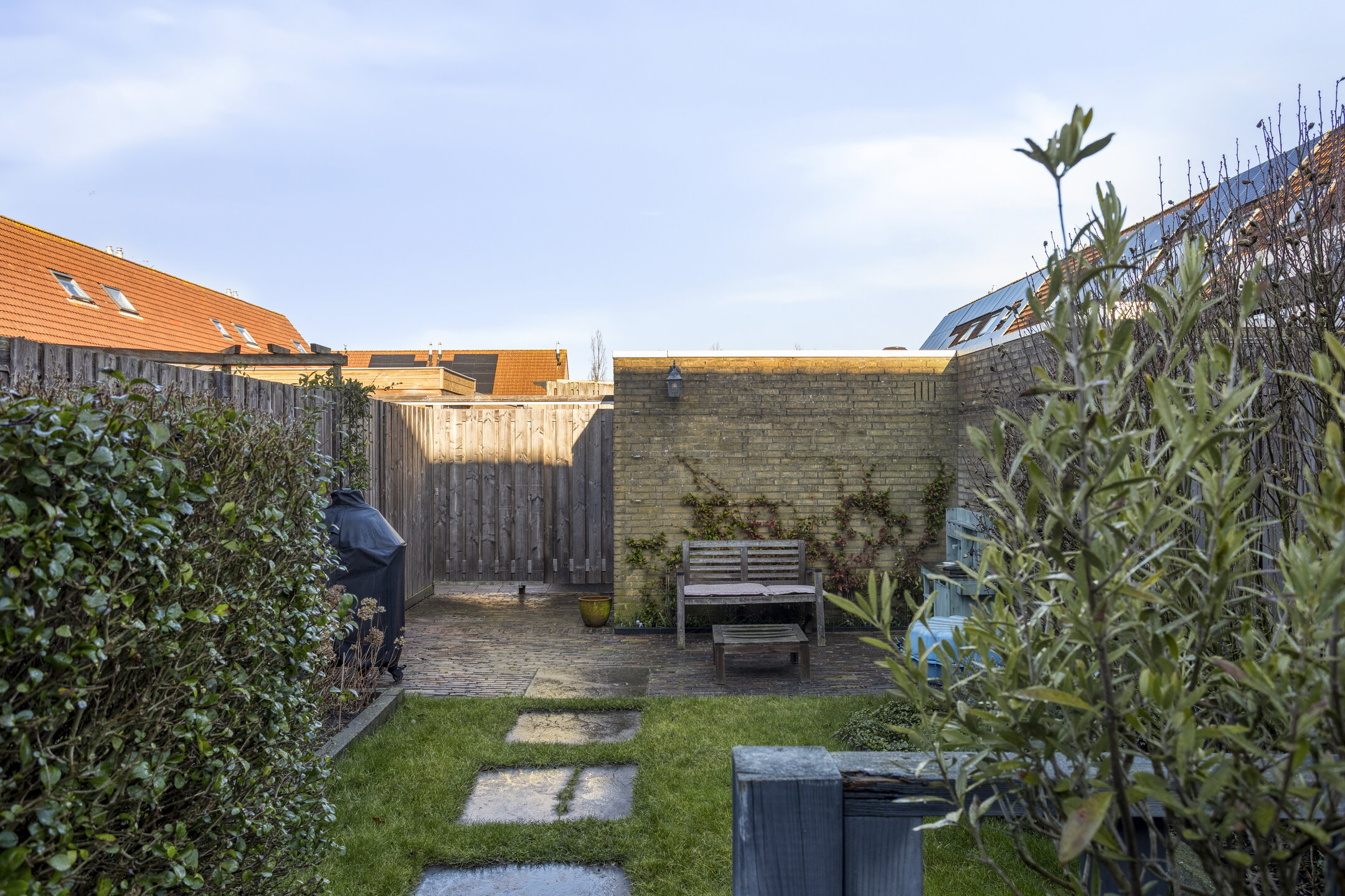 De achtertuin ligt op het noordwesten. Door de lengte van de tuin heb je in de zomer bijna de gehele dag de zon in de tuin. Door het vrije zicht achter de woning geniet je hier van veel privacy. De tuin is ingericht met een veranda met composiet vlonderplanken, een haag en een lager gelegen deel met gras, staptegels en klinkerbestrating.