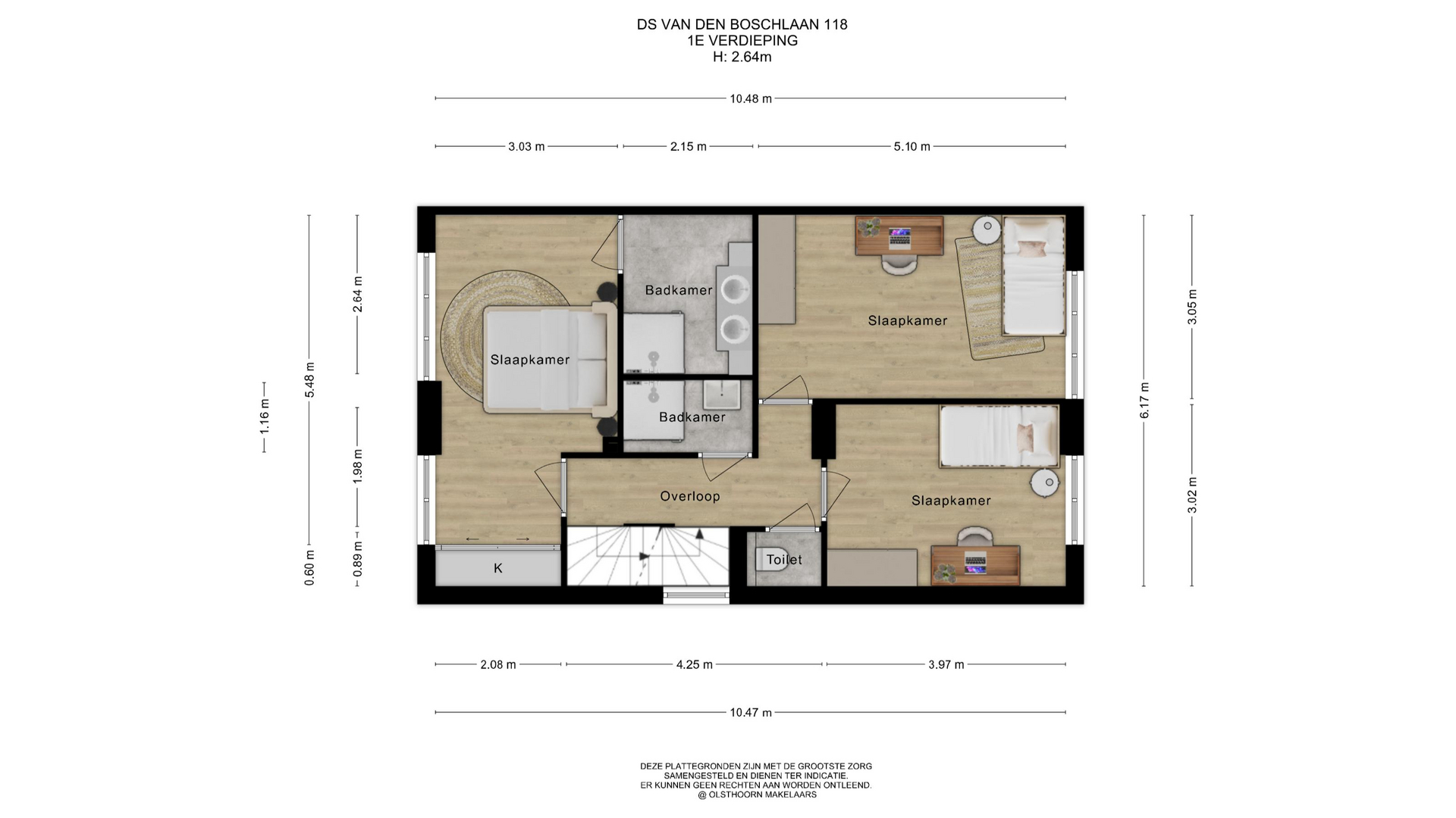 De ruime overloop krijgt extra daglicht via het zijraam. Op deze verdieping bevinden zich drie slaapkamers, een separaat toilet en twee badkamers. Twee slaapkamers liggen aan de achterzijde. De grootste slaapkamer bevindt zich aan de voorzijde over de volledige breedte van de woning en heeft toegang tot de eigen badkamer met groot wastafelmeubel, inloopdouche, elektrische vloerverwarming, mechanische ventilatie en radiator. De tweede badkamer is bereikbaar vanaf de overloop en voorzien van mechanische ventilatie, radiator, een inloopdouche en een wastafelmeubel.
