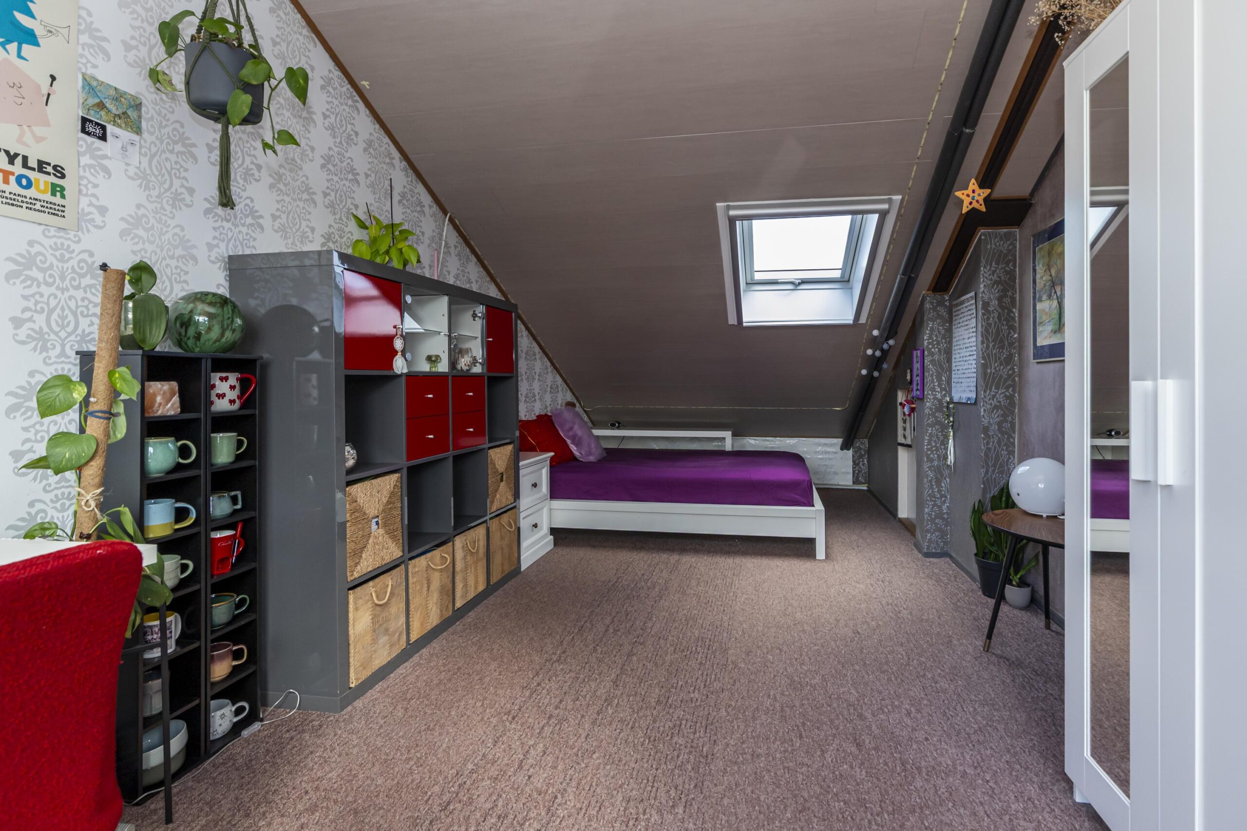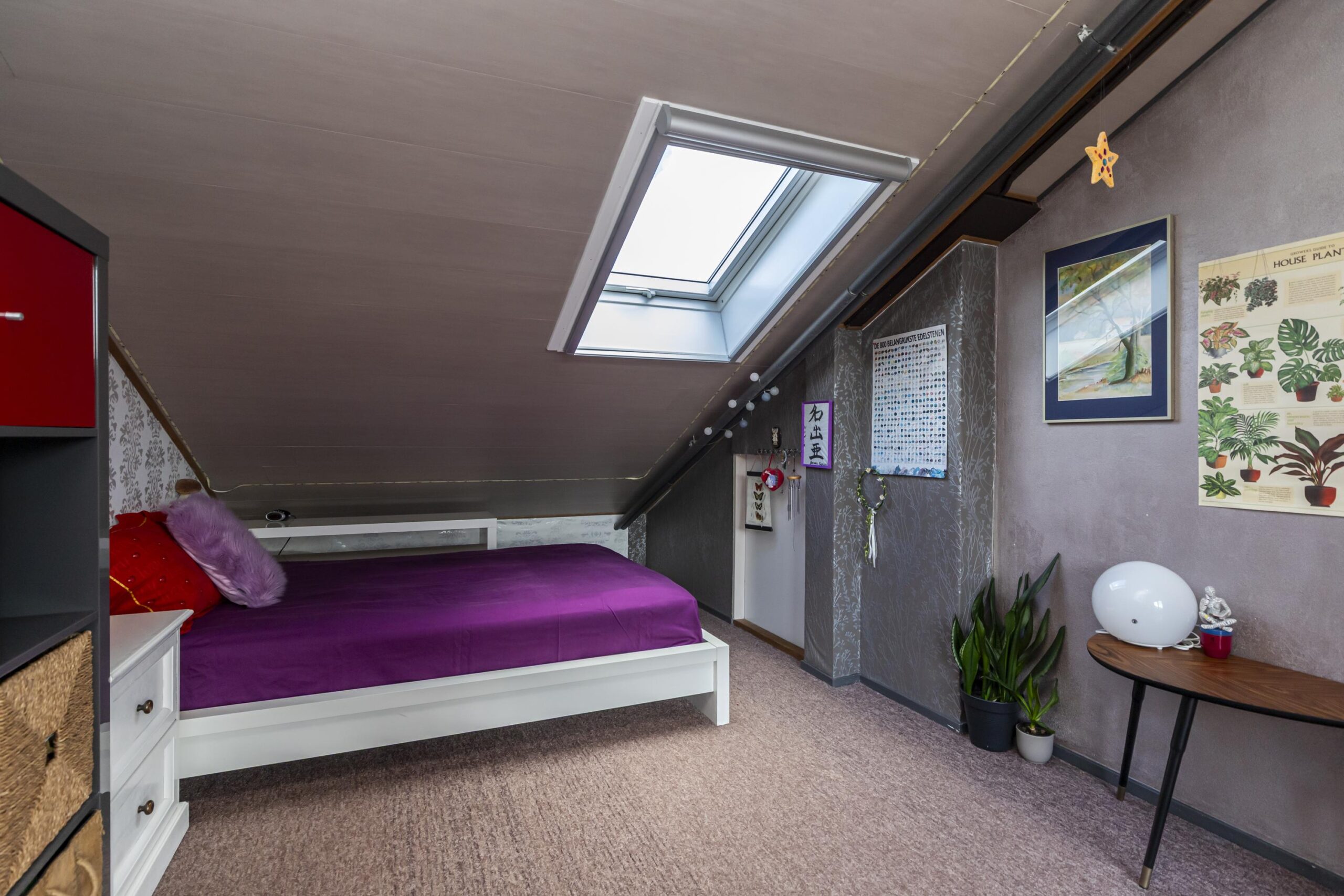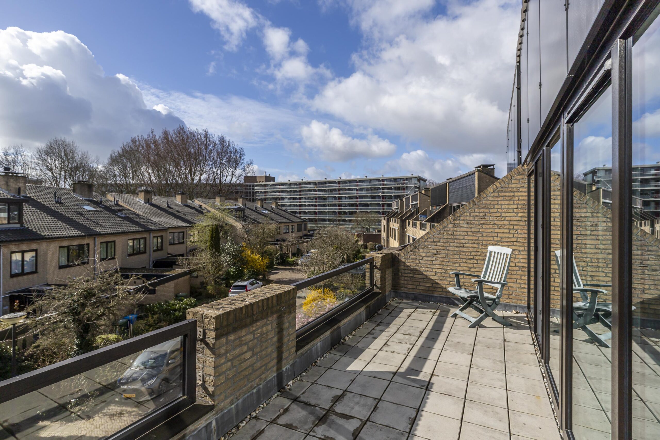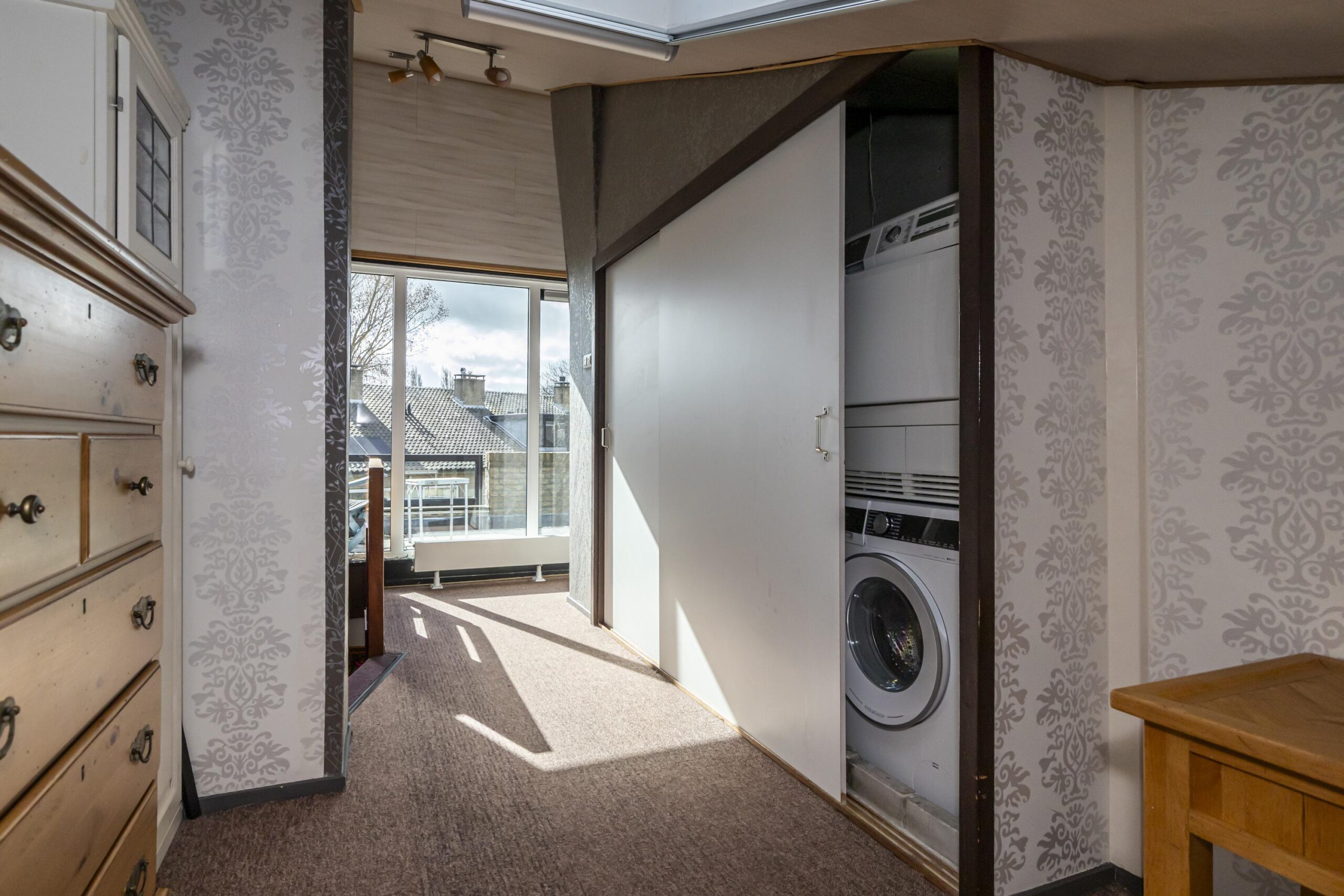 Deze verdieping voelt ruim en licht, door de grote raampartijen aan de voorkant en de twee dakramen aan de achterkant. Achter schuifdeuren bevinden zich de opstelplaatsen voor wasmachine en droger en de HR-ketel. Via een schuifdeur is er toegang tot extra opbergruimte. De vierde slaapkamer strekt zich uit over de volledige lengte van de woning en beschikt over een dakraam en een deur naar het zonnige dakterras op het zuiden. Een fijne plek om rustig buiten te zitten.