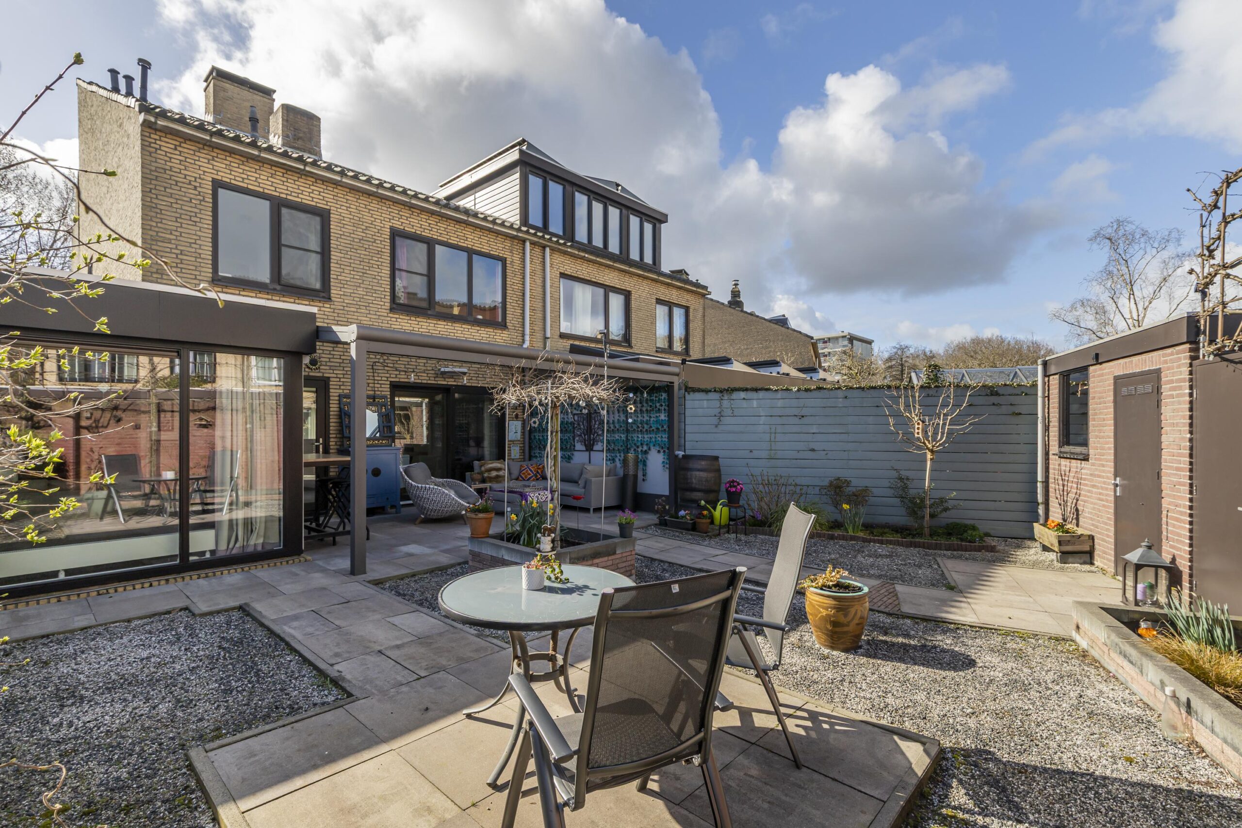 Aan de voorzijde ligt een verzorgde voortuin over de volledige breedte van de woning. Parkeren doe je op eigen terrein op de oprit, met daarnaast de inpandige garage als extra praktische ruimte. De achtertuin, met achterom, ligt op het noorden en is zeer verzorgd aangelegd over de volle breedte van de woning. Achterin staat een stenen berging met Elektra. Direct aan de woning is een overkapping geplaatst met verlichting en met handmatige zonwering en elektra, handig voor bijvoorbeeld een heater. Zo zit je hier ook tijdens langere avonden prettig buiten of juist beschut op warme dagen. Als extra pluspunt is er een zonnig dakterras op het zuiden op de tweede verdieping.