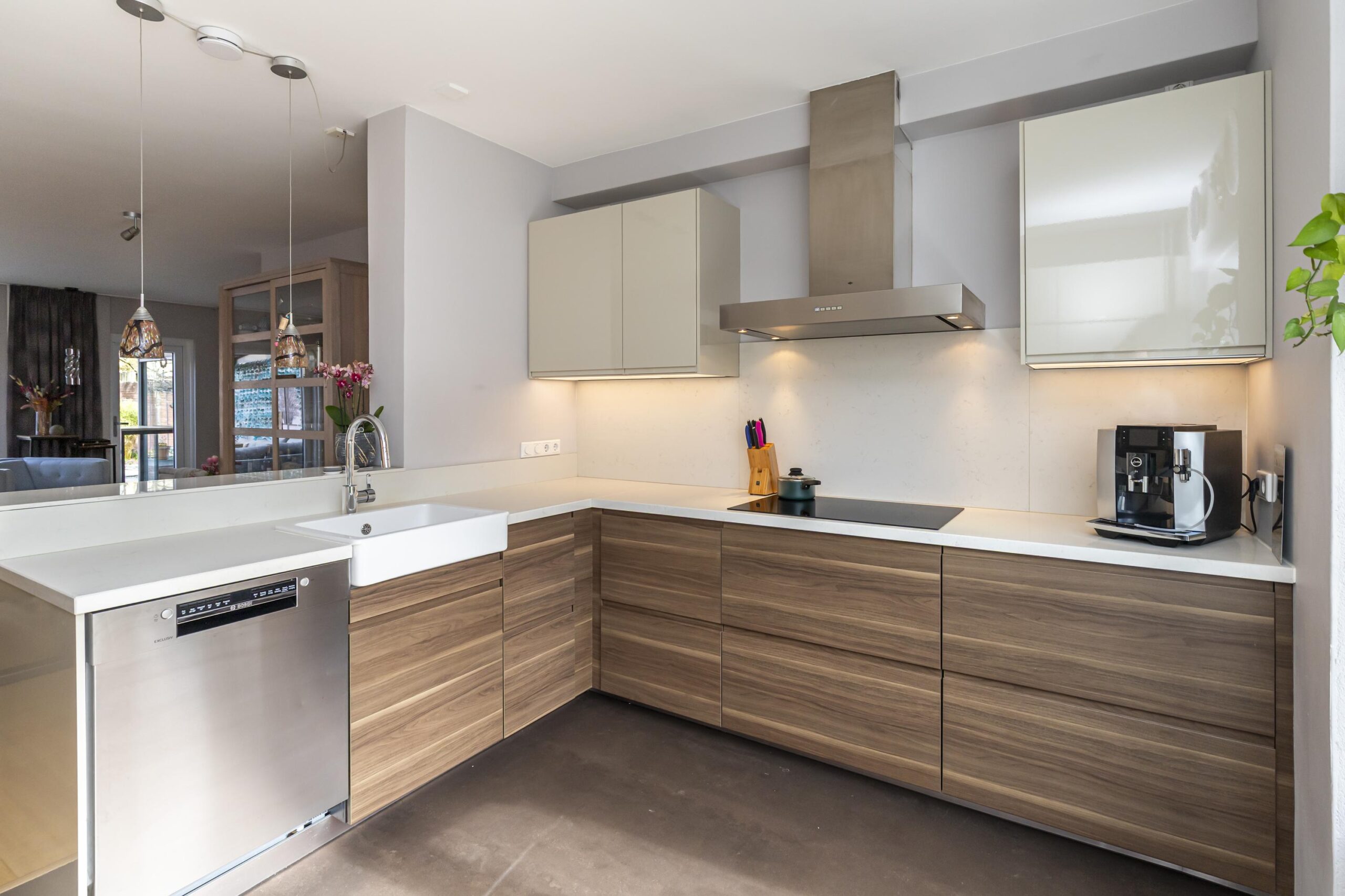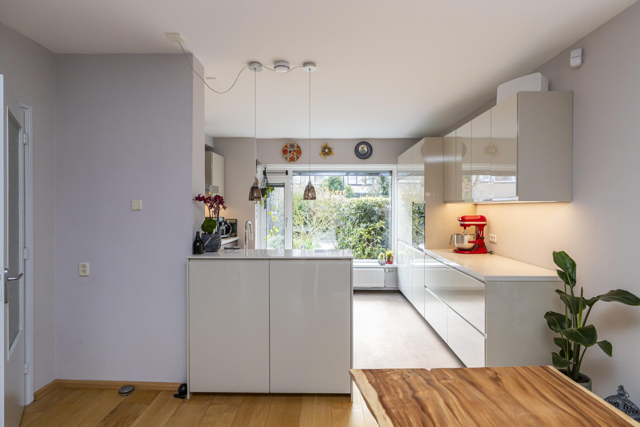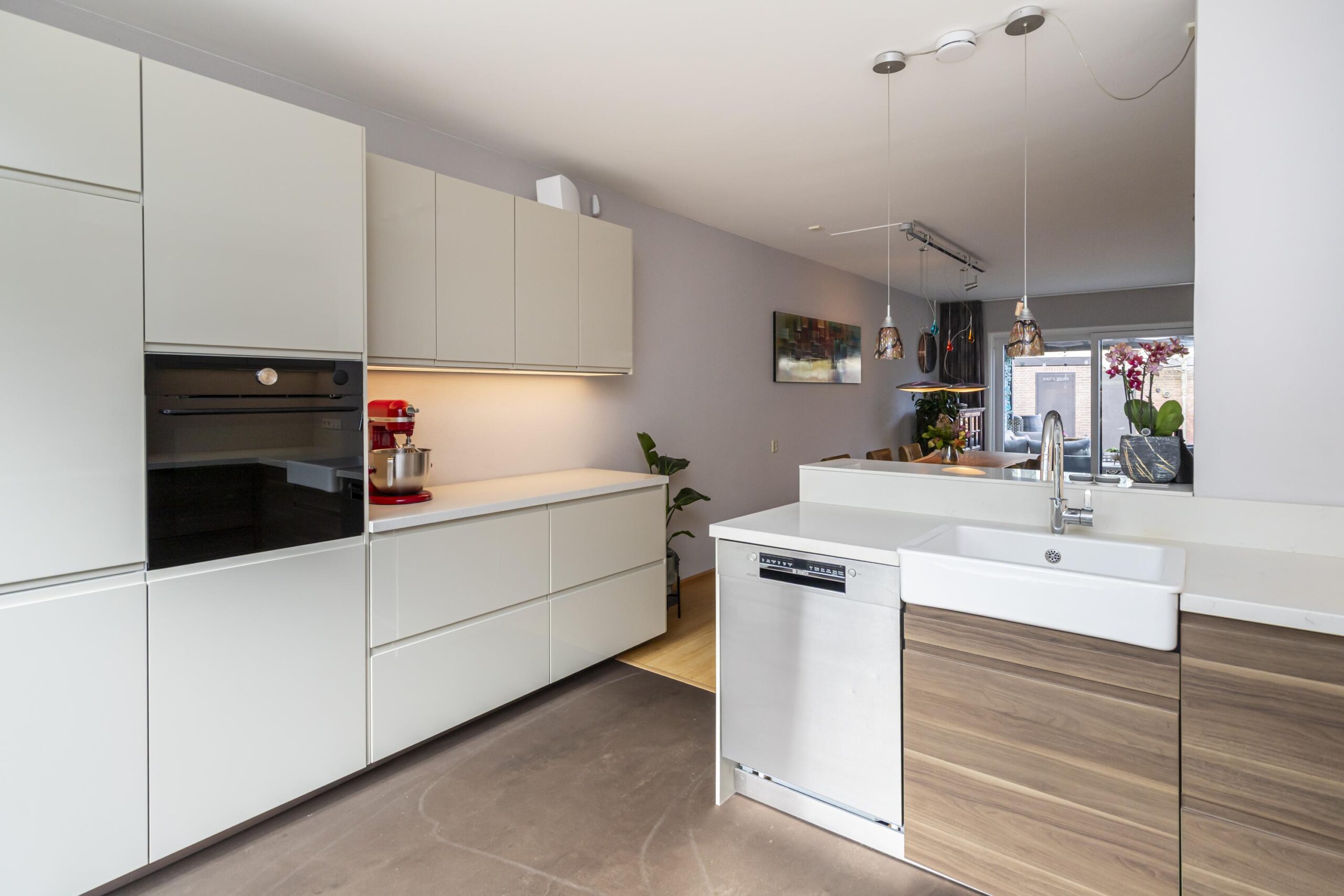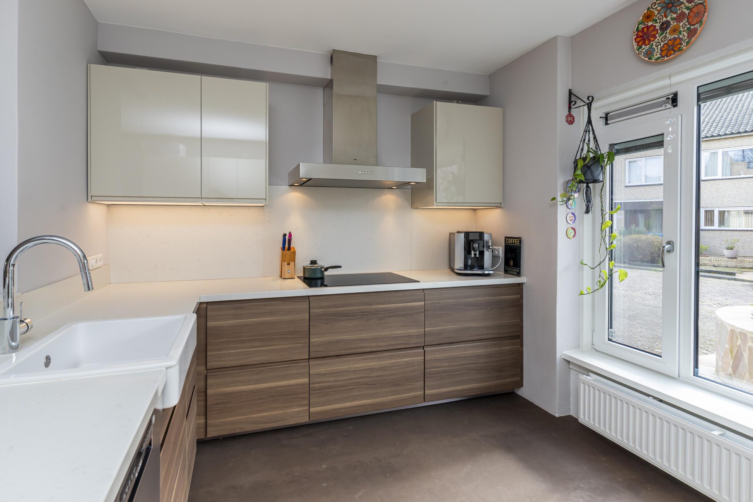 Je komt thuis op je eigen oprit, loopt via de verzorgde voortuin naar de entree en stapt dankzij de overkapping altijd droog en beschut naar binnen. In het tochtportaal bevindt zich de meterkast. Vanuit de hal heb je toegang tot het toilet met fontein, de trapopgang en de inpandige garage, waarna je doorloopt naar de lichte, uitgebouwde woon- eetkamer met zicht op de tuin. Aan de voorzijde bevindt zich de lichte keuken met een groot raam. De keuken beschikt over veel bergruimte en lades, een natuurstenen werkblad en diverse inbouwapparatuur waaronder een vaatwasser, oven met stoomfunctie, inductiekookplaat, mechanische ventilatie naar buiten en een grote koelkast. De woon-eetkamer is opvallend ruim. Door de uitbouw aan de achterzijde en de vele ramen voelt de ruimte licht en open aan. Via de schuifpui én via de deur loop je zo de tuin in, direct via de ruime overkapping.