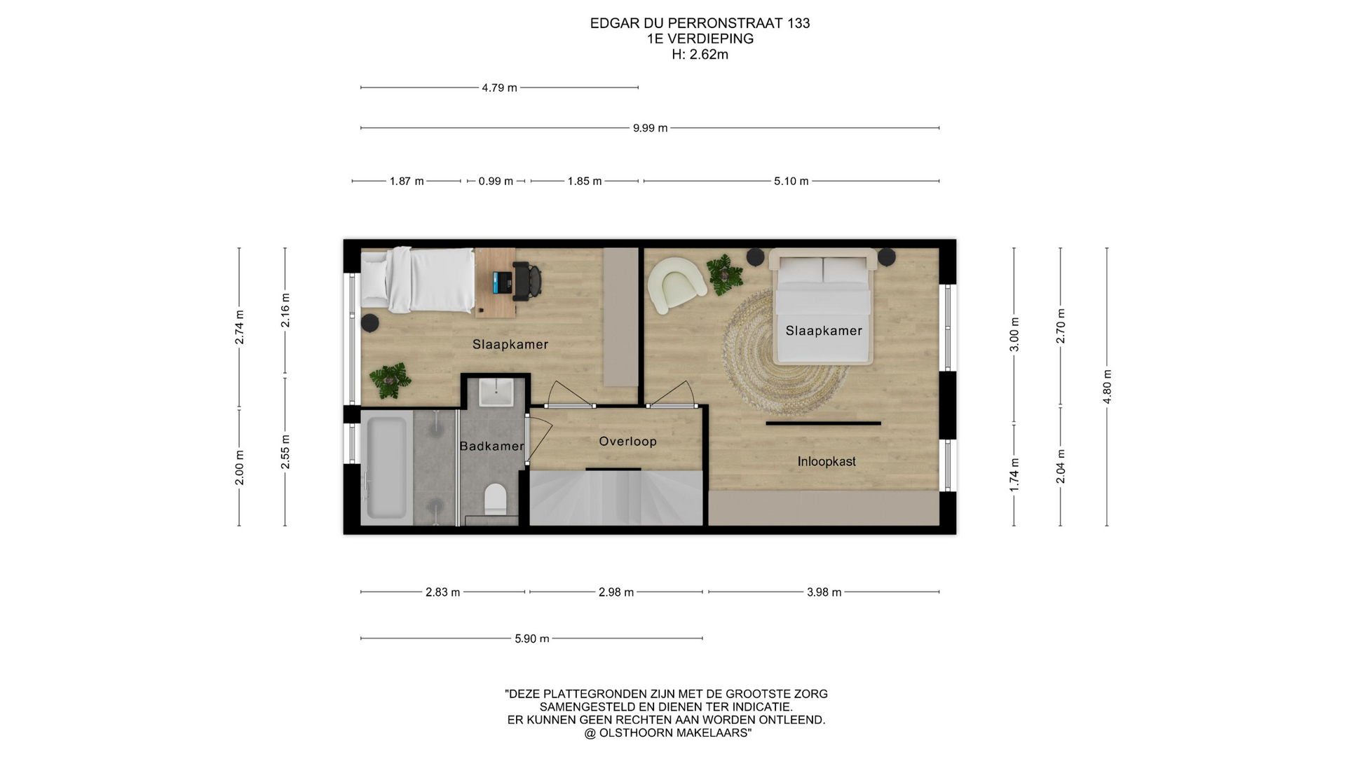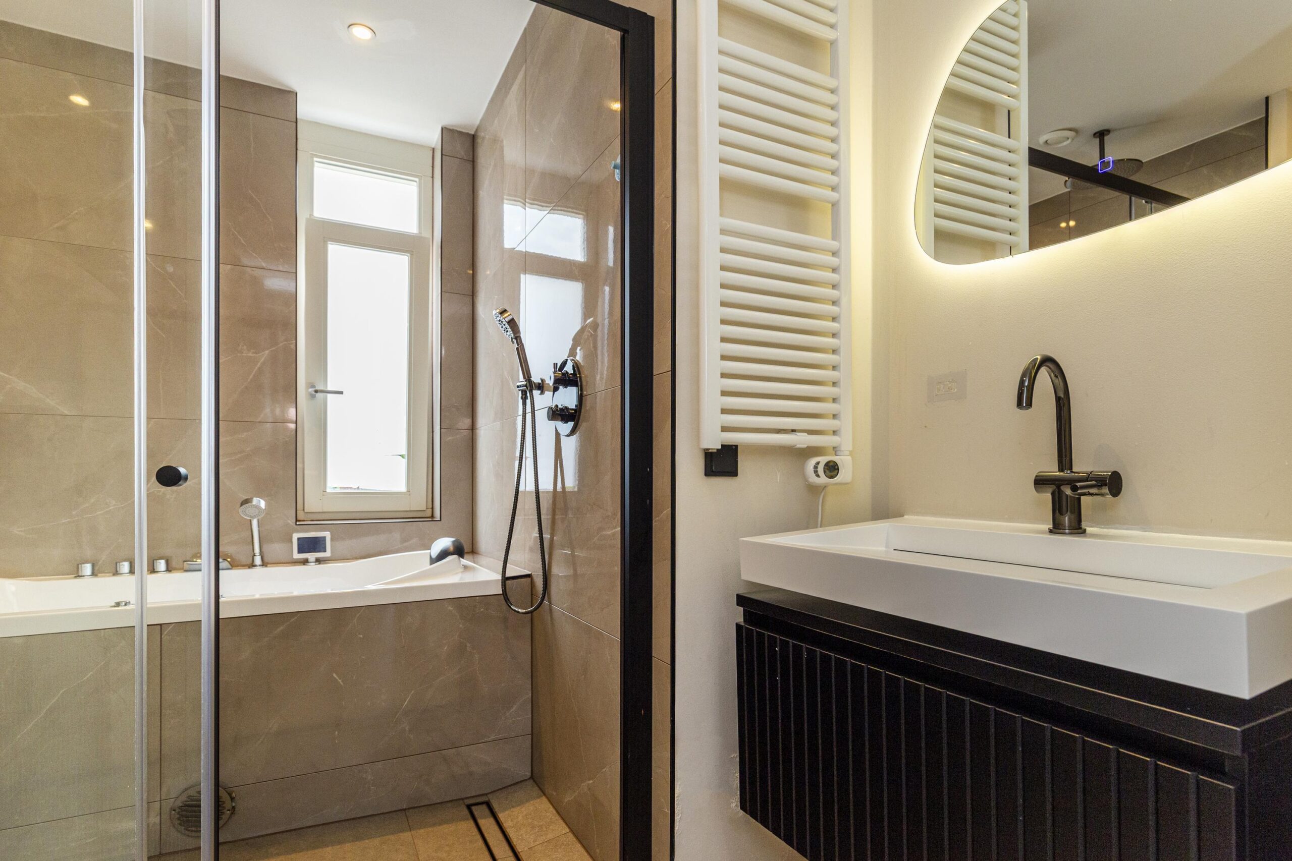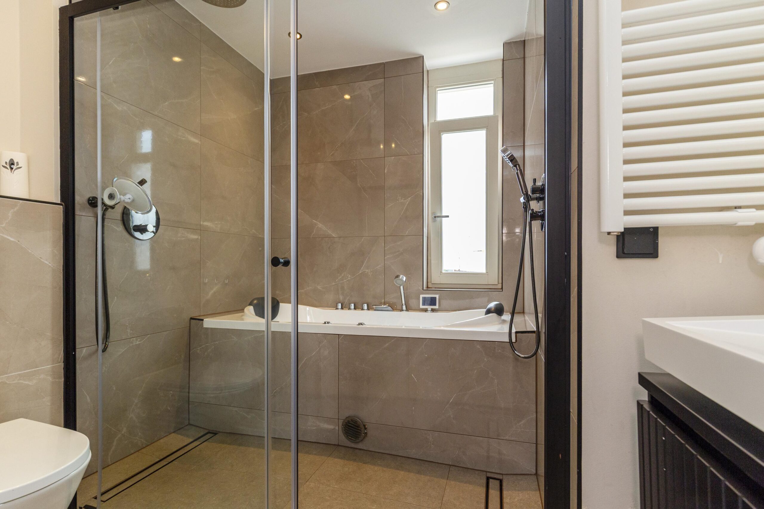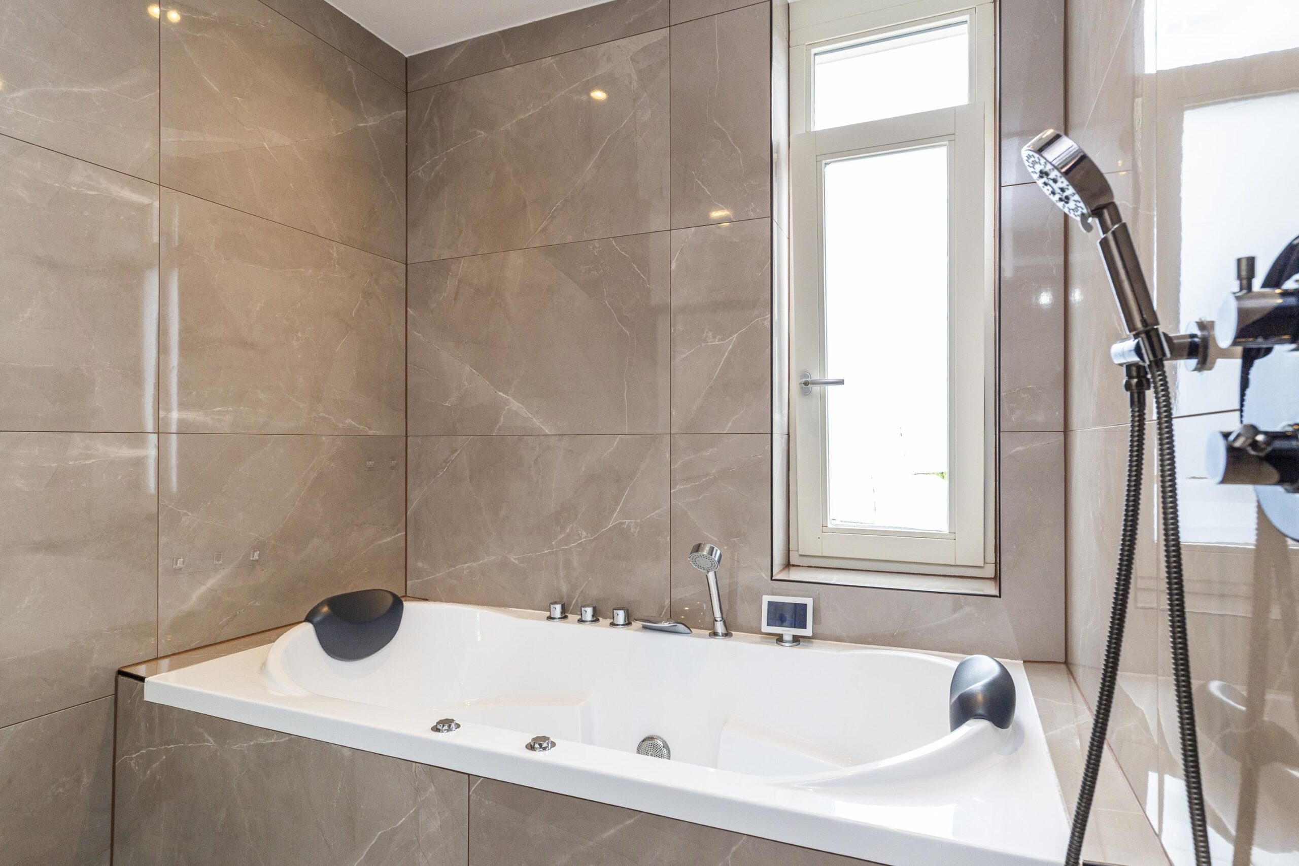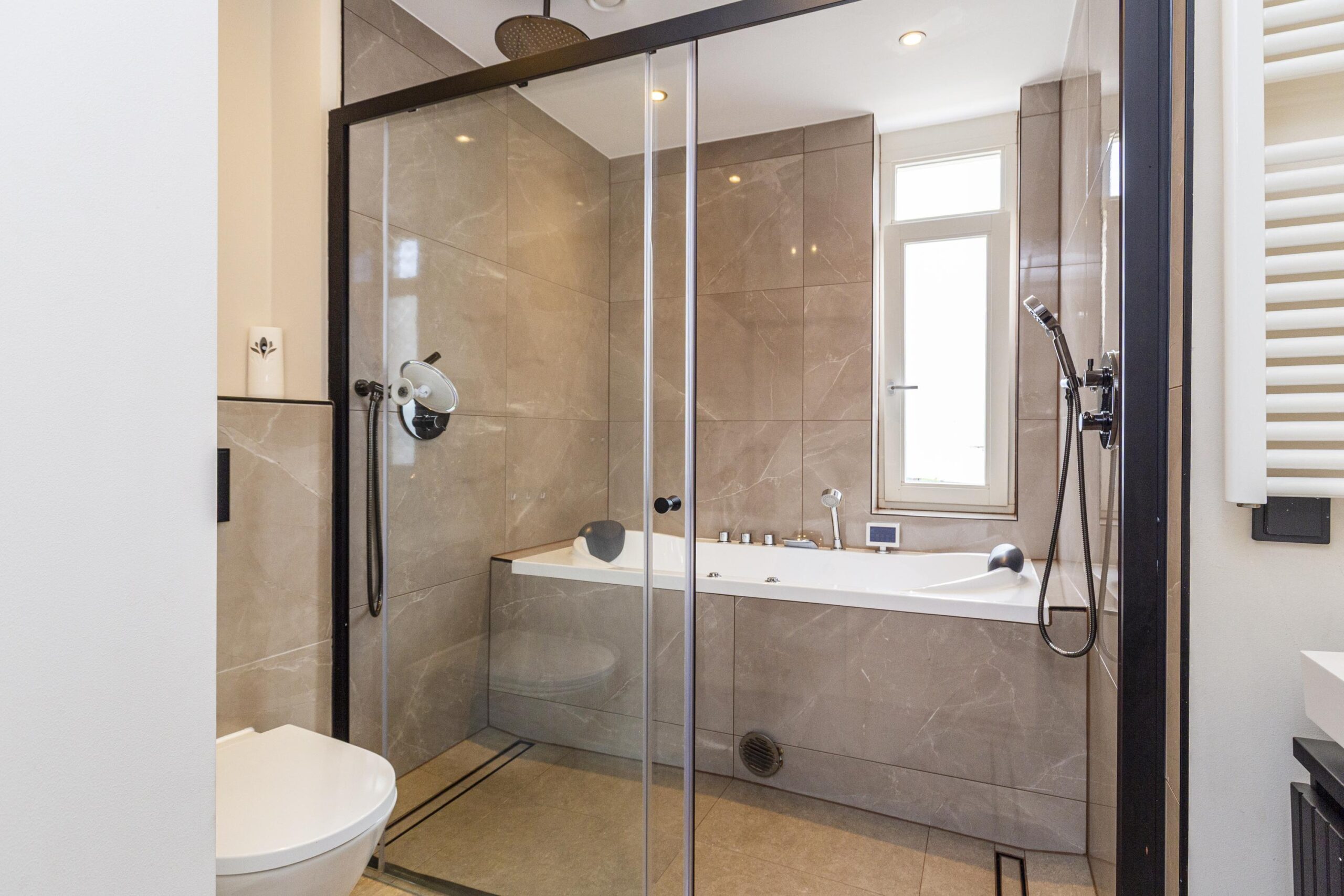 • Een royale hoofdslaapkamer met inloopkast én een badkamer met jacuzzi en dubbele regendouche.