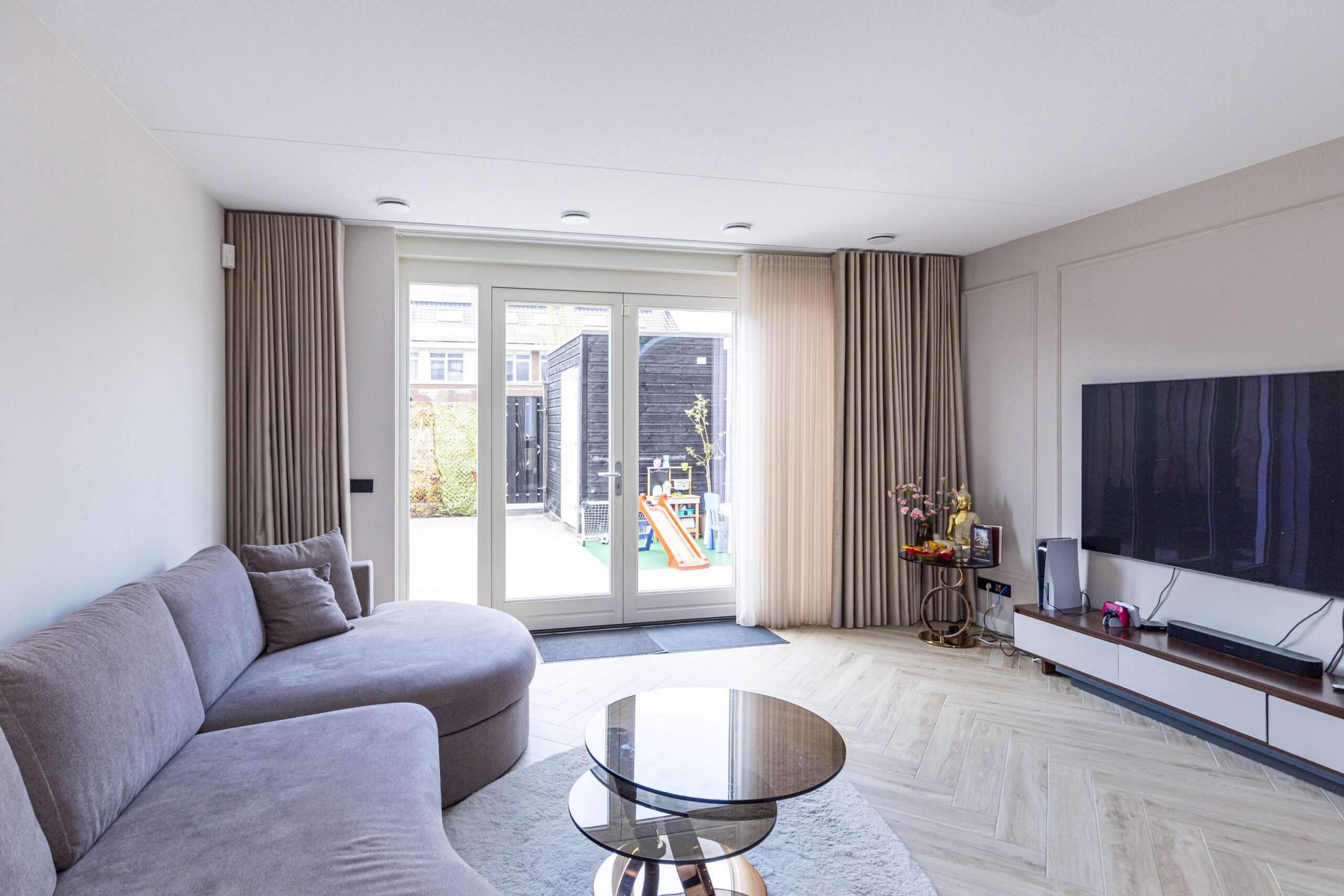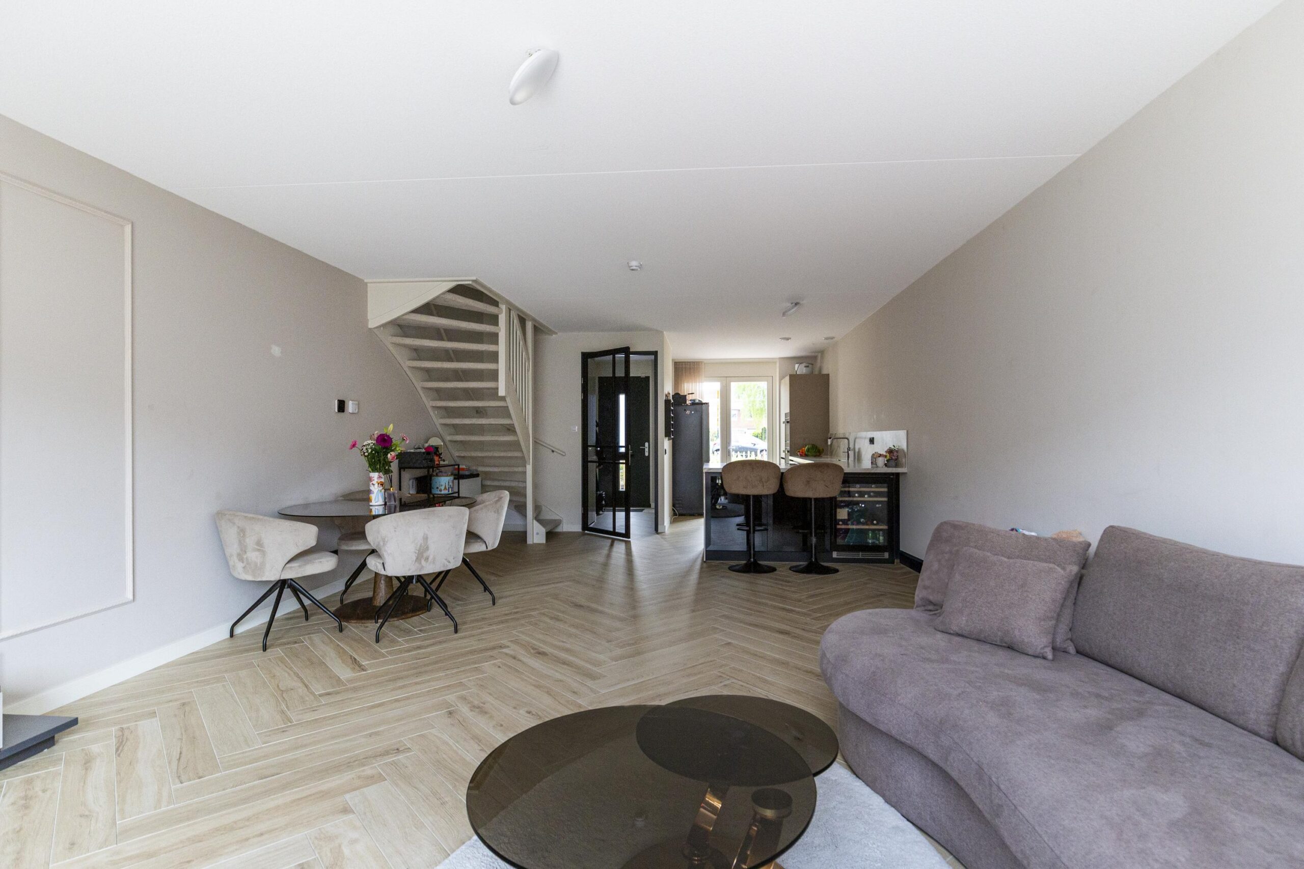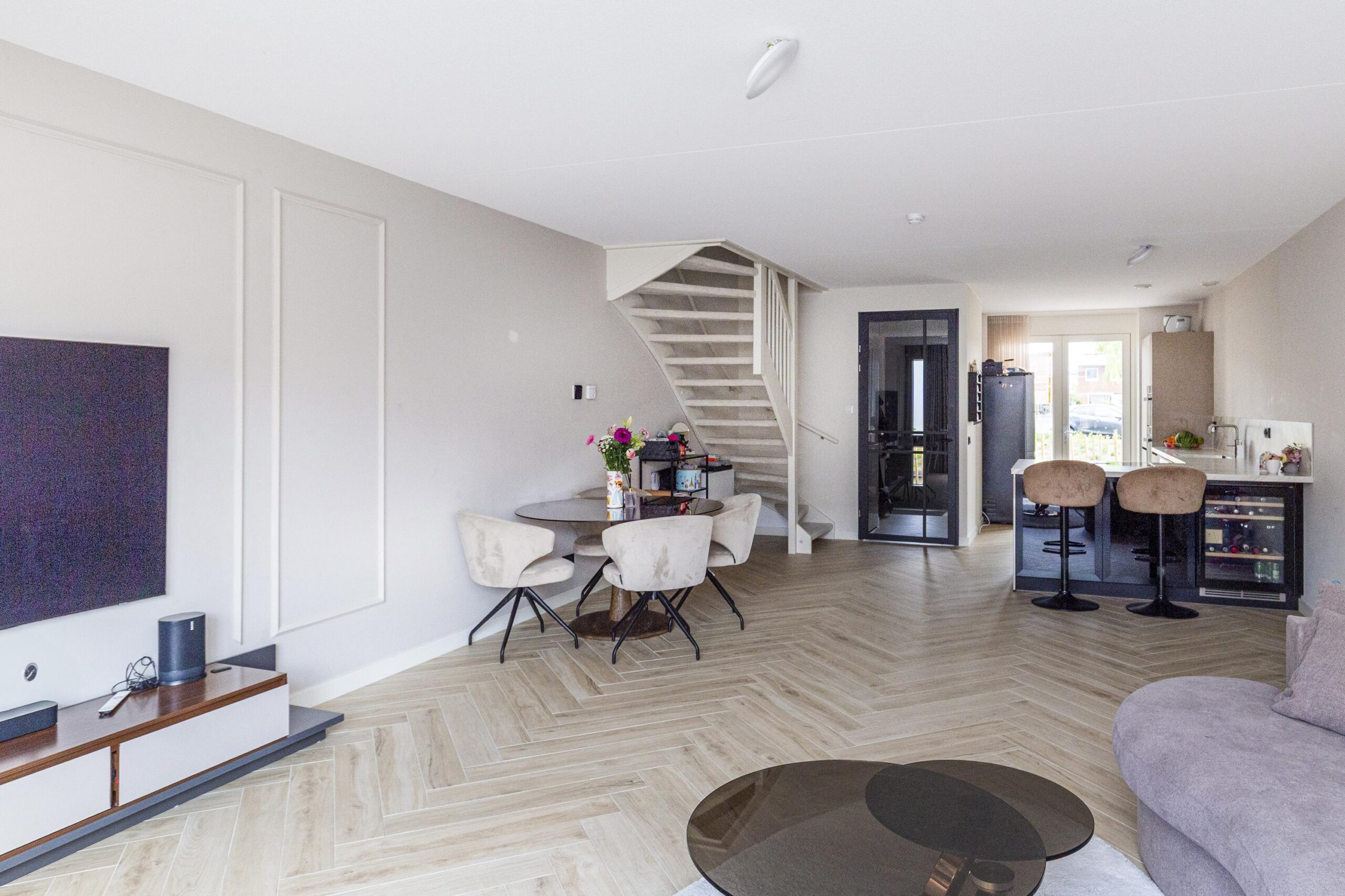 Entree met hal, meterkast en technische ruimte. De lichte woonkamer met openslaande deuren naar de tuin vormt samen met de eetkamer het hart van het huis. Aan de voorzijde vind je de luxe open keuken met bargedeelte, voorzien van hoogwaardige inbouwapparatuur: inductiekookplaat met geïntegreerde afzuiging, vaatwasser, Quooker, wijnkoelkast, oven en combi-oven. De tuin op het noordwesten is onderhoudsvriendelijk en beschikt over een houten berging, achterom én toegang tot de privéparkeerplaats.