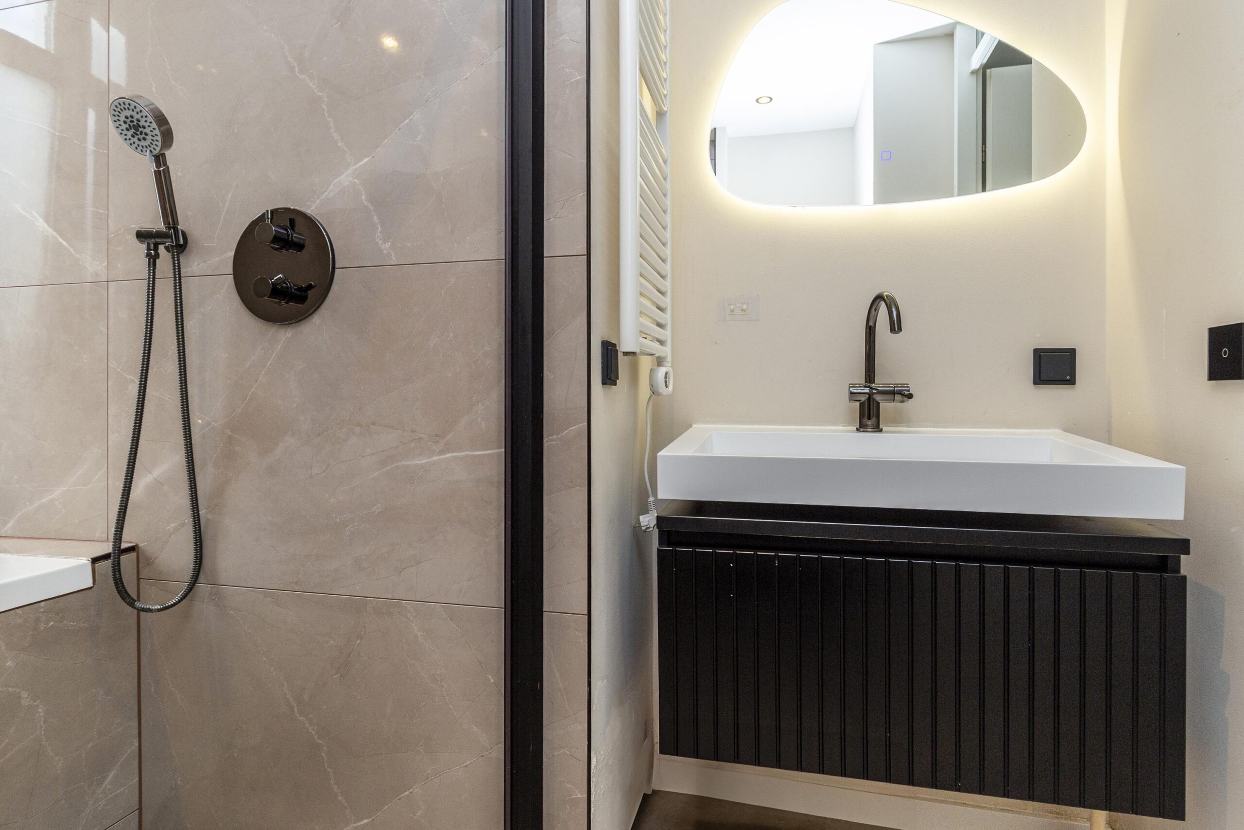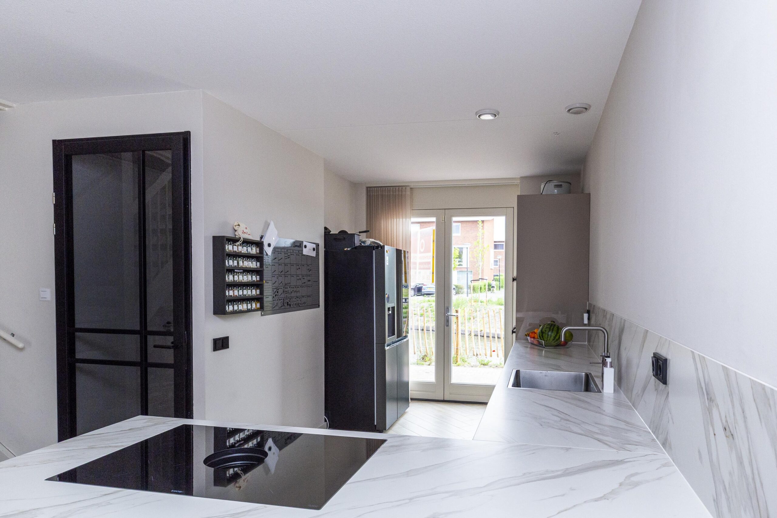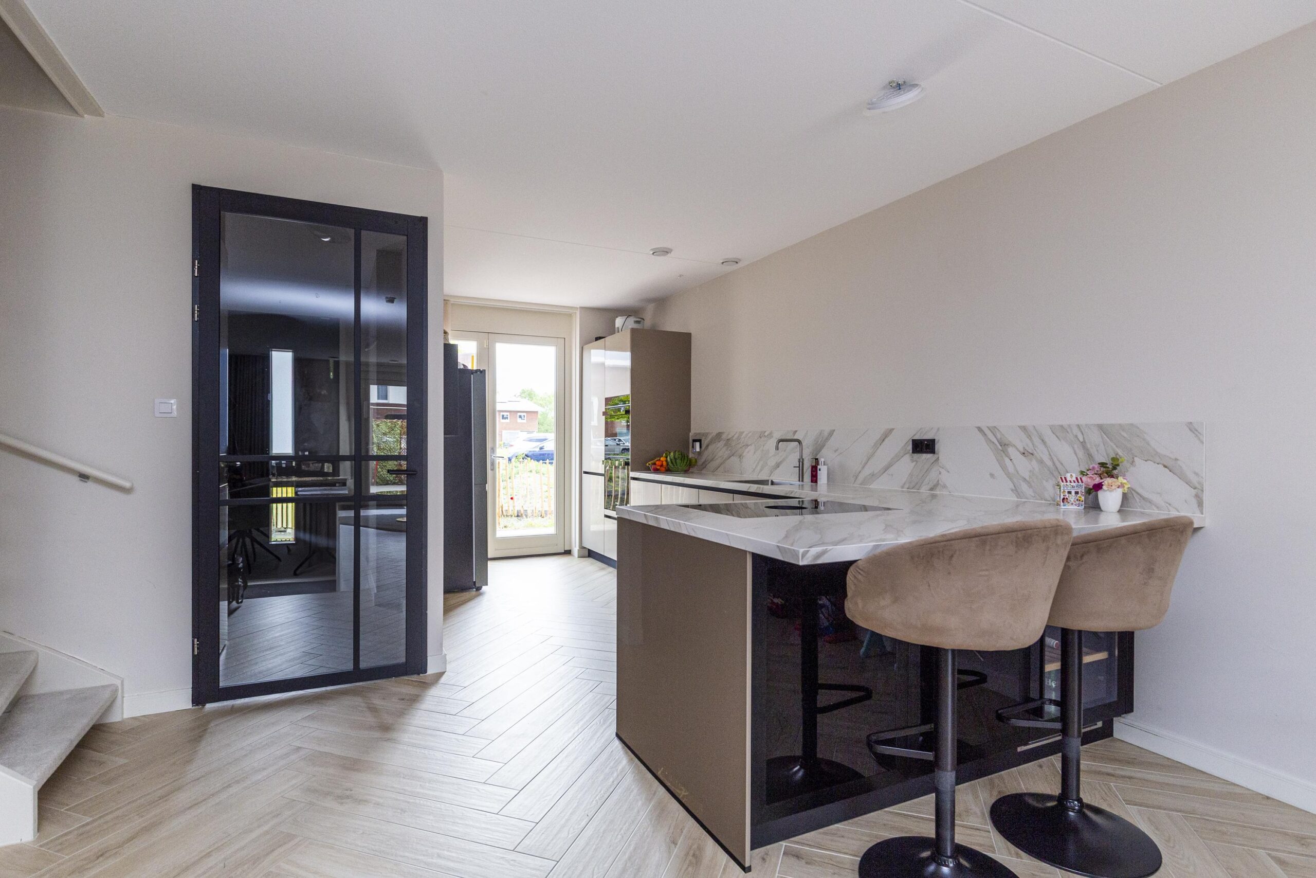 • Strakke afwerking en luxe keuken met marmerlook werkblad, Quooker en wijnkoelkast.