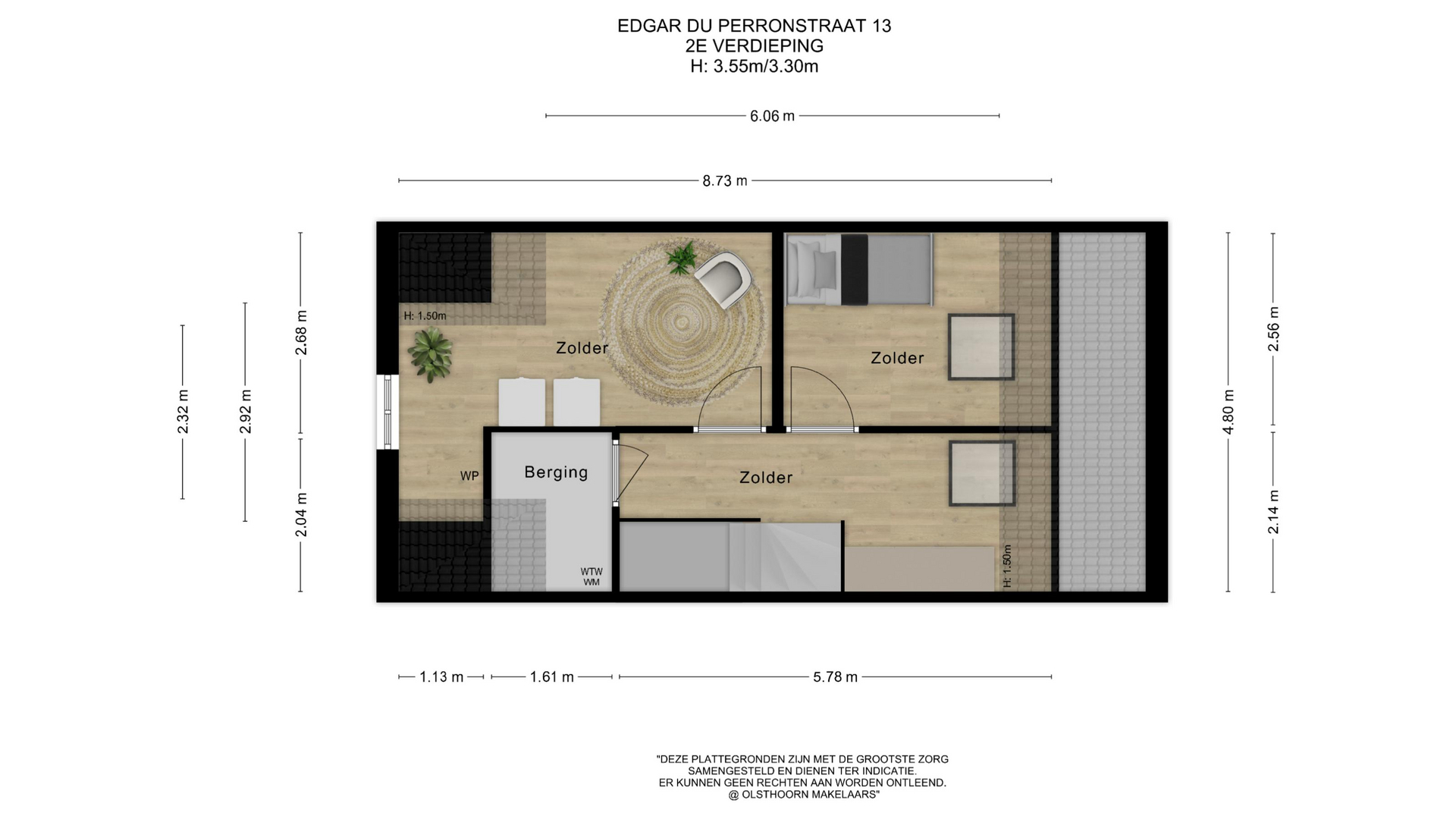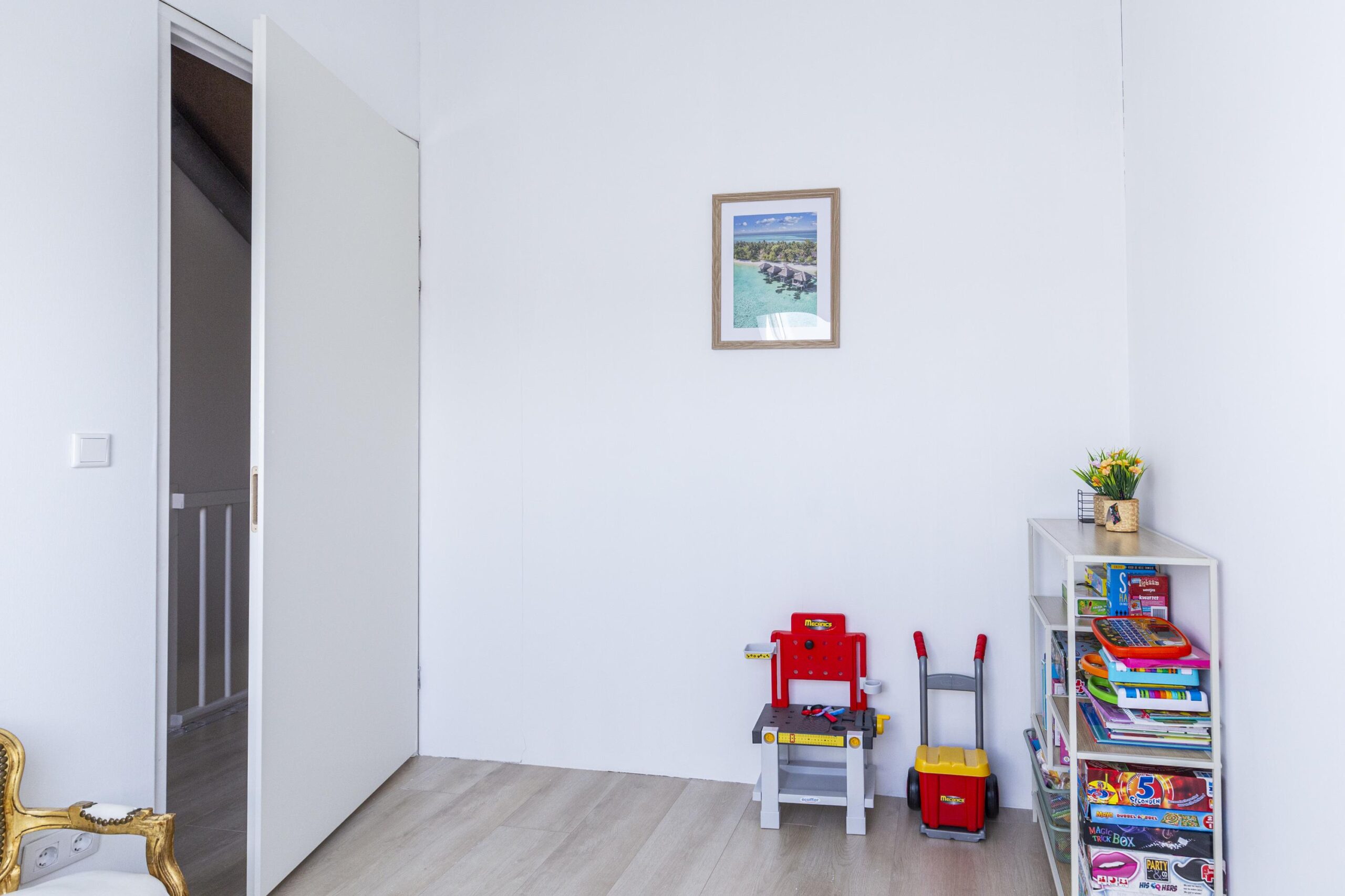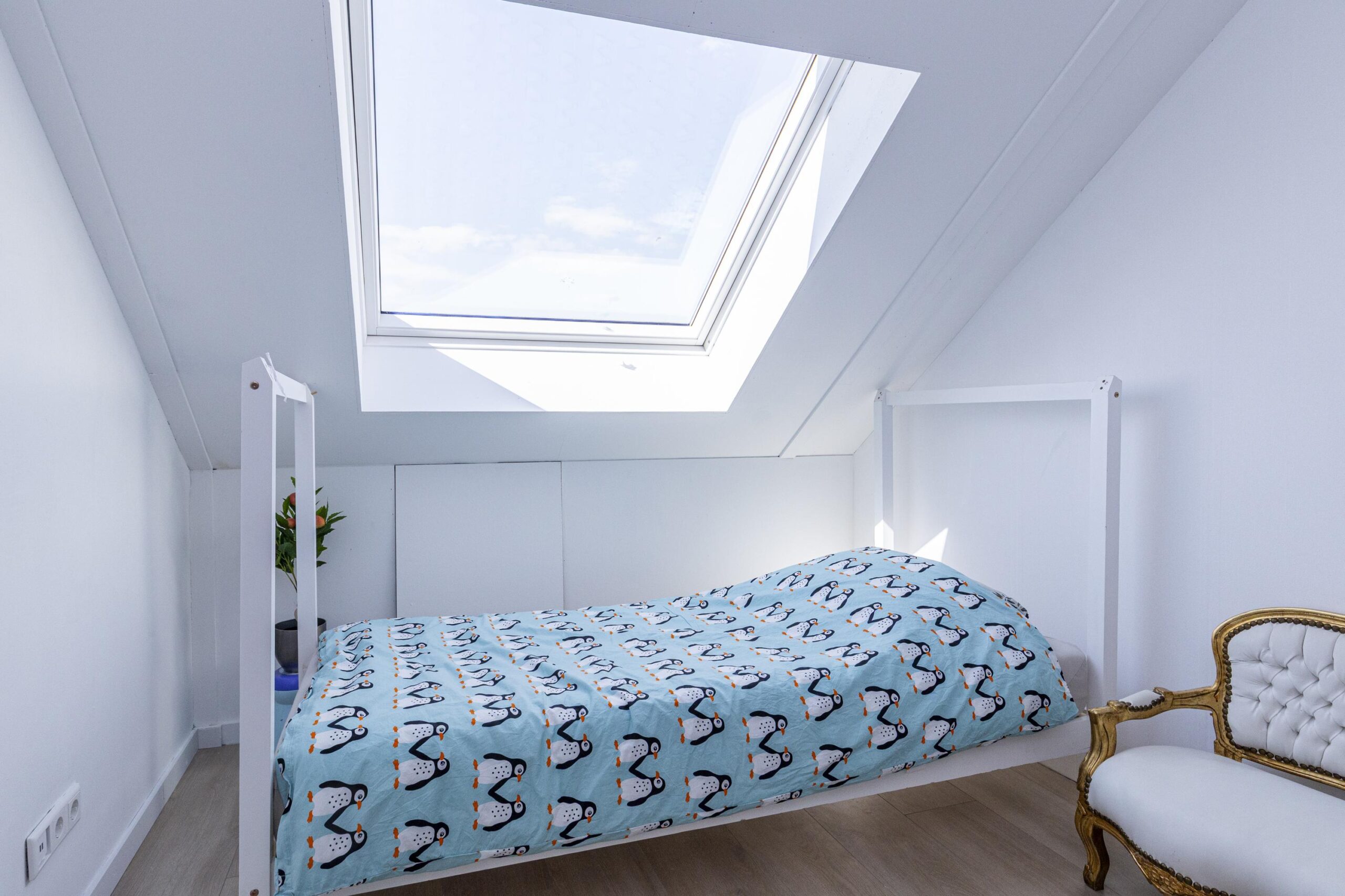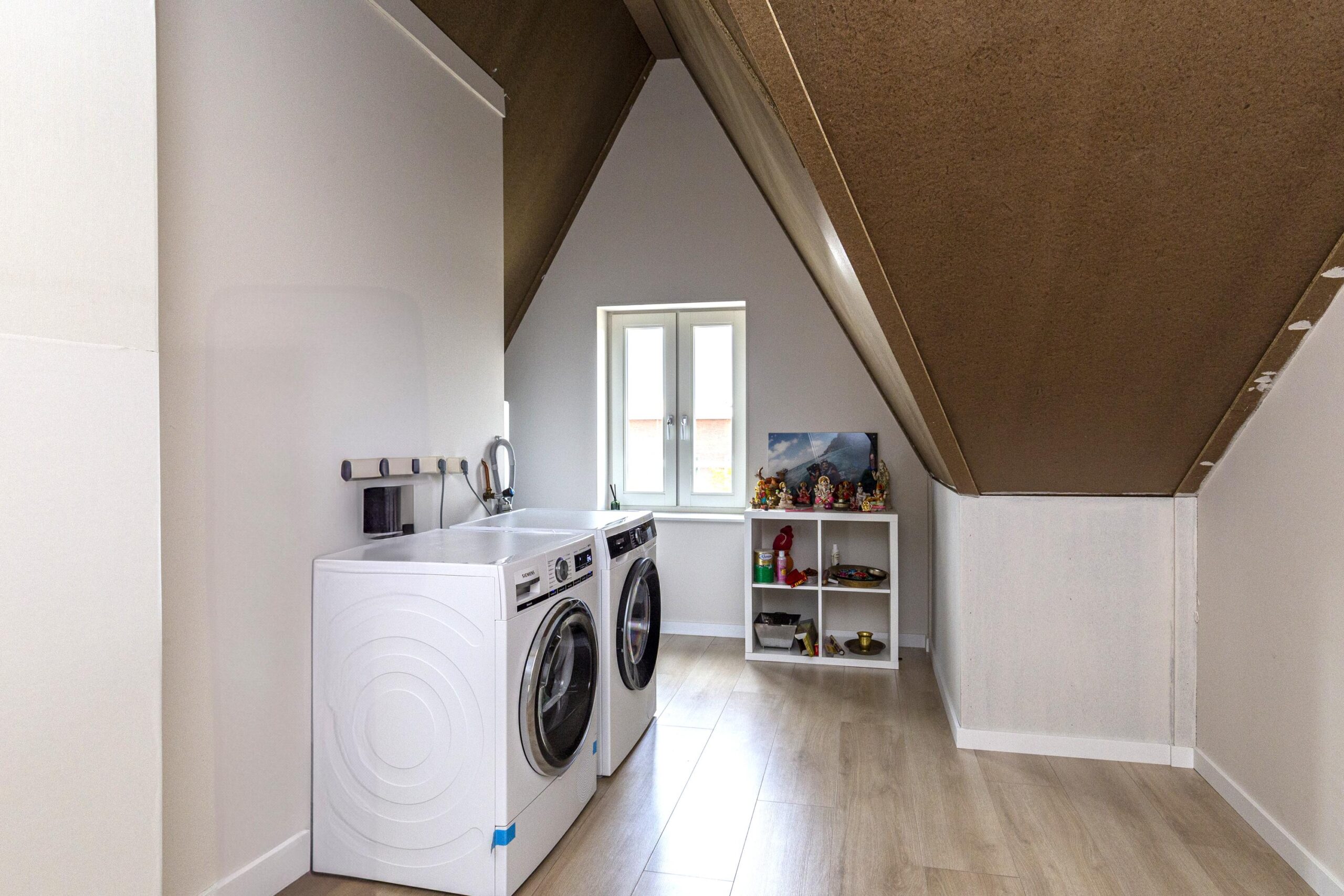 Praktische zolder met veel licht dankzij twee dakramen. Hier bevinden zich een derde slaapkamer, een aparte wasruimte met aansluitingen voor wasmachine/droger en een tweede boiler, plus een technische ruimte met warmteterugwininstallatie en de omvormer van de zonnepanelen.