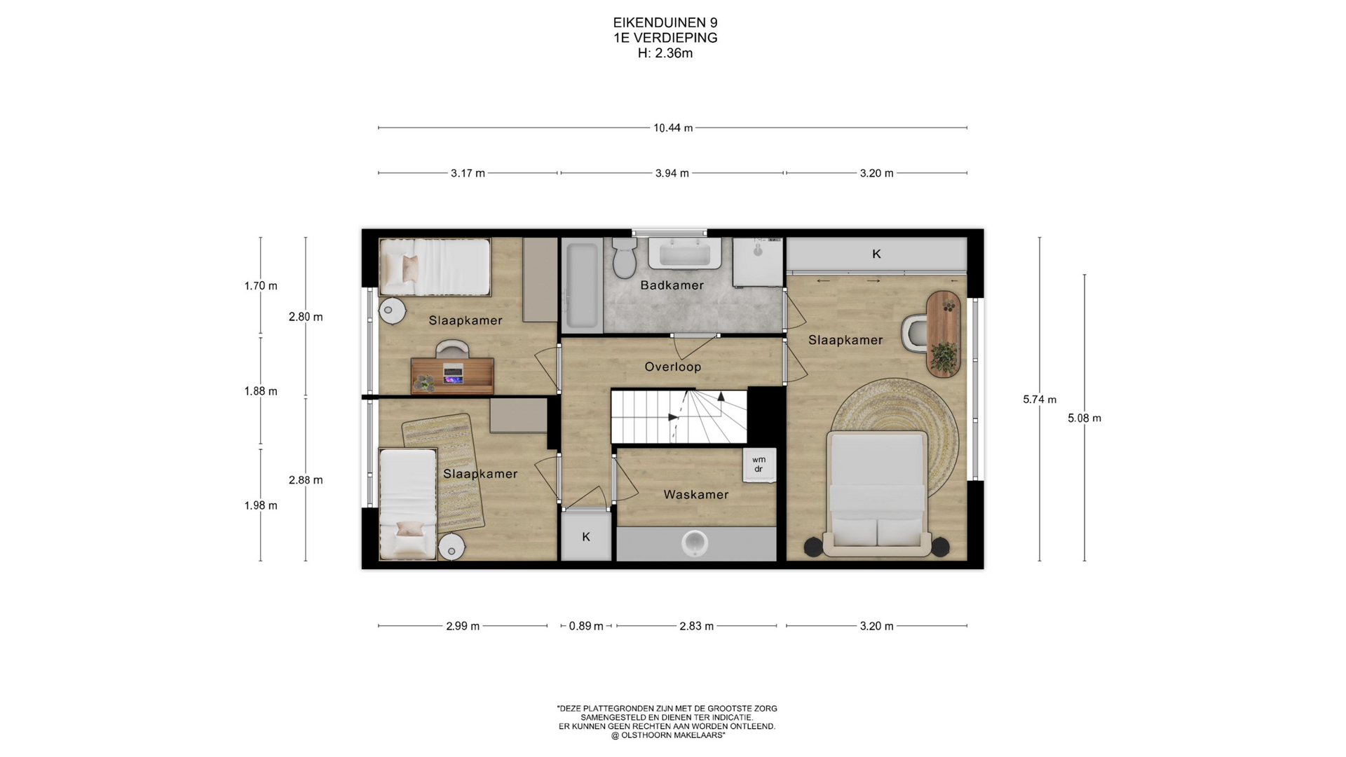 De overloop biedt toegang tot de hoofdslaapkamer, die zich over de volledige breedte van de woning aan de achterzijde bevindt, en tot twee volwaardige slaapkamers aan de voorzijde. De inpandige badkamer is uitgerust met een ligbad, inloopdouche en wastafelmeubel. Daarnaast bevinden zich op deze verdieping een ruime inpandige was-/bergruimte met aansluitingen voor wasmachine en droger, een separaat toilet en een bergkast.