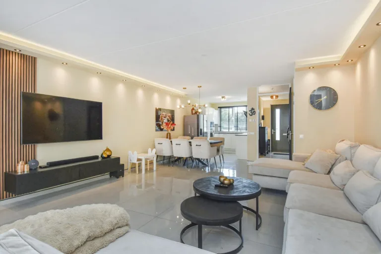 Via de voortuin stap je binnen in de entreehal met een moderne toiletruimte, meterkast en trapopgang. De uitgebouwde woonkamer is ruim en licht, met een praktische trapkast en een grote schuifpui naar de serre. Dankzij de uitbouw van 2,4 meter en de tegelvloer met vloerverwarming geniet je hier van extra comfort. De serre vormt een fijne verlenging van de woonkamer en is perfect als extra zithoek of werkplek te gebruiken.