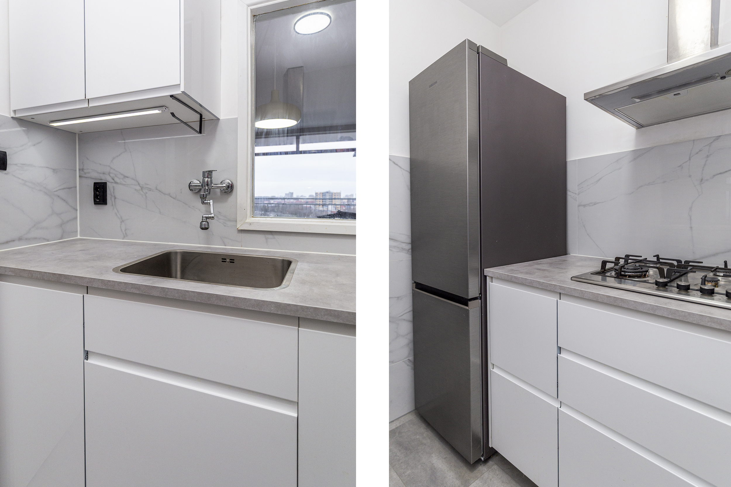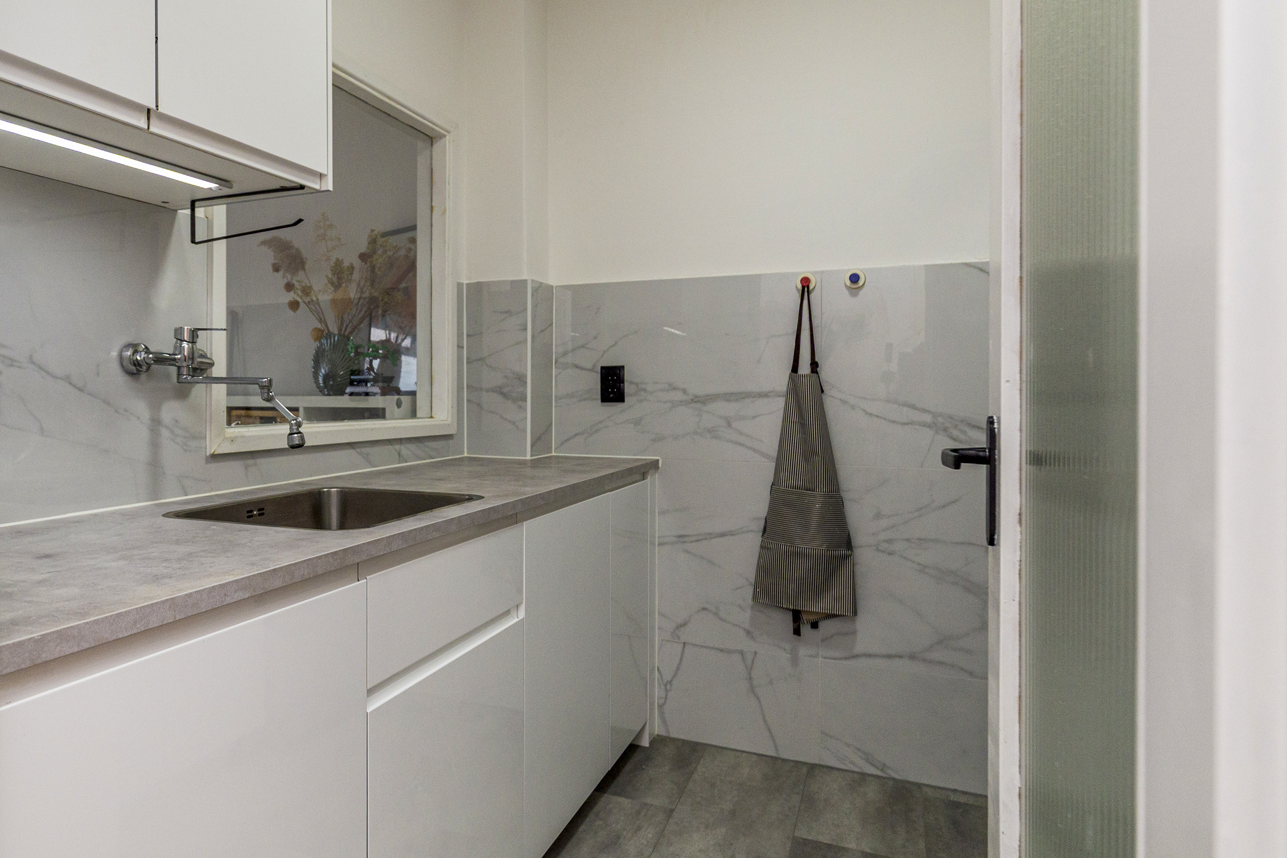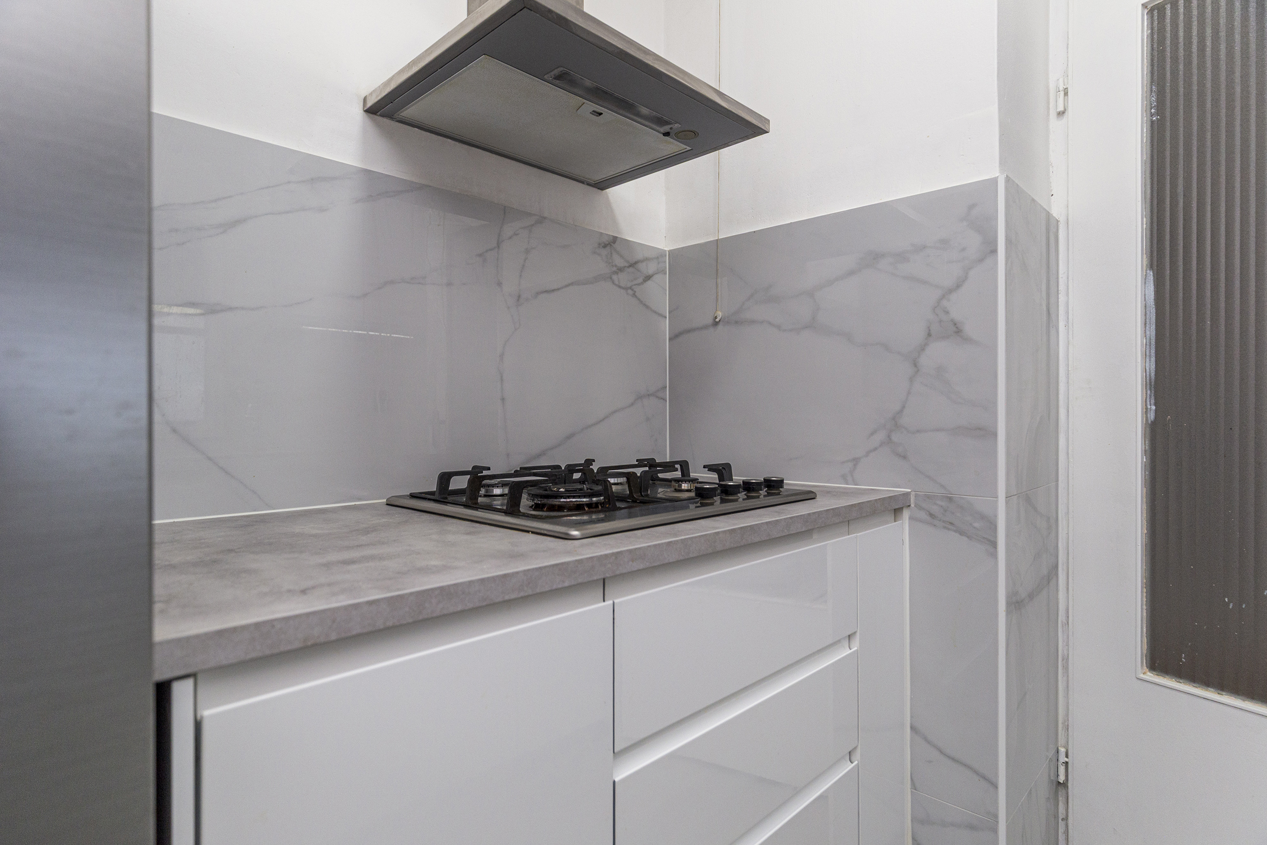 De in 2024 gerenoveerde keuken is voorzien van een 4-pits gasfornuis, een afzuigkap, een vaatwasser en een koel/vries combinatie.