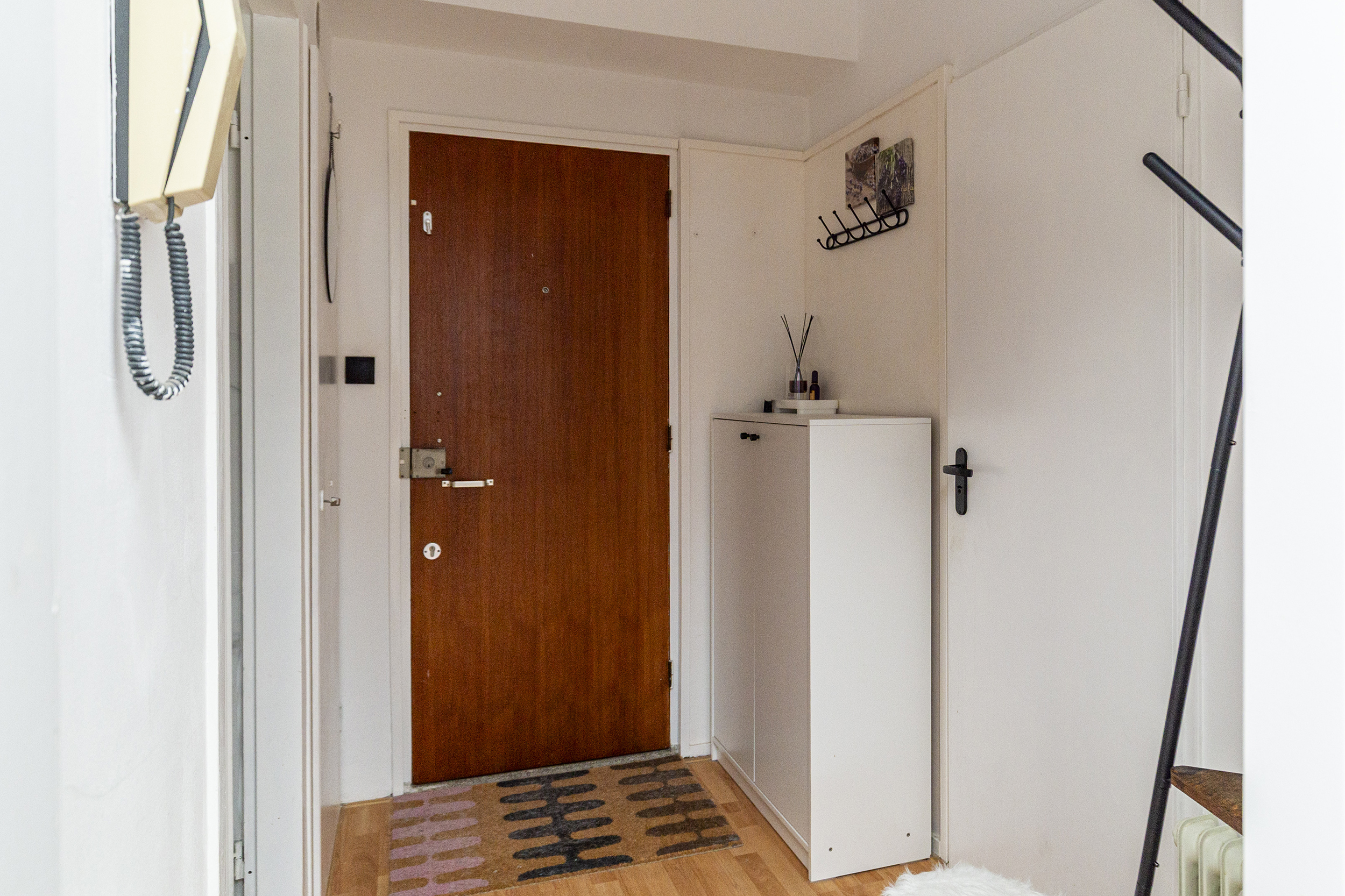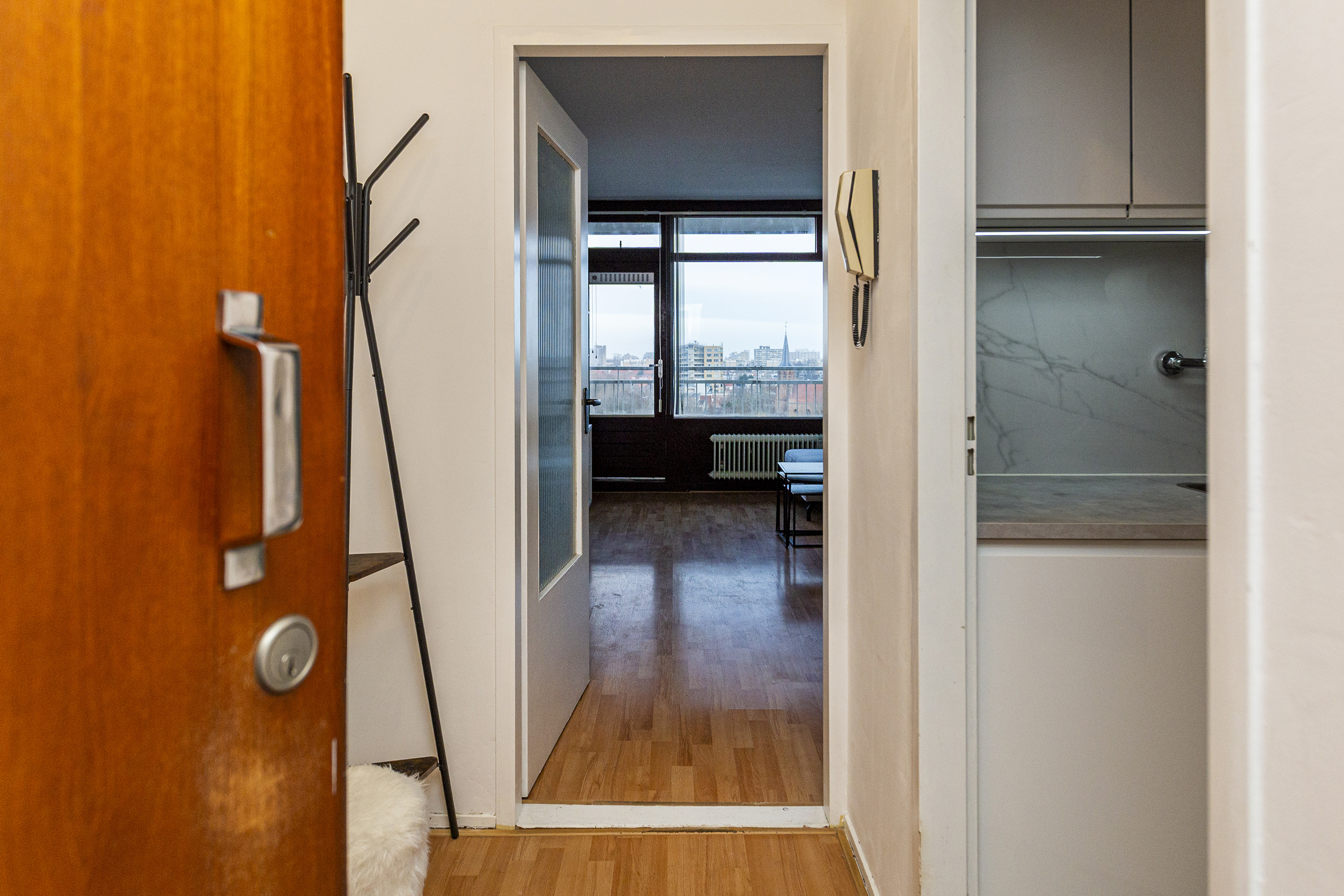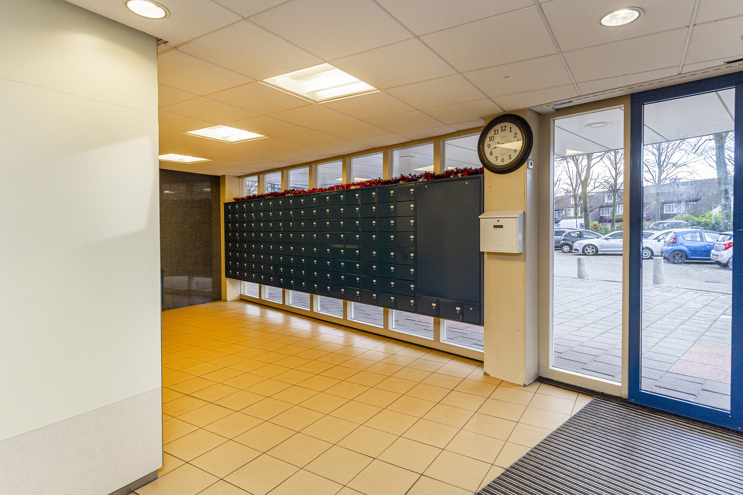 De hal is voorzien van een videofoon- en brievenbussentableau. Met de lift of via het trappenhuis (voor de sportievelingen) bereik je de etage waar het appartement is. Op de 9e woonlaag aangekomen kom je bij een gang waar de toegang tot de woning is.