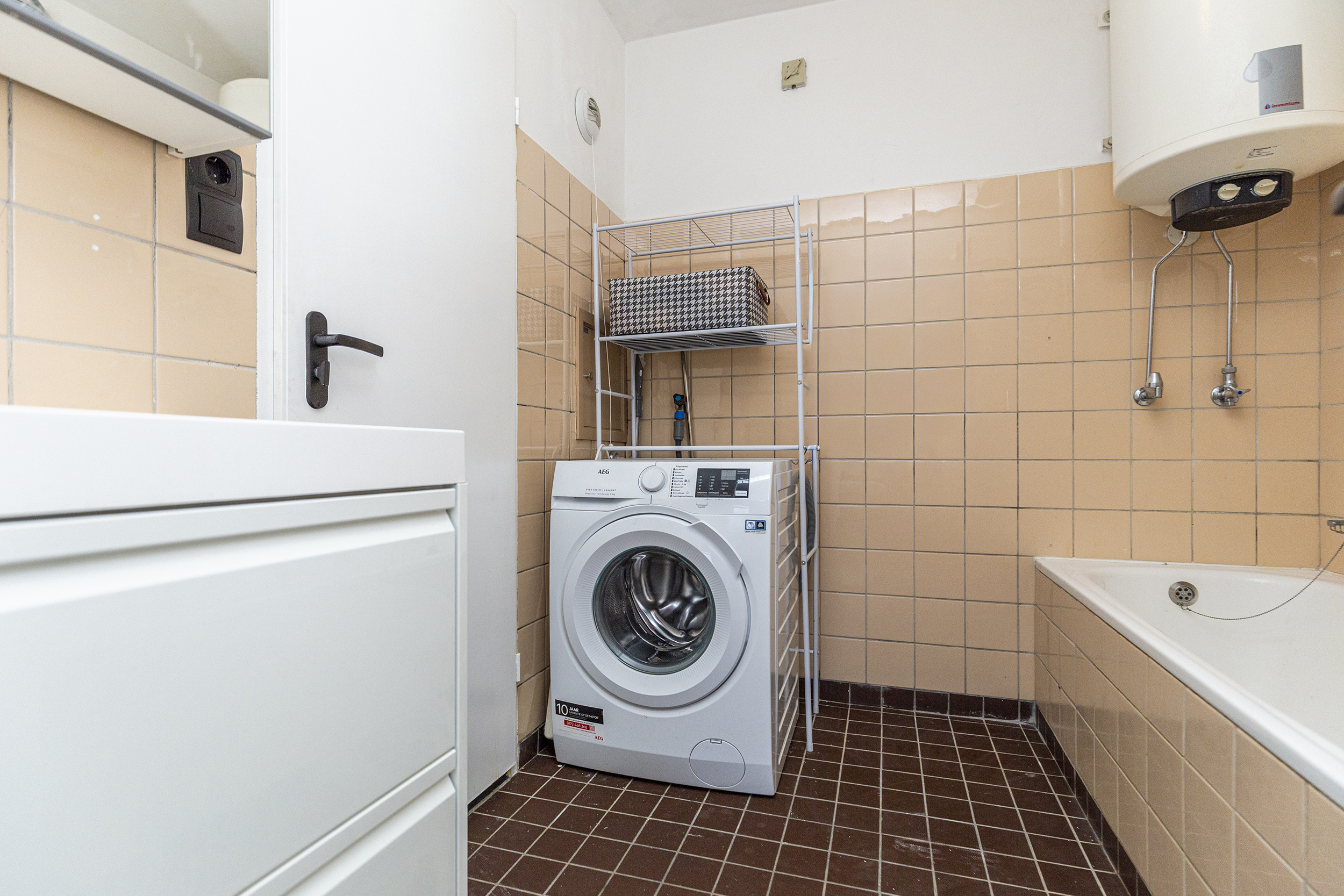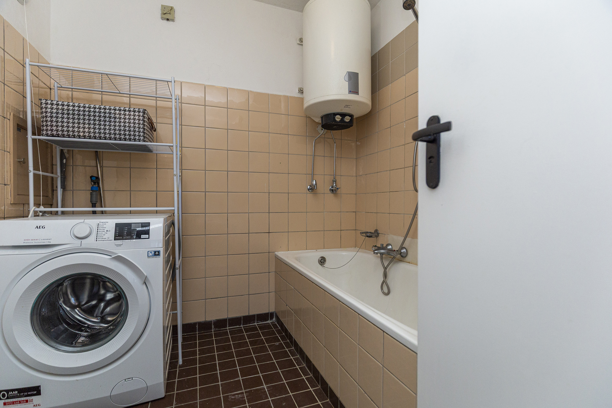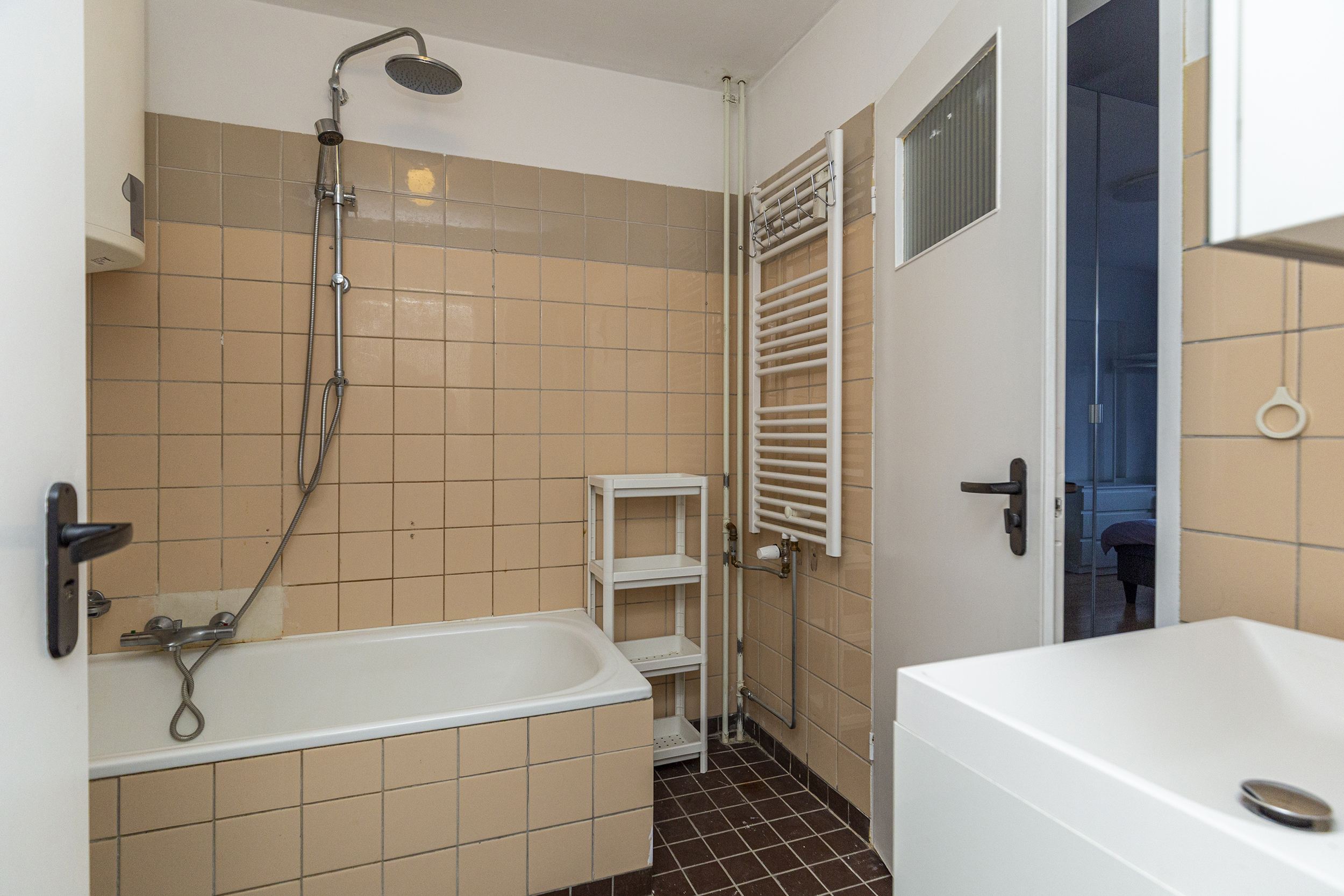 Eenmaal binnen is de hal de centrale verbinding tussen de woonkamer, de keuken en het toilet met fonteintje. Via het toilet kom je bij de badkamer. De badkamer is voorzien van een bad met douche mogelijkheid, een wastafel met meubel en een handdoekradiator. Hier is ook de opstelplaats van de wasmachine en van de elektrische huur boiler. Vanuit de badkamer direct toegang tot de slaapkamer. De ruime slaapkamer geeft ook toegang tot het balkon.