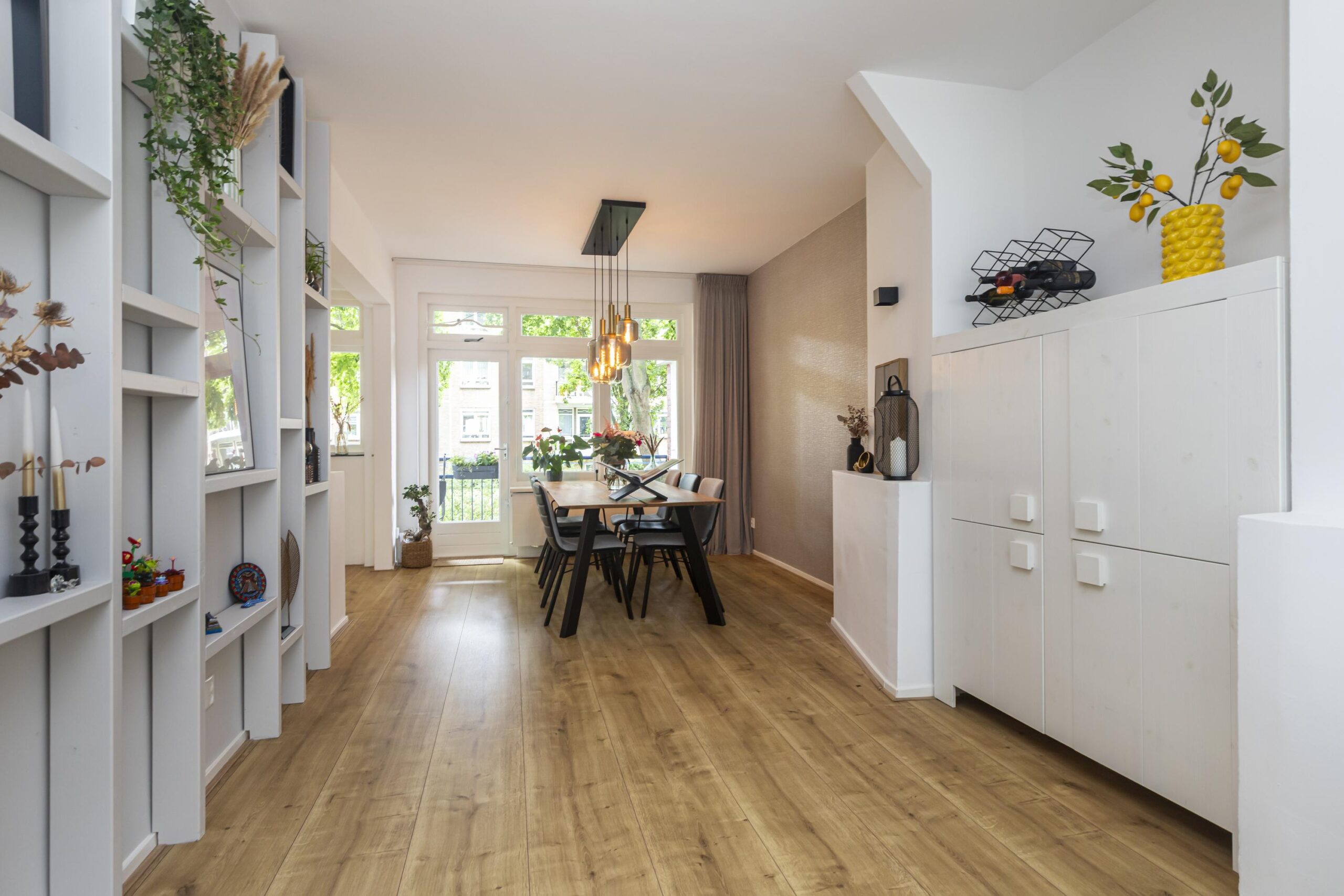 Voortuin met avondzon en ruimte om fijn buiten te zitten. Entree tot de woning. Ruime hal die toegang biedt tot alle vertrekken, inclusief het souterrain.