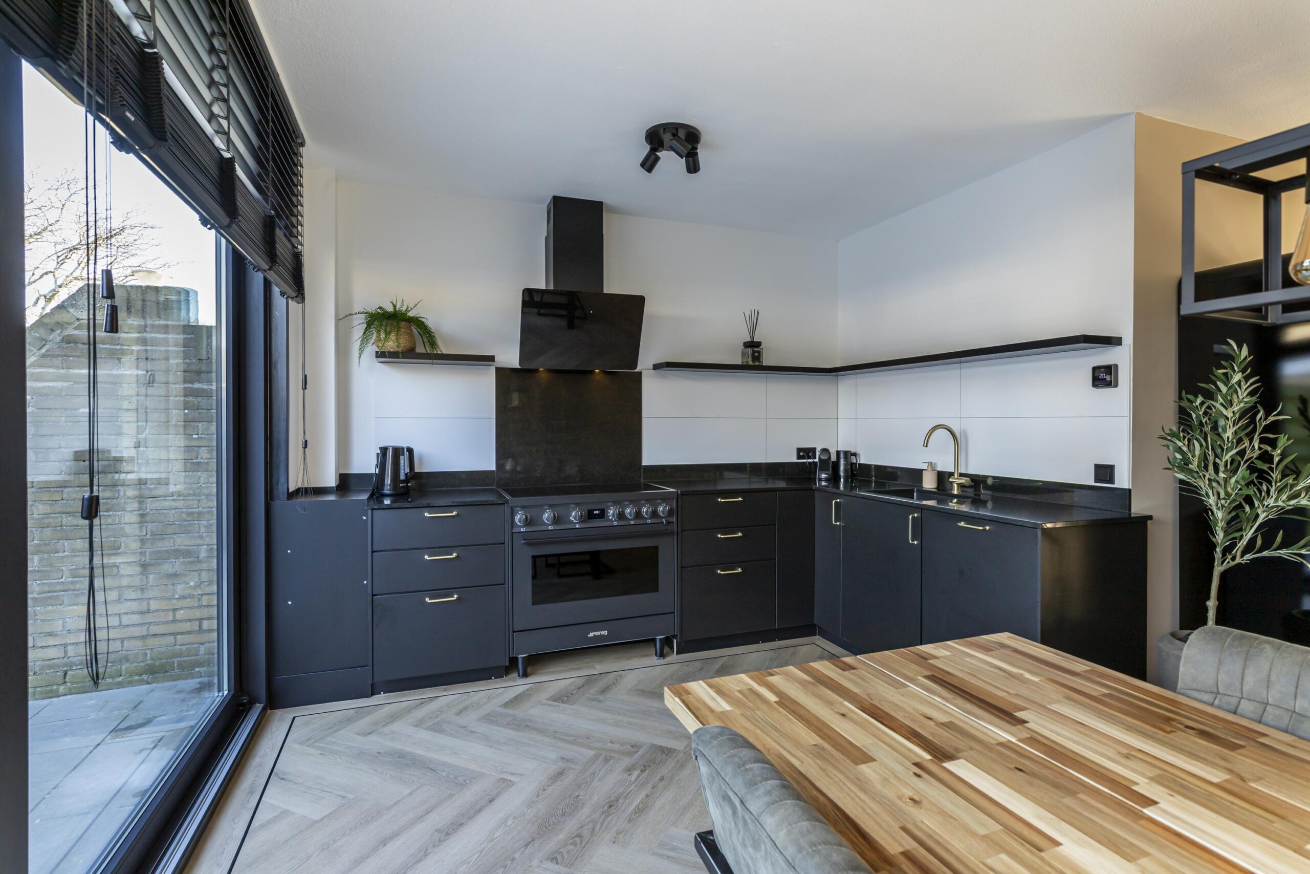 De keuken is in 2023 vernieuwd en geplaatst in een praktische L-opstelling. De keuken staat in open verbinding met de eetkamer en bevindt zich aan de achterzijde van de woning. De inbouwapparatuur en de nette afwerking sluiten mooi aan bij de rest van de woning. De keuken is voorzien van een hoogwaardig kwartsblad en luxe inbouwapparatuur zoals een Smeg inductiefornuis met oven.