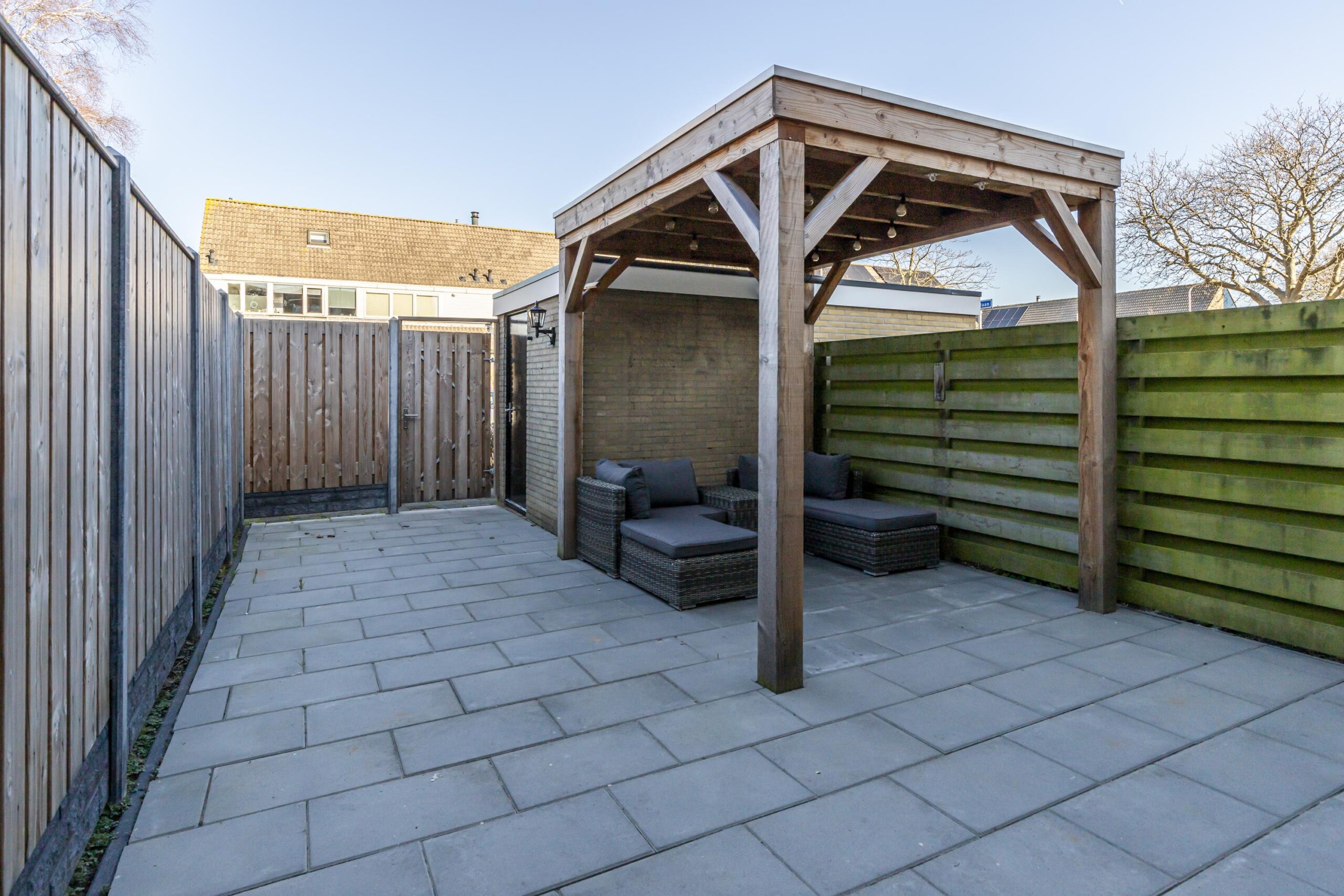 Aan de voorzijde is er een ruime voortuin met parkeergelegenheid voor een auto. De achtertuin ligt op het noordoosten en is een fijne plek om buiten te zitten. Achterin de tuin staat een vrijstaande stenen berging met elektra. Aan deze berging is een overkapping geplaatst, ideaal voor een beschutte zitplek of bijvoorbeeld de fietsen. De berging is daarnaast voorzien van vernieuwde dakbedekking en ventilatie. Extra praktisch: er is een achterom.