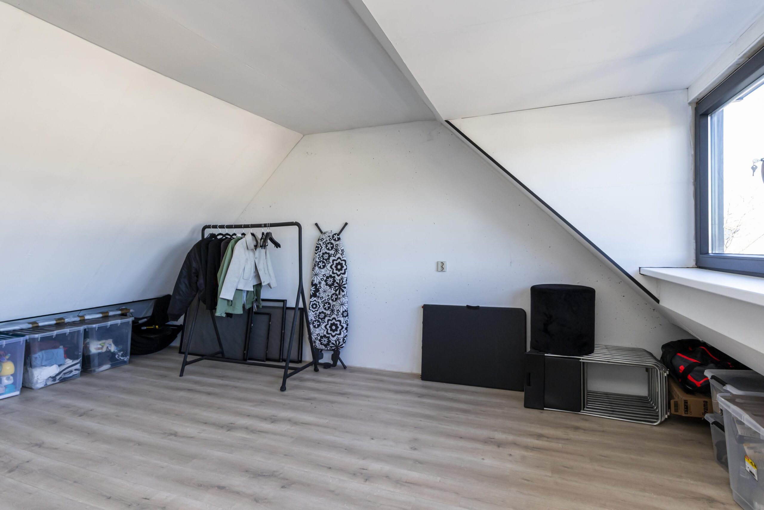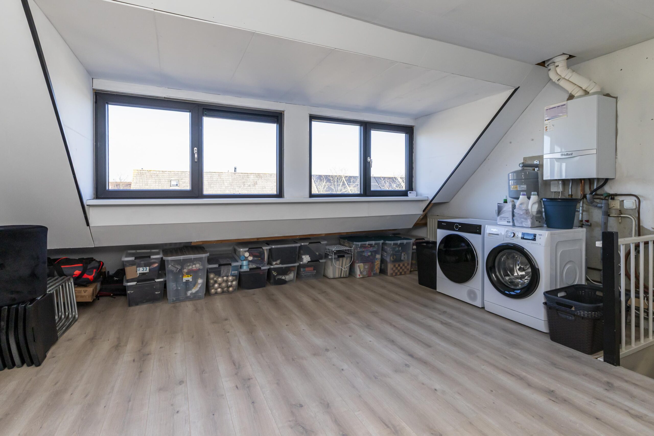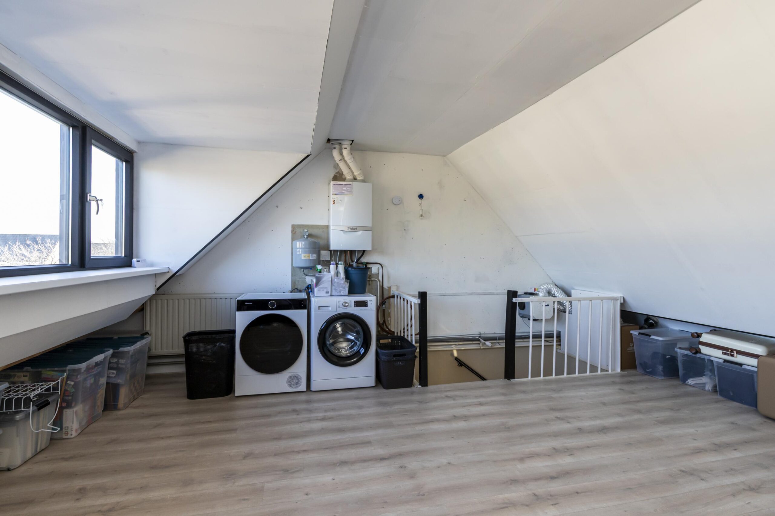 De tweede verdieping betreft een open zolder die je naar eigen wens kunt indelen. Of je nu kiest voor een extra slaapkamer, een werkplek of praktische bergruimte, deze verdieping biedt volop mogelijkheden. Hier bevinden zich de aansluitingen voor de wasmachine en droger, evenals de opstelplaats van de c.v.-combiketel.