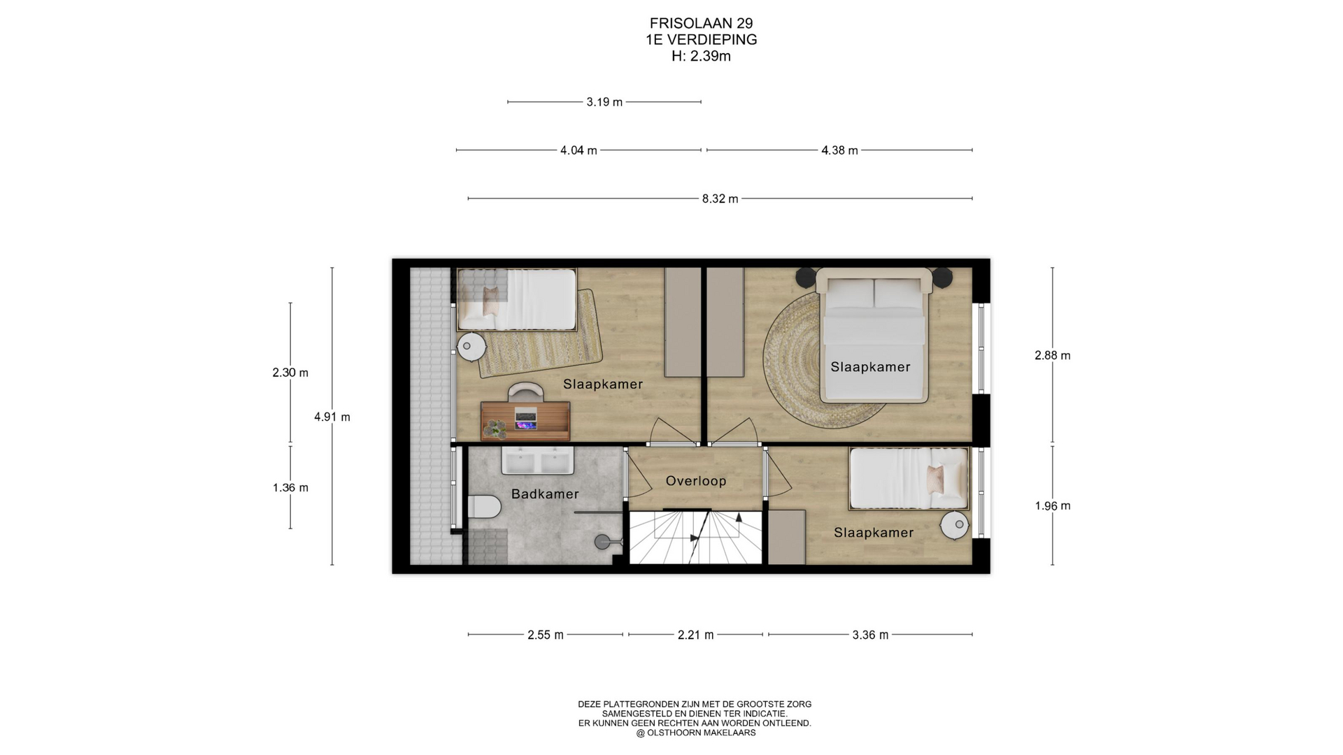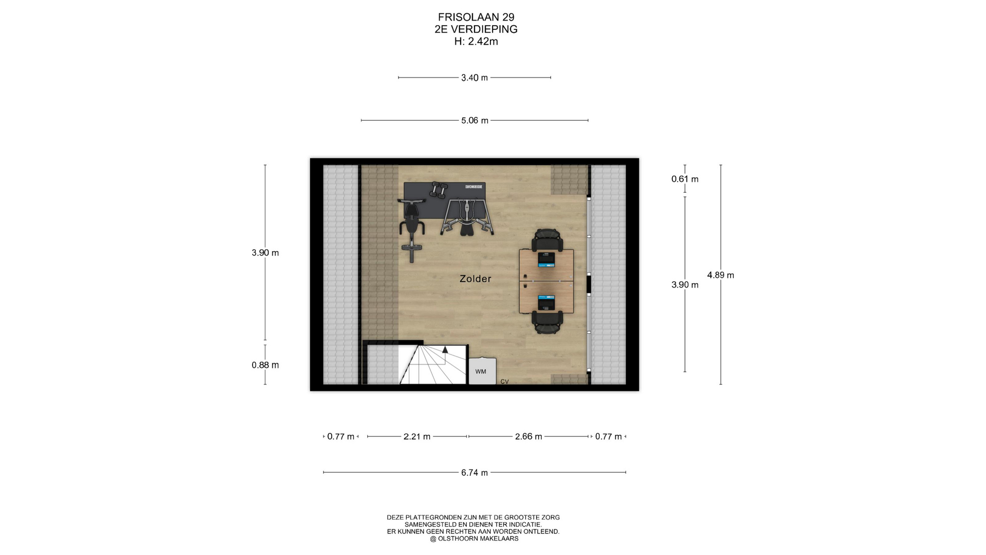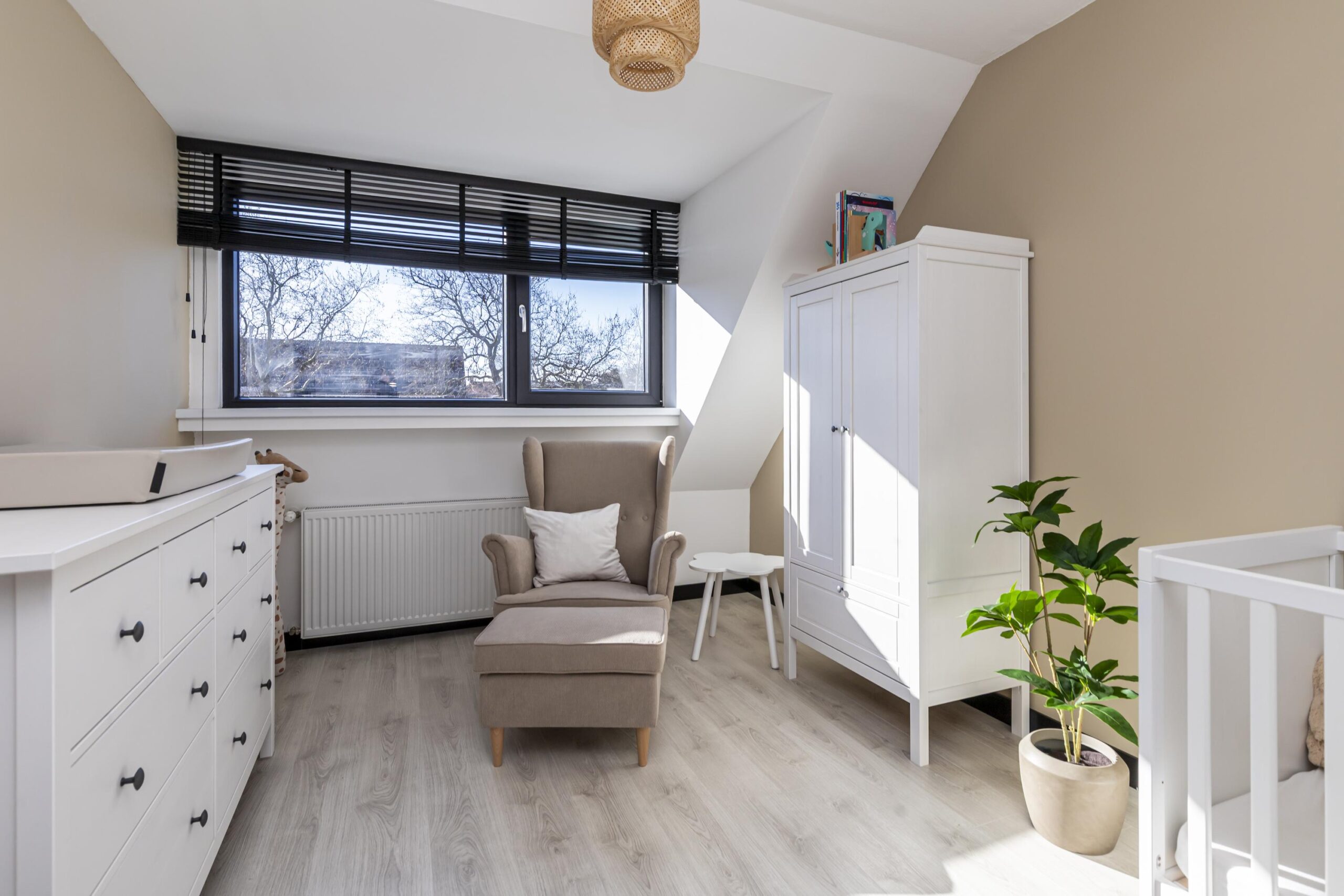 De tweede verdieping betreft een open zolder die je naar eigen wens kunt indelen. Of je nu kiest voor een extra slaapkamer, een werkplek of praktische bergruimte, deze verdieping biedt volop mogelijkheden. Hier bevinden zich de aansluitingen voor de wasmachine en droger, evenals de opstelplaats van de c.v.-combiketel.