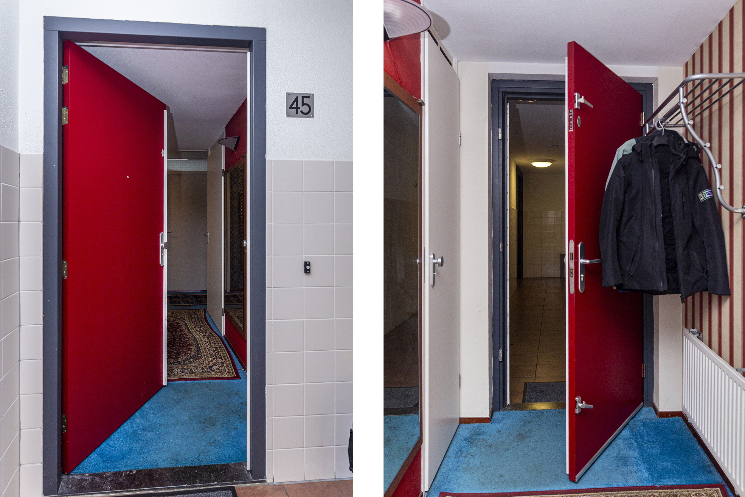 Afgesloten centrale hal met bellentableau, lift, trappenhuis en toegang tot de bergingen.