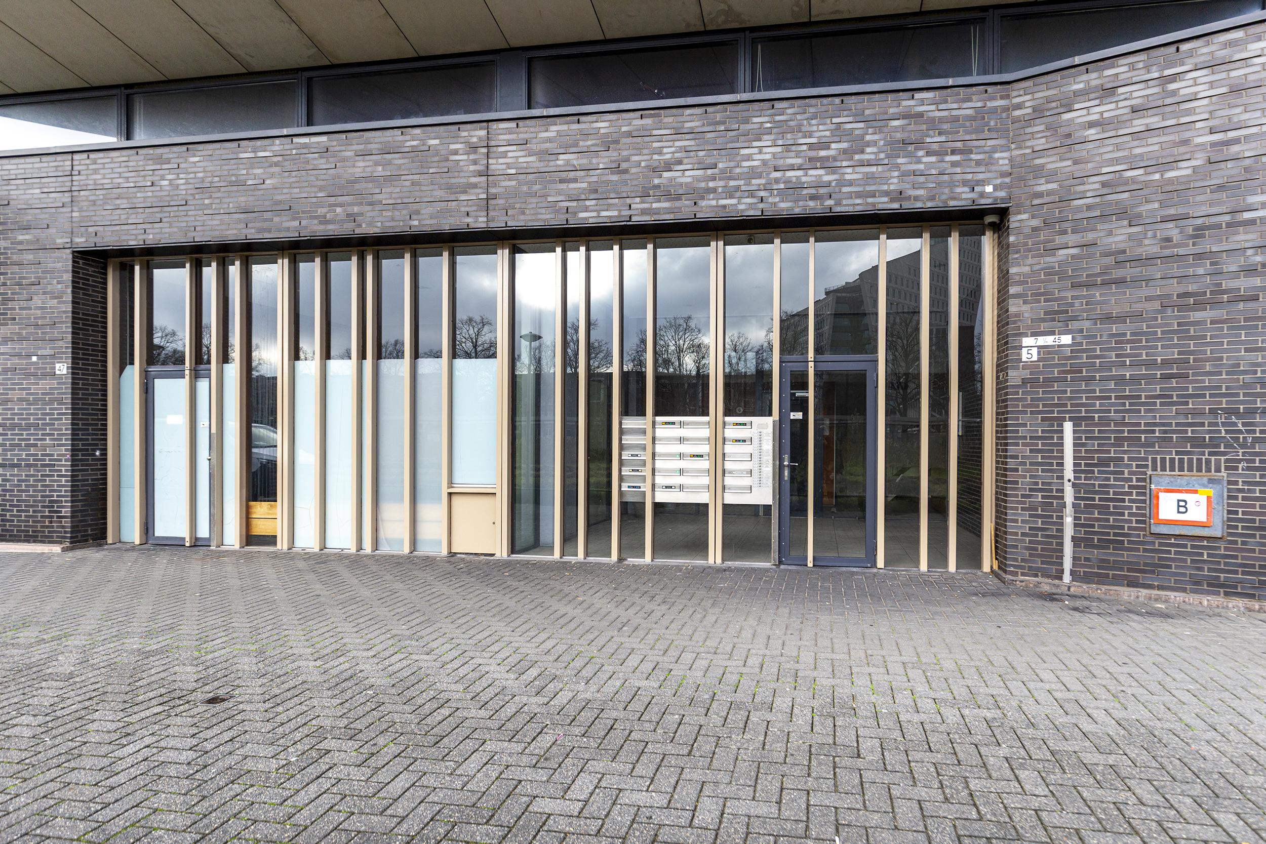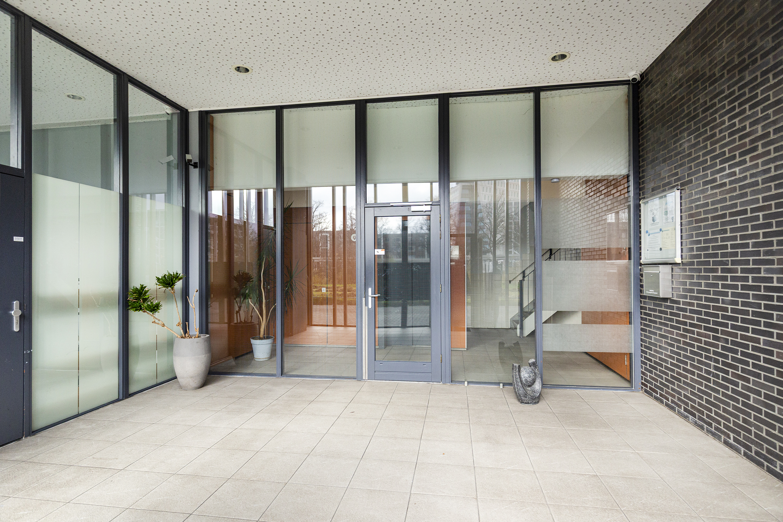 Op de begane grond bevindt zich de afgesloten centrale hal met bellentableau, lift en trappenhuis, evenals de toegang tot de bergingen.