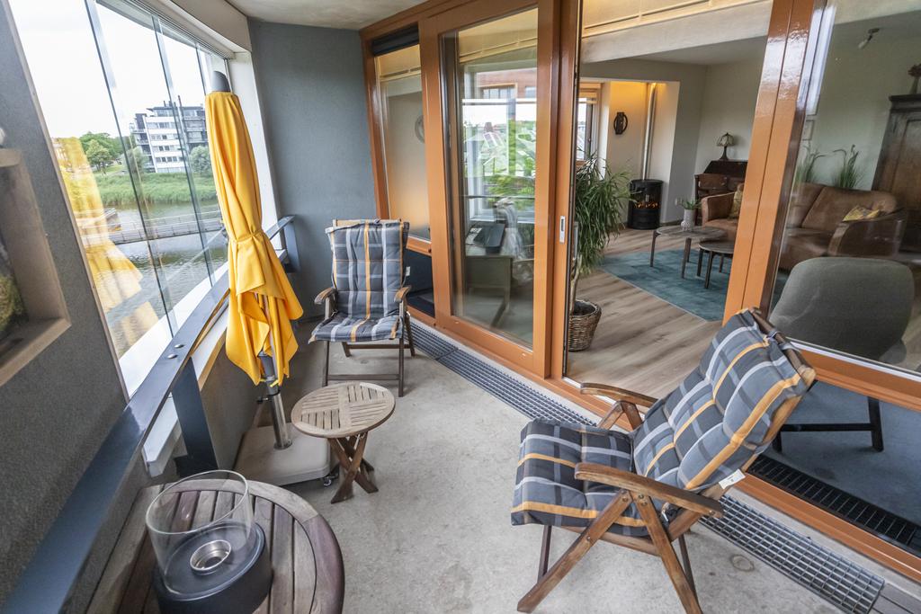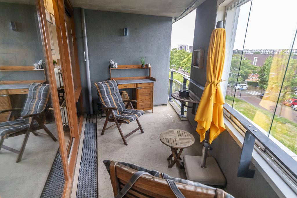 Het balkon aan de achterzijde is inpandig. Het is toegankelijk via een schuifpui vanuit de woonkamer. Het uitzichtvenster is voorzien van een vierdelig schuifraam waardoor het balkon een groot deel van het jaar te gebruiken is voor buitenverblijf. In de zomer biedt het balkon door de ligging zonlicht tot zonsondergang. Het balkon beschikt over twee geaarde buitenstopkontakten die vanuit de woonkamer kunnen worden ingeschakeld.