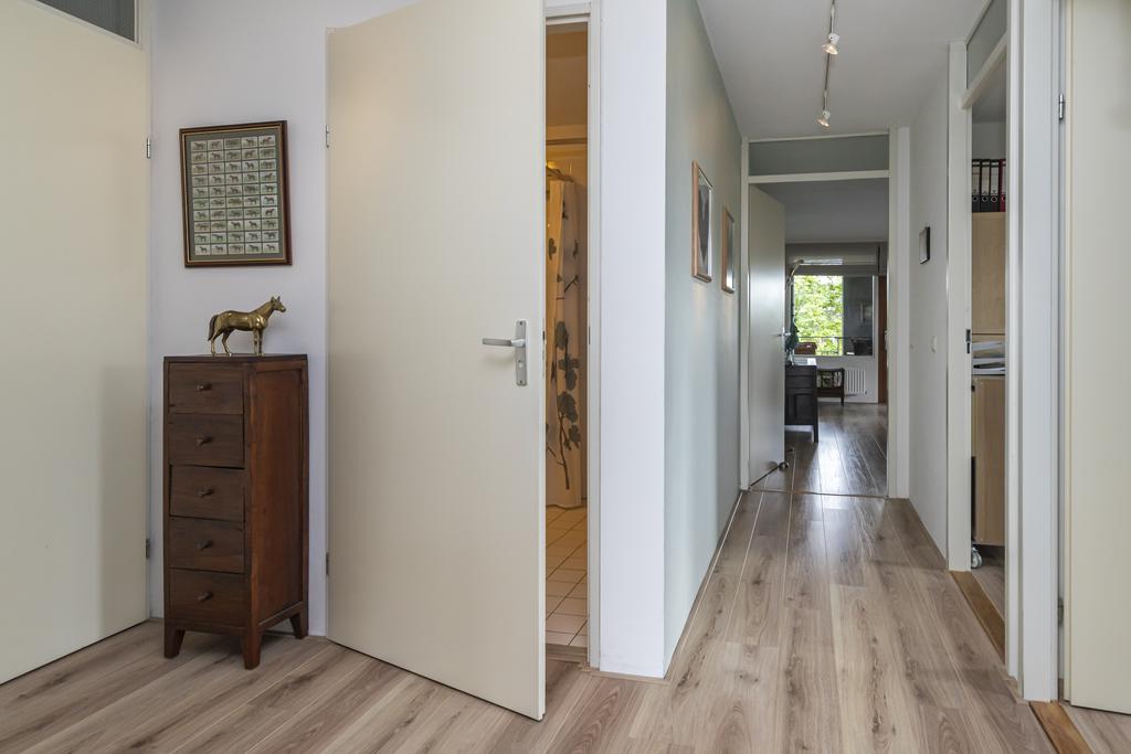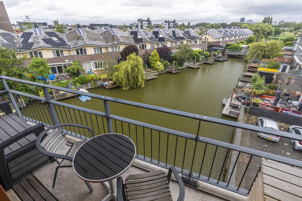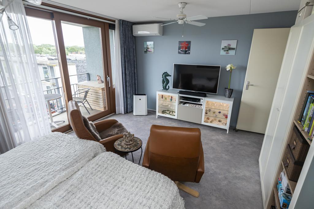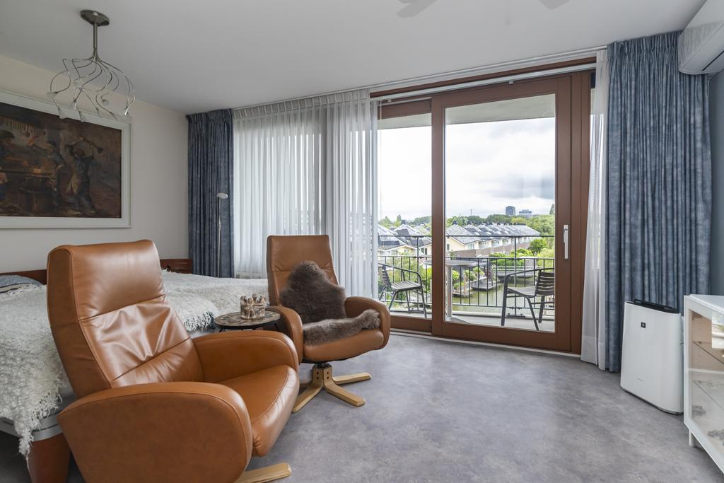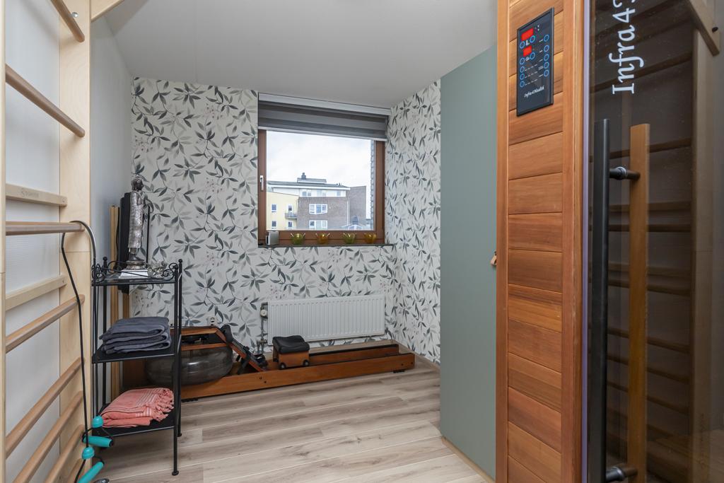De drie slaapkamers zijn ruim en bieden voldoende ruimte voor kasten en andere meubels. De grootste slaapkamer is uitgerust met een fluisterstille airco met buitenunit in een houten ombouw. Via een schuifpui heeft u toegang tot een balkon, waar u in de zomer kunt genieten van uw ochtendkoffie met uitzicht op de rustige waterrijke buurt en de weilandjes van de stadsboerderij. Van de twee overige slaapkamers is er één ingericht als fitnessruimte met een roeiapparaat met tv-scherm, een wandrek en een rijk uitgeruste infraroodsauna. De andere is logeerkamer annex kantoor.