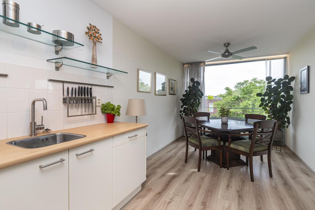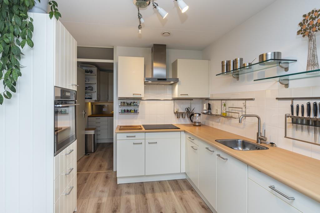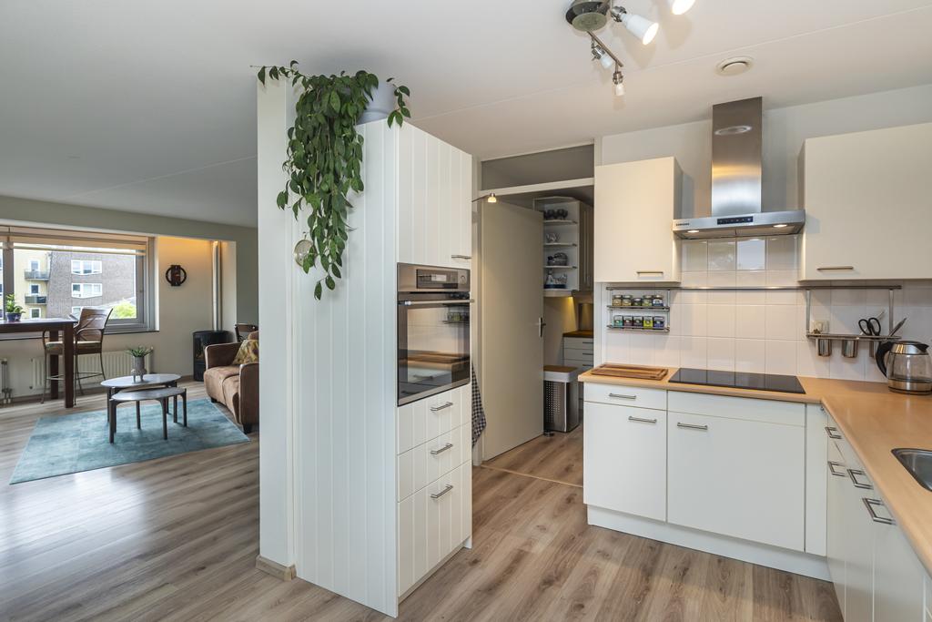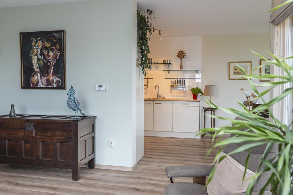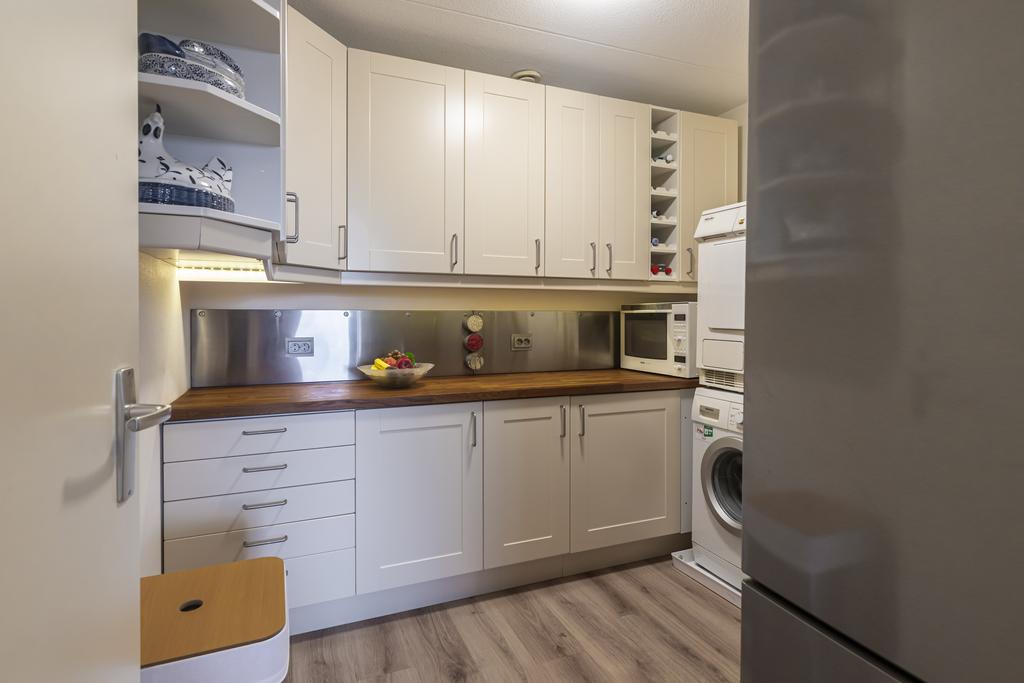 Bij binnenkomst wordt u meteen verwelkomd door een ruime hal en gang die toegang bieden tot alle vertrekken van het appartement. De lichte en ruime woonkamer is voorzien van grote ramen en een schuifpui, die een overvloed aan natuurlijk licht binnenlaten en een prachtig uitzicht bieden op de waterpartijen rondom het appartement. De woonkamer loopt naadloos over in de eetkamer en de open keuken, die volledig is uitgerust met inductiekookplaat, vaatwasser en een combi/stoomoven. Naast de keuken is er nog een ruime bijkeuken met een ruim hardhouten aanrechtblad. In de keukenmeubelen is een overvloed aan bergruimte. De grote moderne koel/vriescombinatie is vrijstaand. Er is ook een opstelplaats voor wasmachine en wasdroger. Deze ruimte is uitgerust met een centrale permanent operationele ventilatie unit voor het gehele appartement.