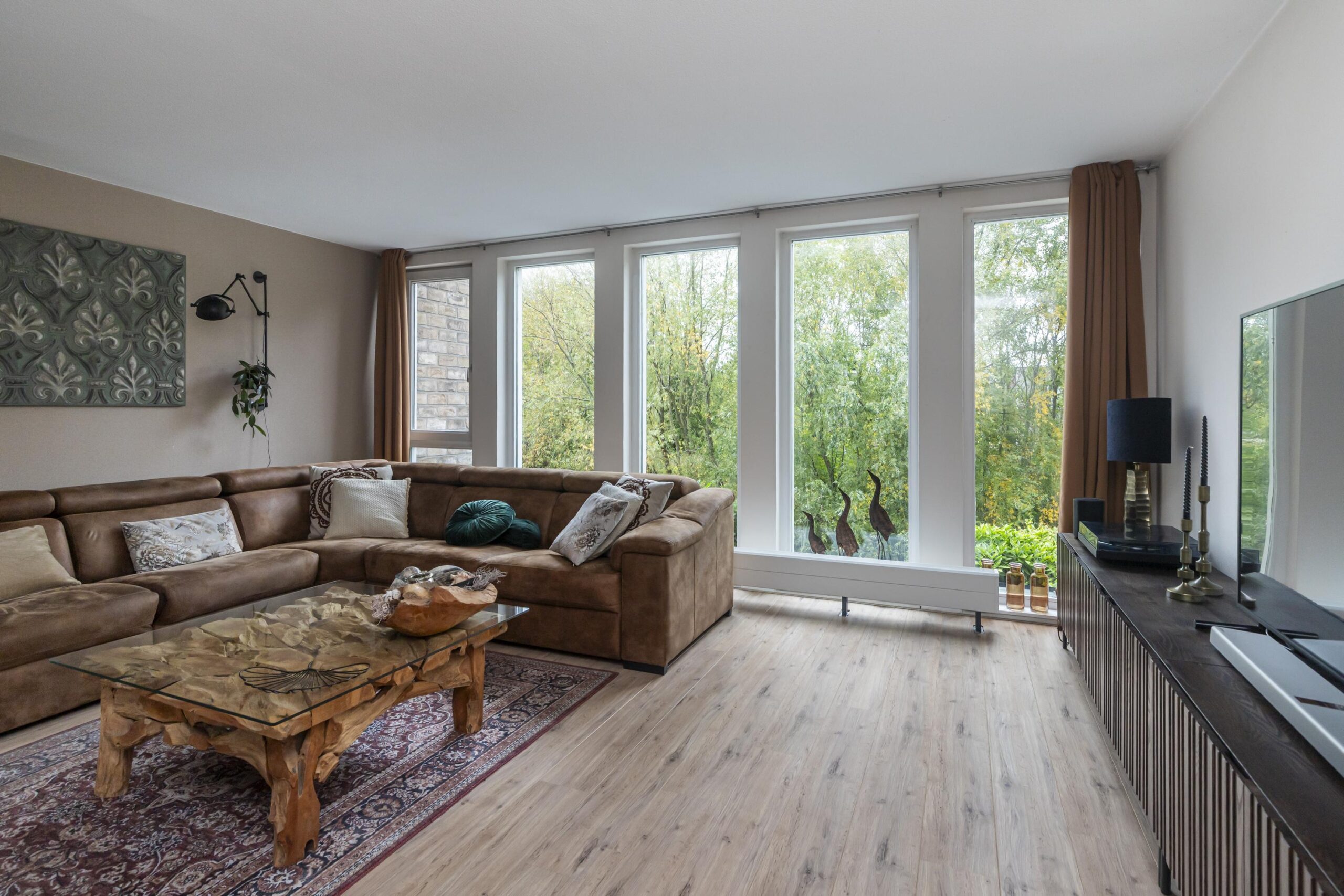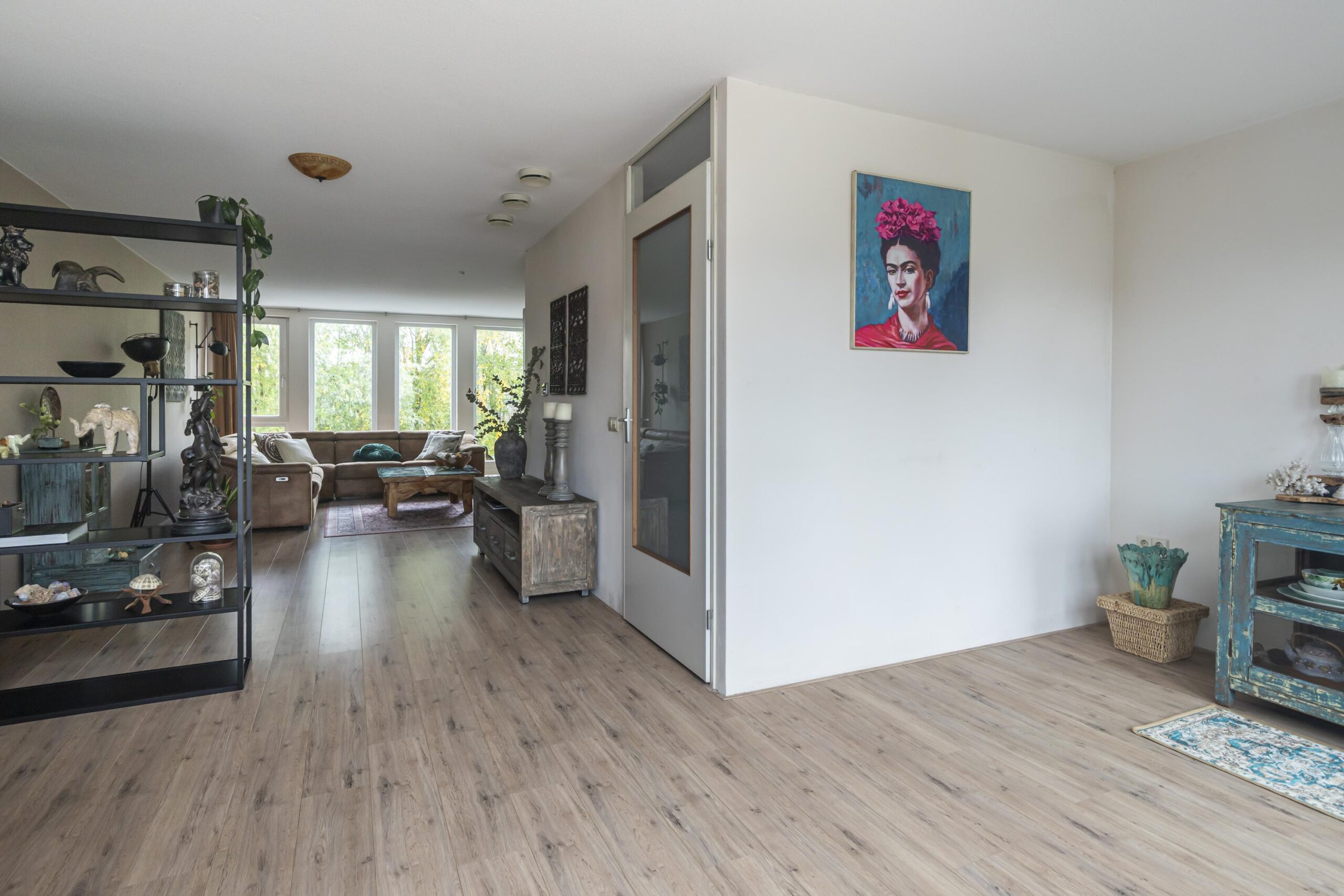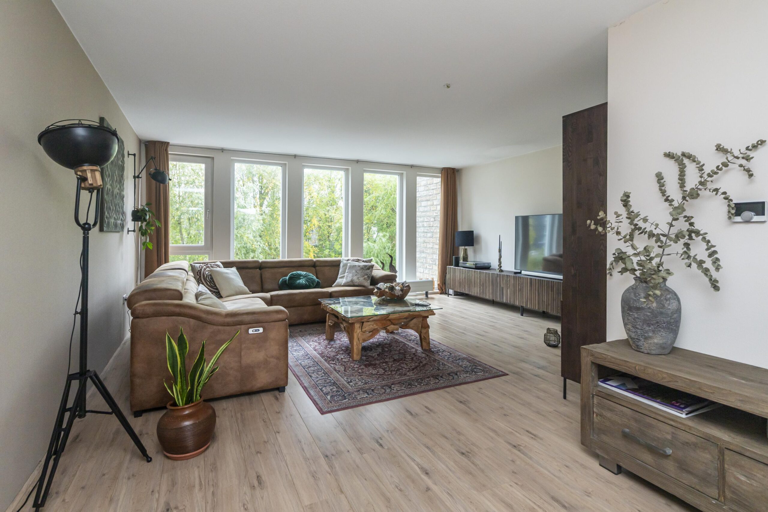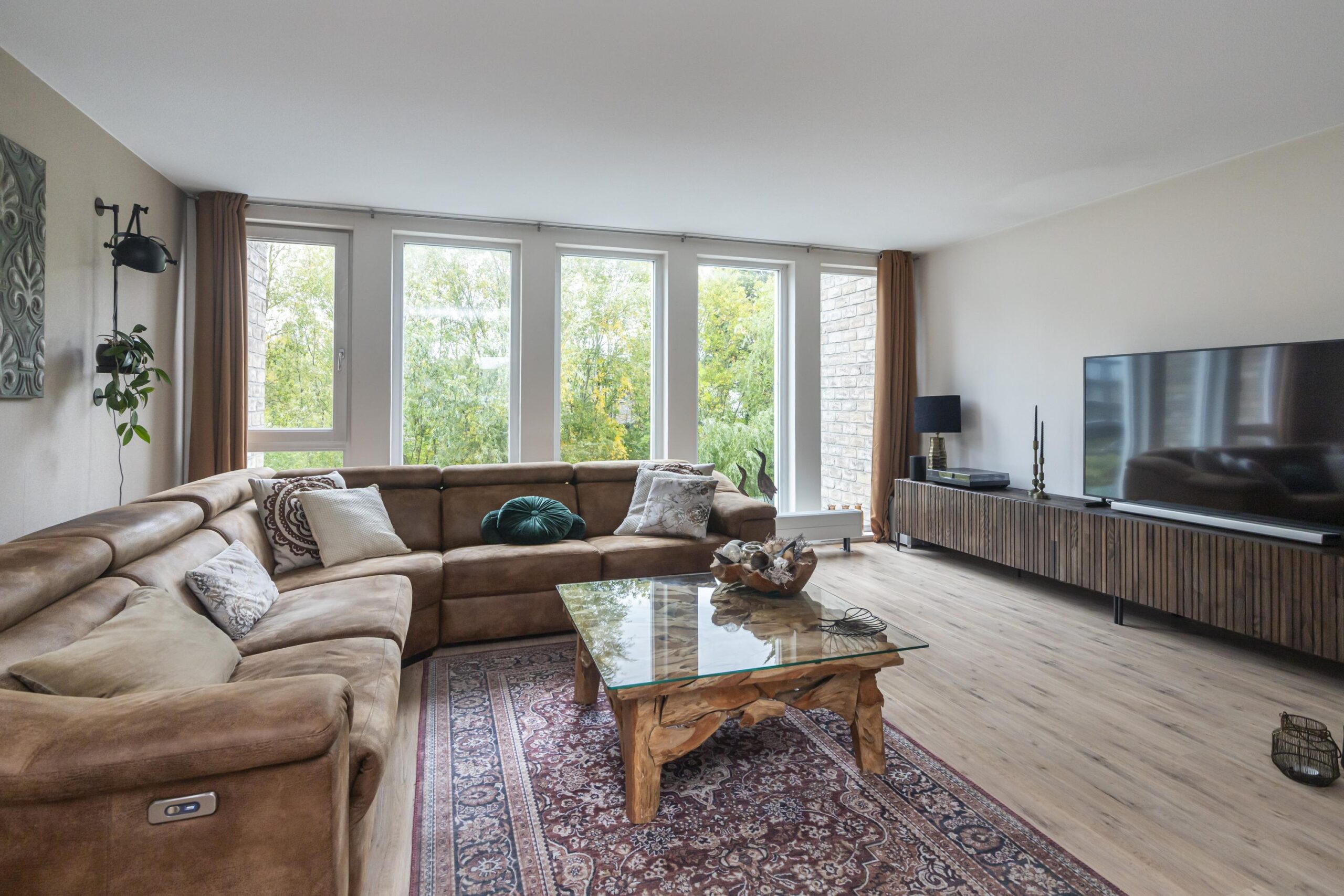 Overloop met separaat toilet. Royale woonkamer over de volle lengte met veel lichtinval, een zitgedeelte en een flexibele achterkamer ideaal voor een thuiswerkplek, tv hoek of eetkamer.