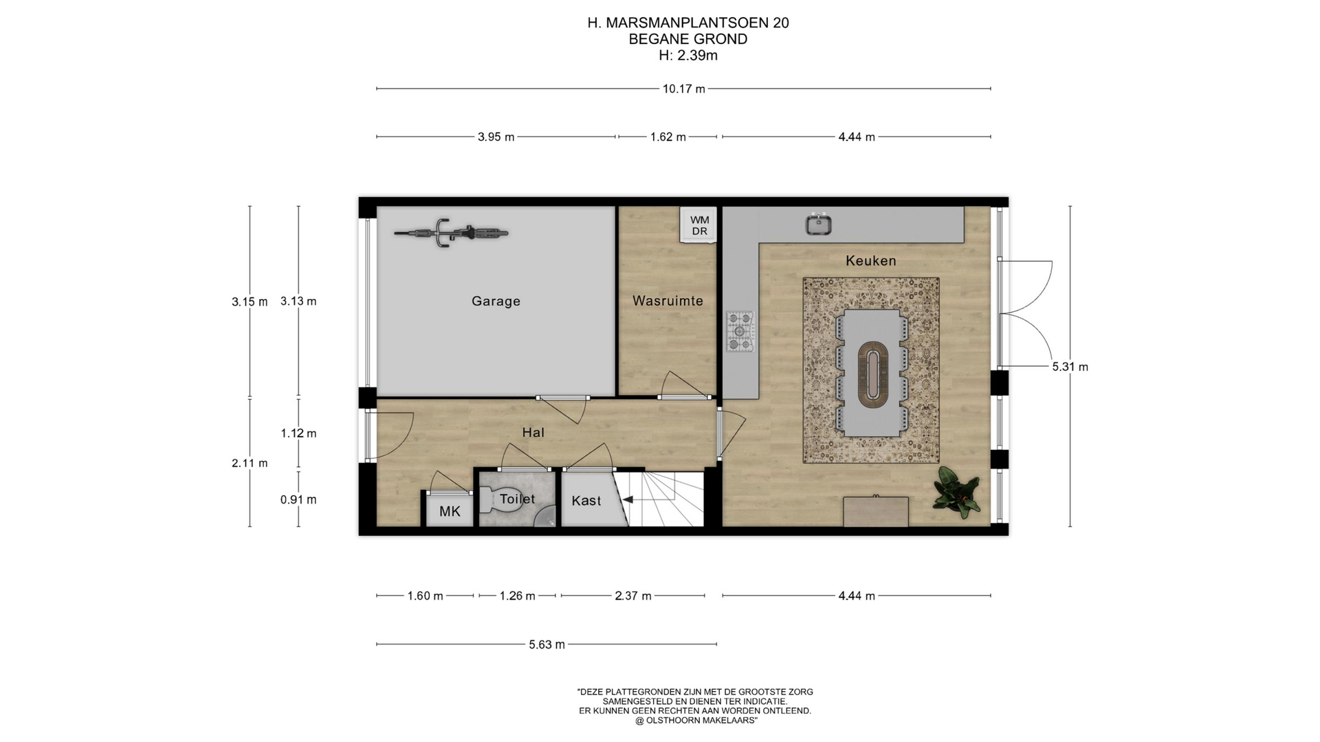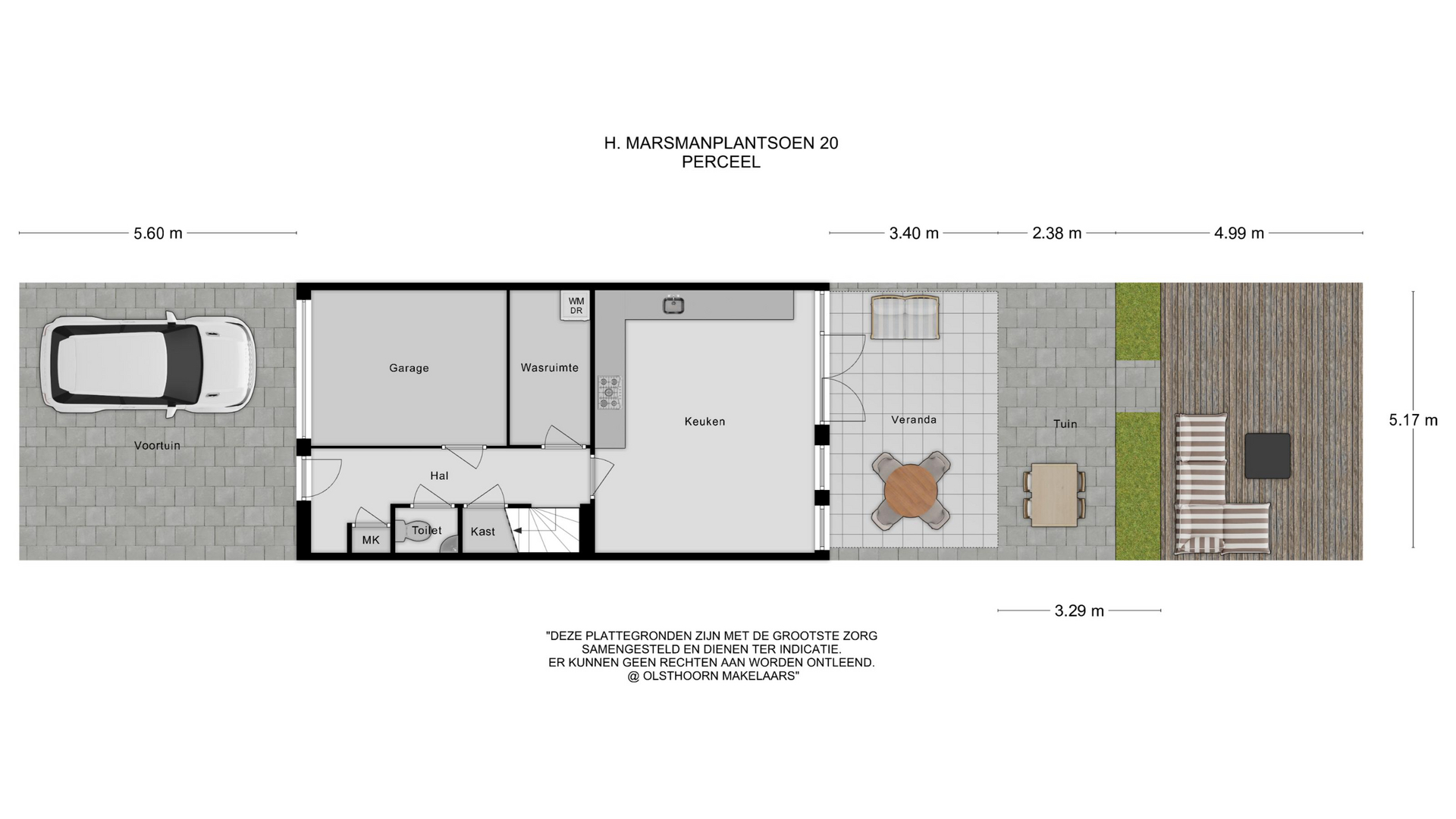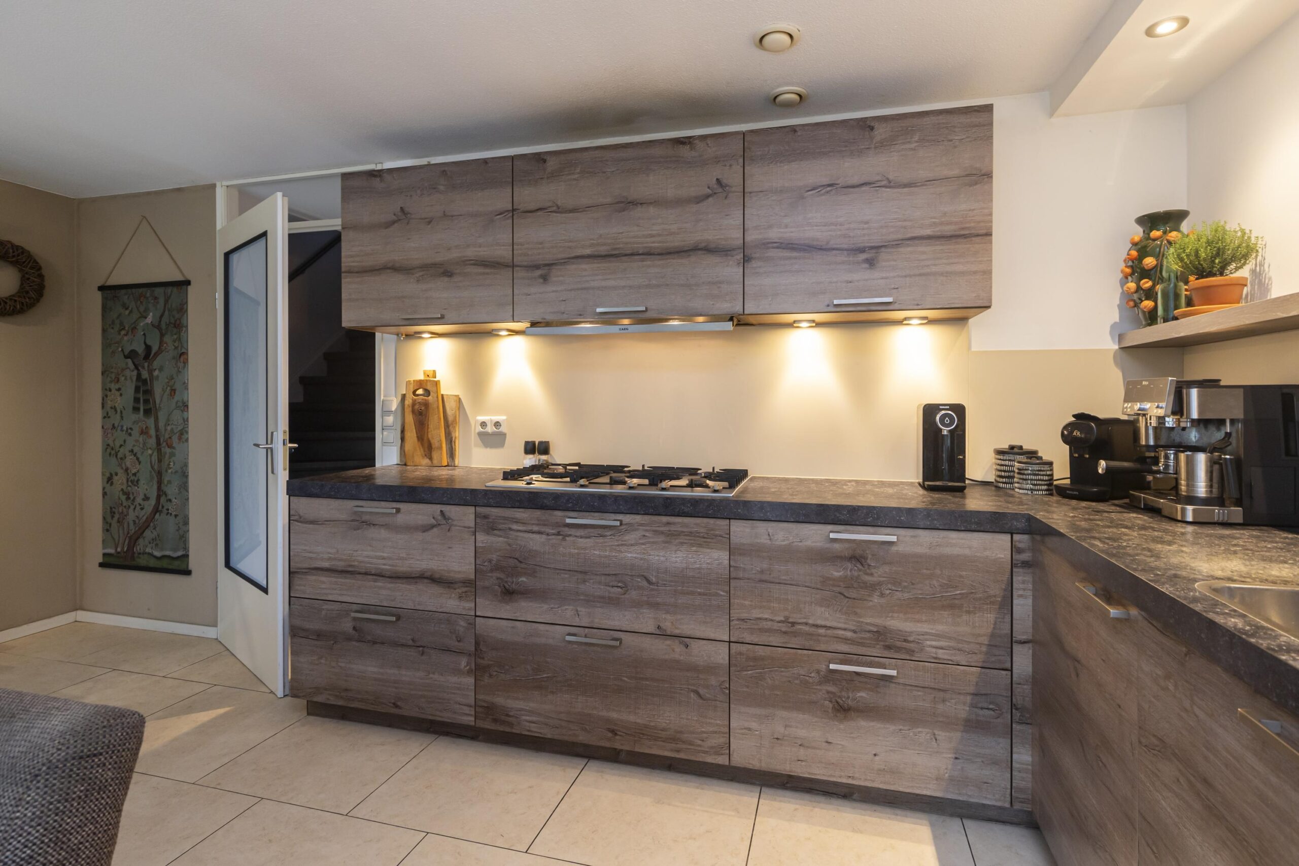 Voortuin met parkeergelegenheid voor 2 auto's (afm. ca 5 m x 4,5 m, 22,5 m2) en toegang tot de berging. Entree met hal, meterkast, toilet met fontein, wasruimte en toegang tot de garage. Vanuit de hal is de ruime woonkeuken bereikbaar, voorzien van een praktische opstelling met veel werk- en bergruimte en plek voor een grote eettafel. Vanuit de keuken loopt u zo de veranda en de achtertuin in, waar u meerdere zitjes kunt creëren.