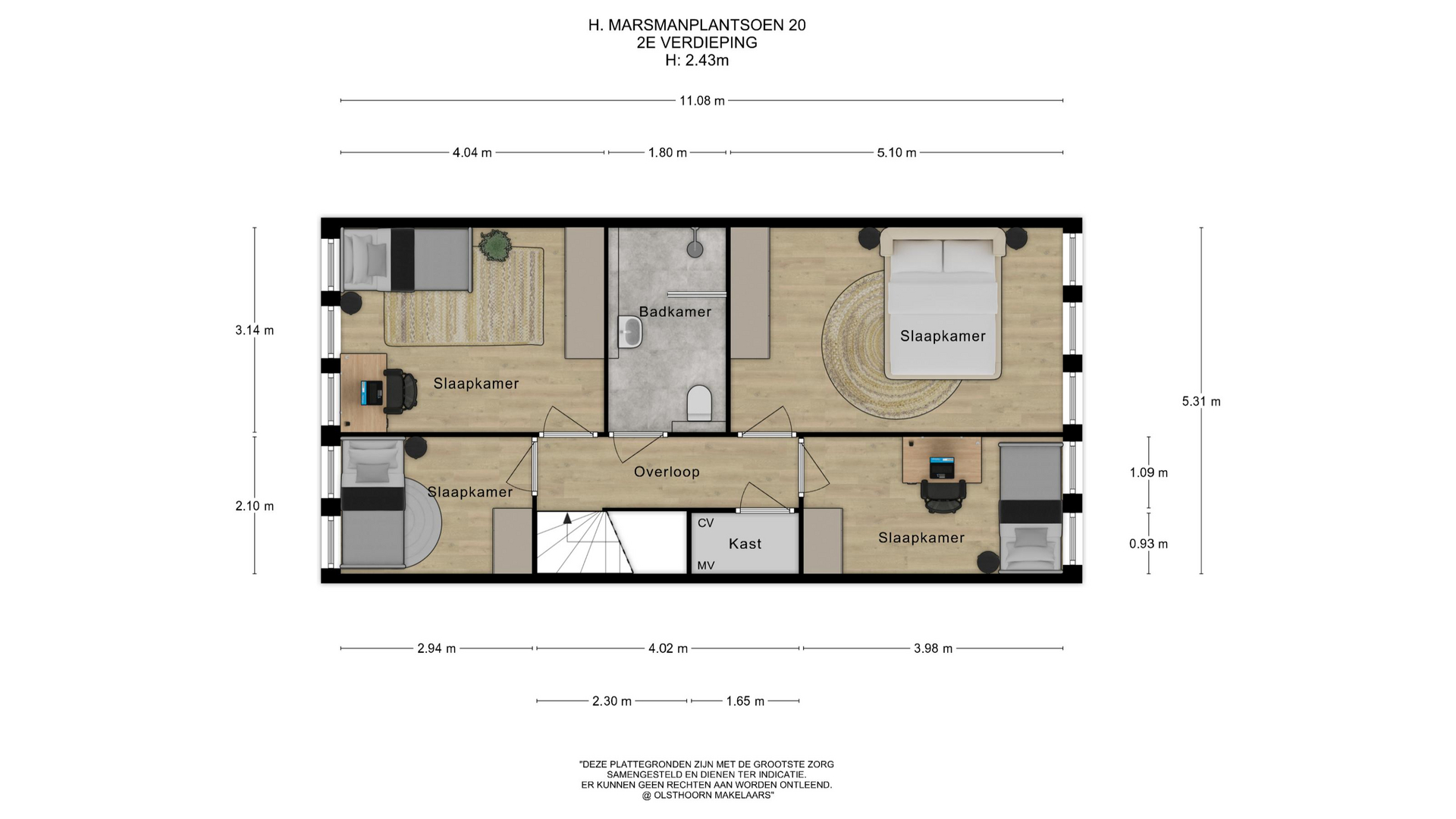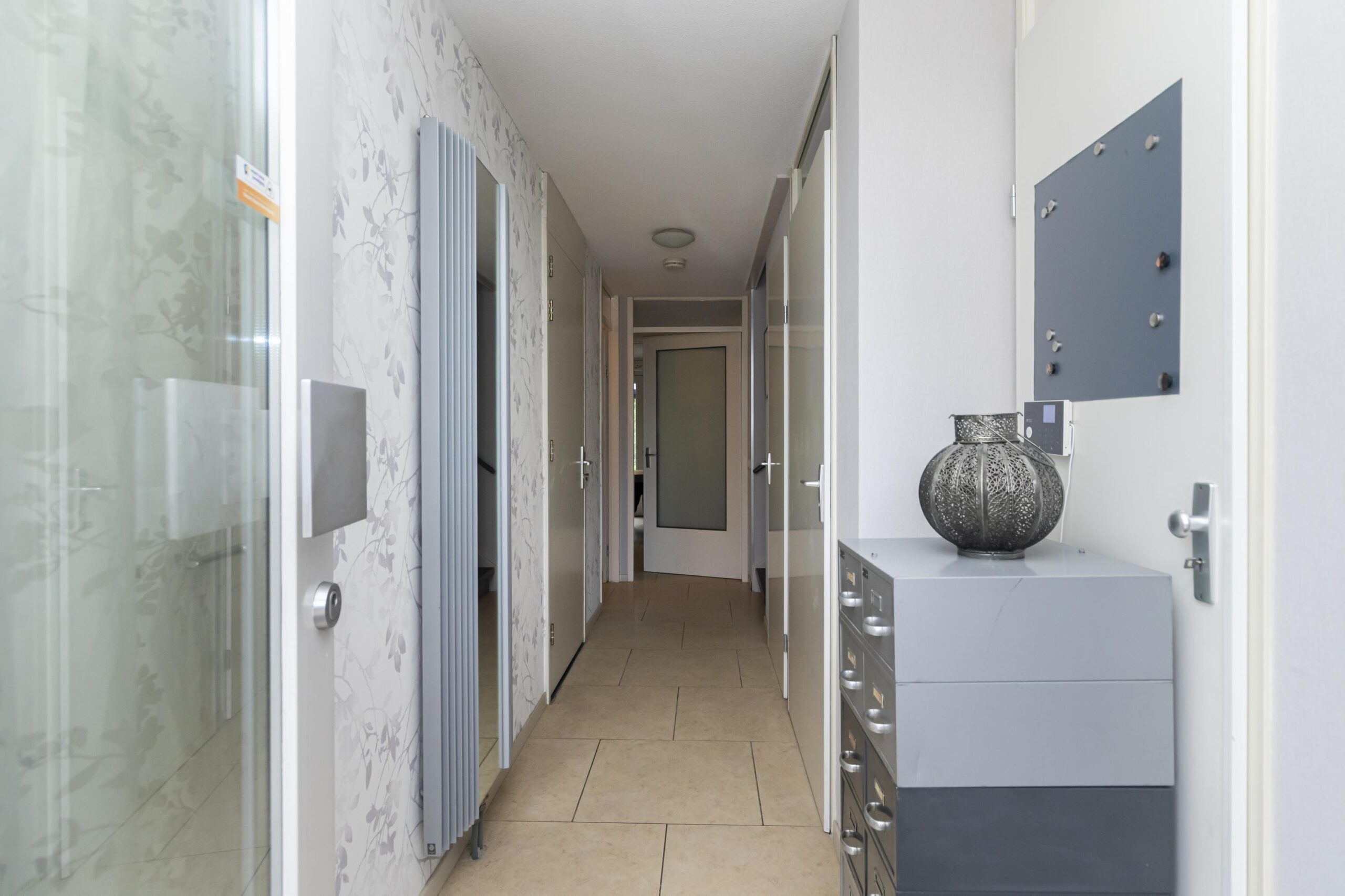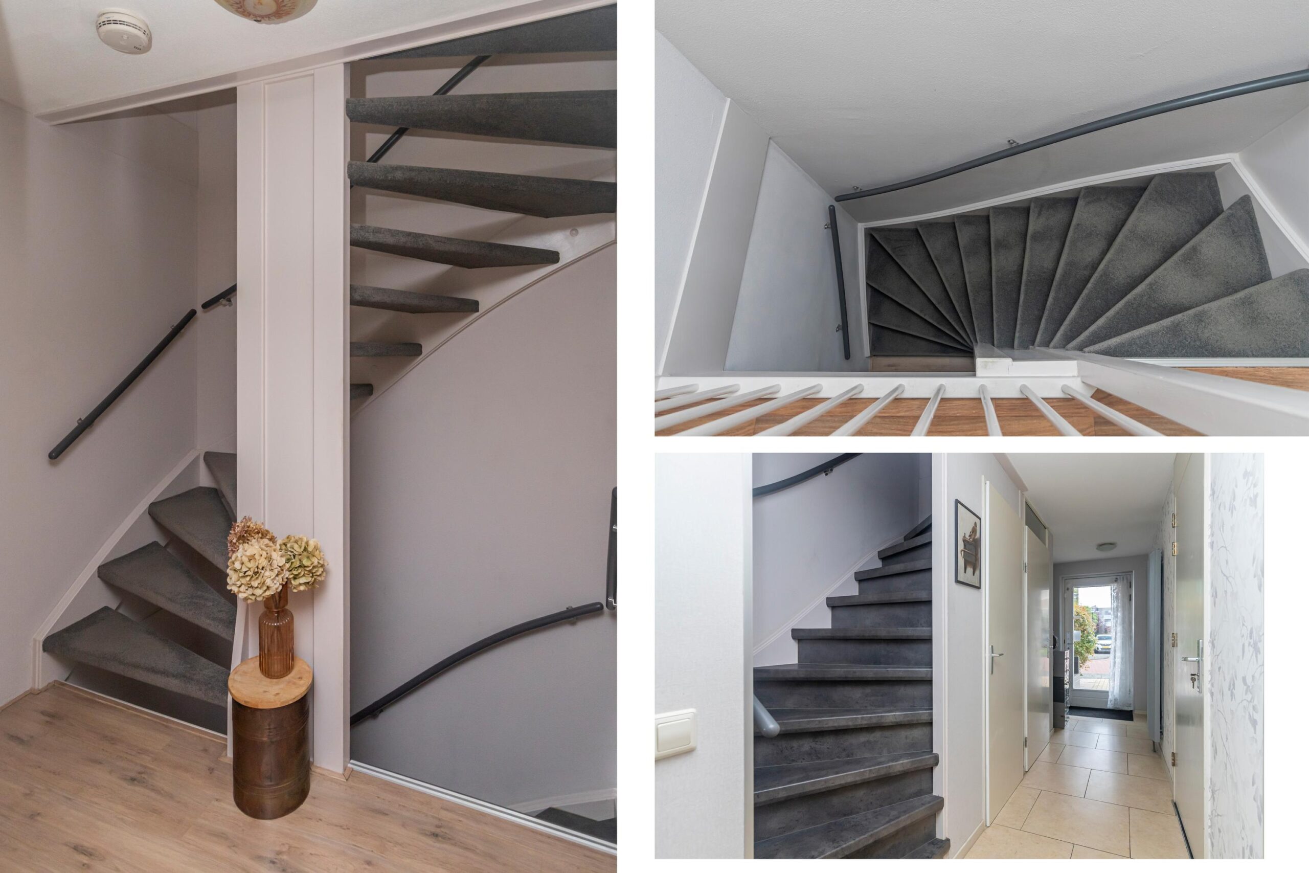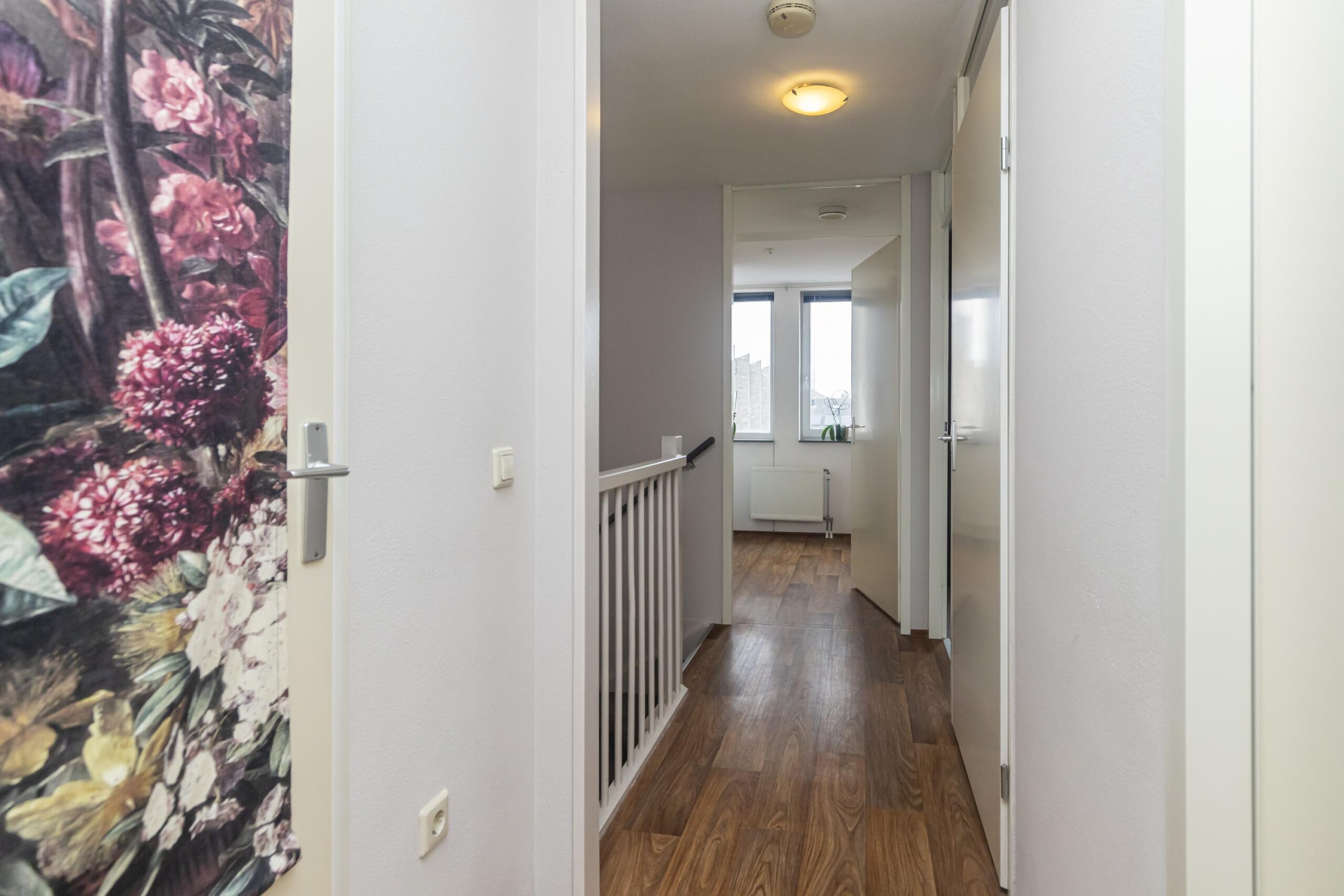 Overloop met toegang tot vier slaapkamers. De hoofdslaapkamer bevindt zich aan de achterzijde, de overige drie kamers zijn flexibel in te delen als slaap-, werk- of logeerkamer. De badkamer is centraal gelegen en voorzien van douche, wastafel en tweede toilet.