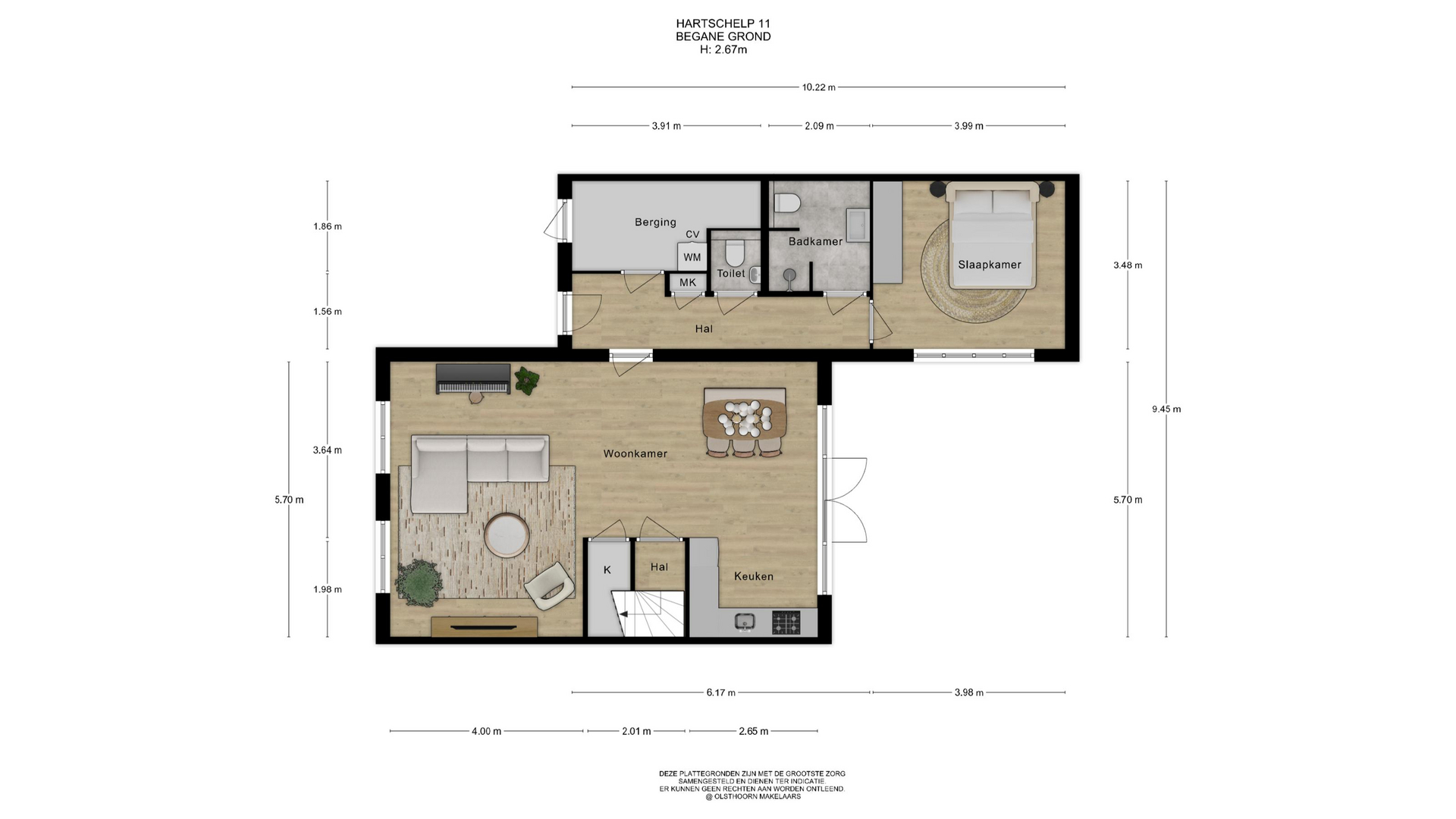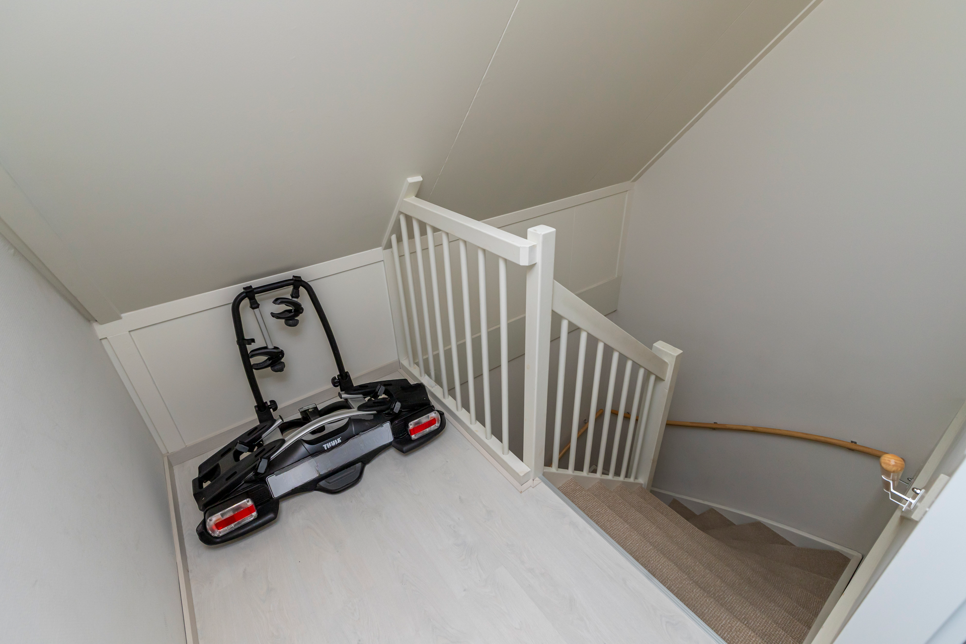 Je komt binnen in de hal met toegang tot de inpandige berging (vloerverwarming en elektra-aansluiting). Hier vind je de cv-combiketel, mechanische ventilatie-unit en aansluiting voor de wasmachine. Praktisch is ook de deur naar buiten: ideaal voor bijvoorbeeld fietsen, strandspullen en tuingereedschap.