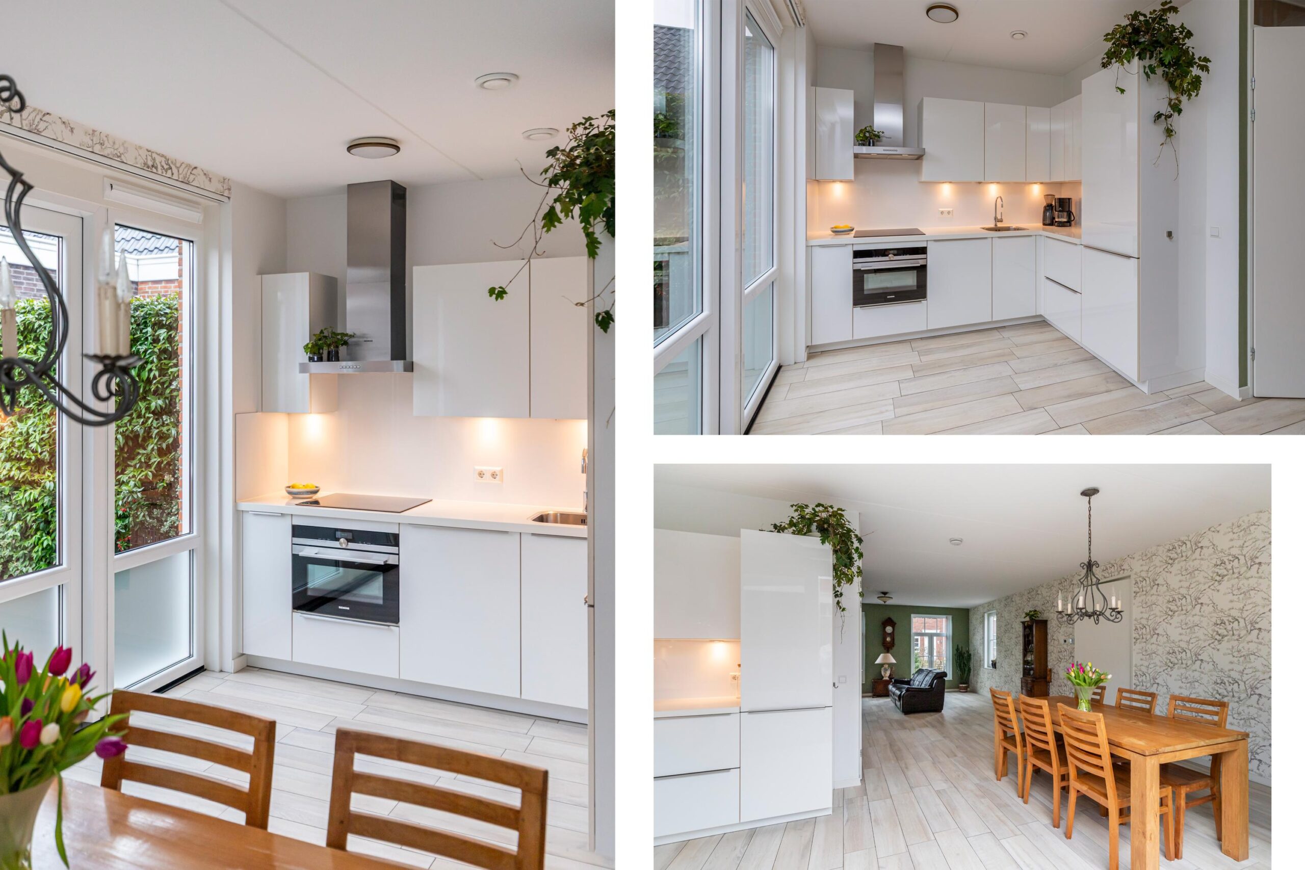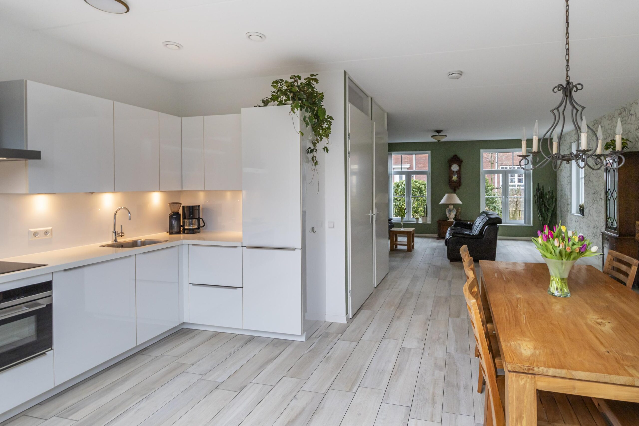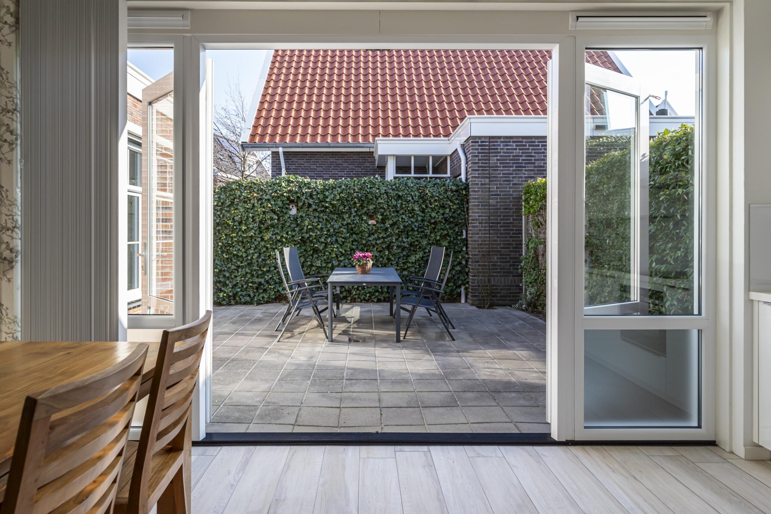 Vanuit de keuken loop je via twee openslaande deuren de tuin in.
