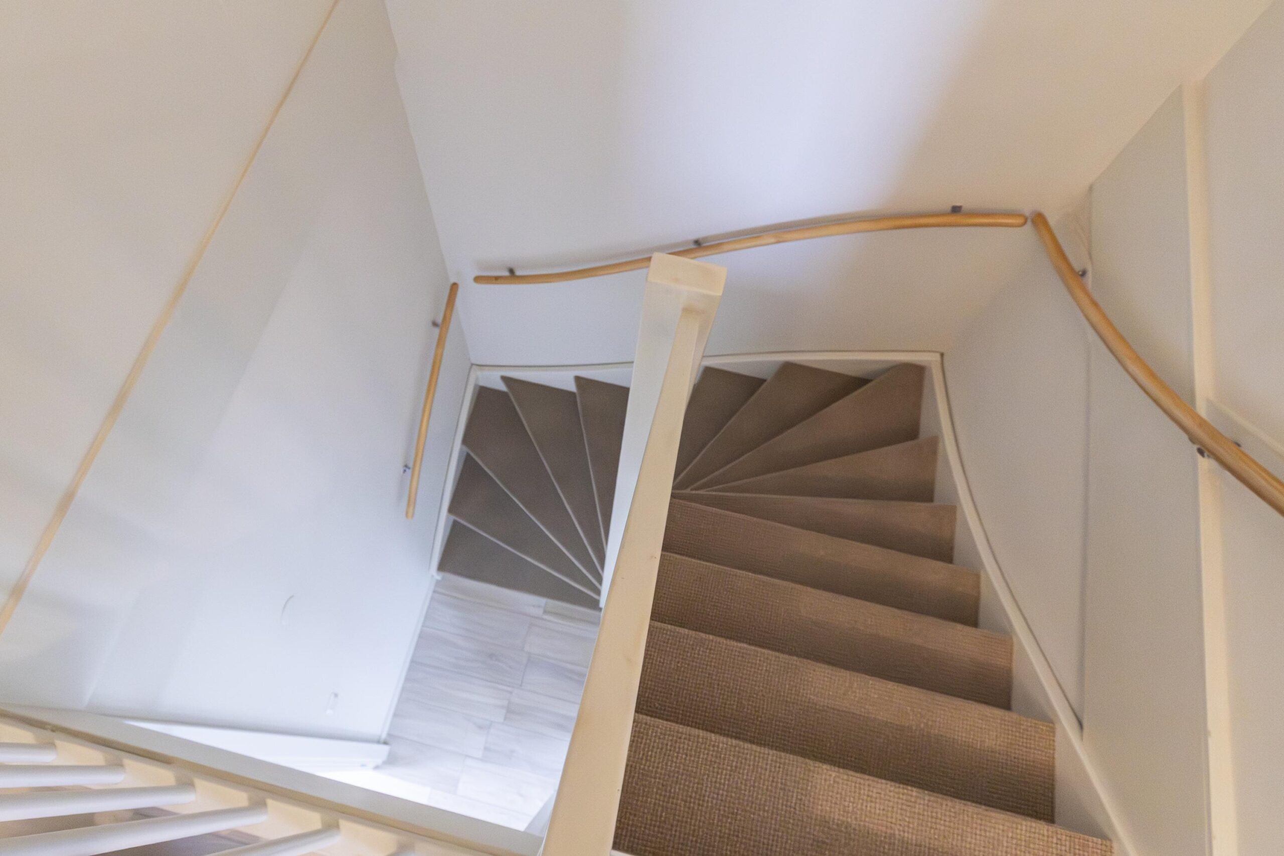 De kolom met trapkast en trapopgang zorgt voor een natuurlijke scheiding tussen koken en ontspannen, zonder dat je het contact met elkaar verliest.