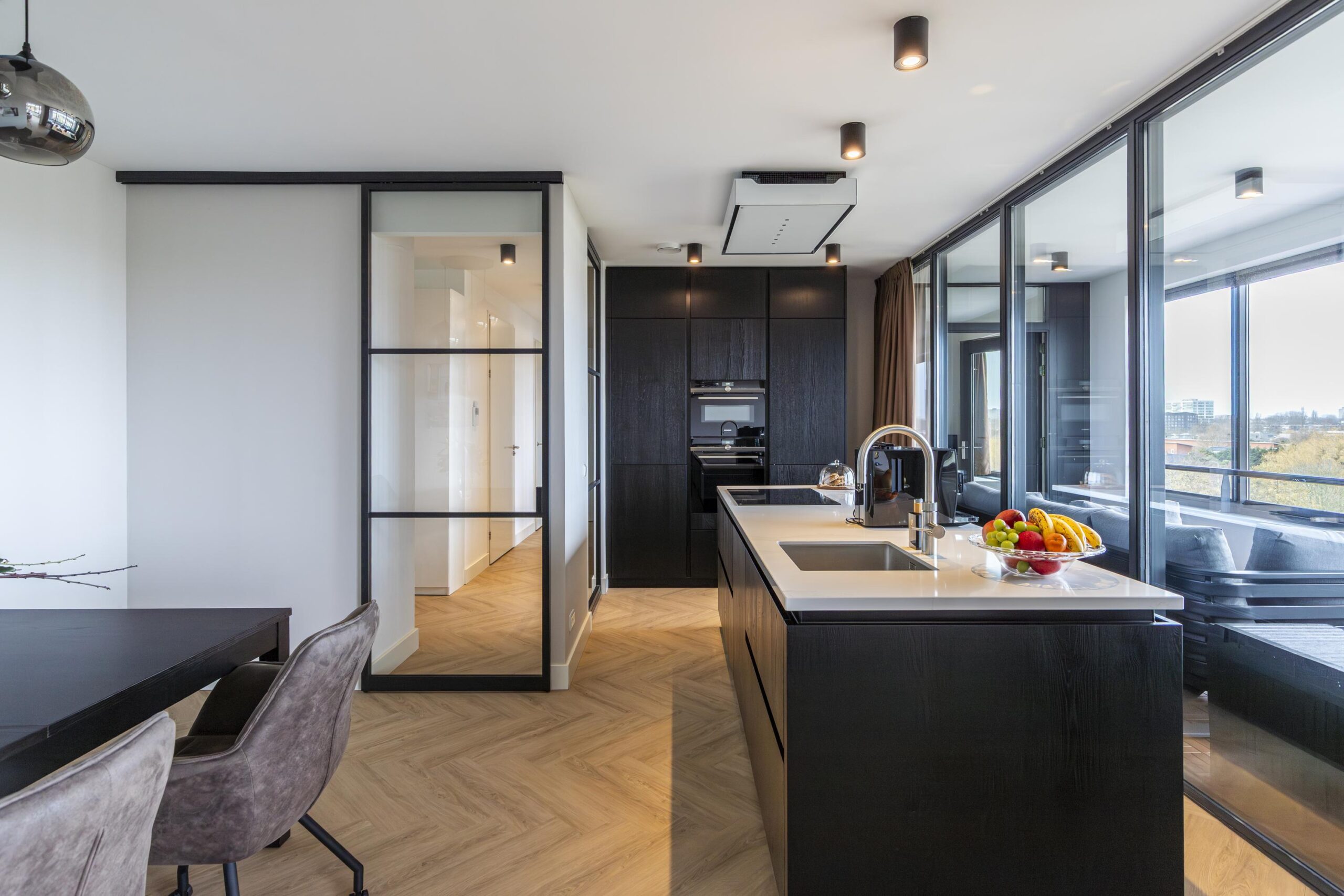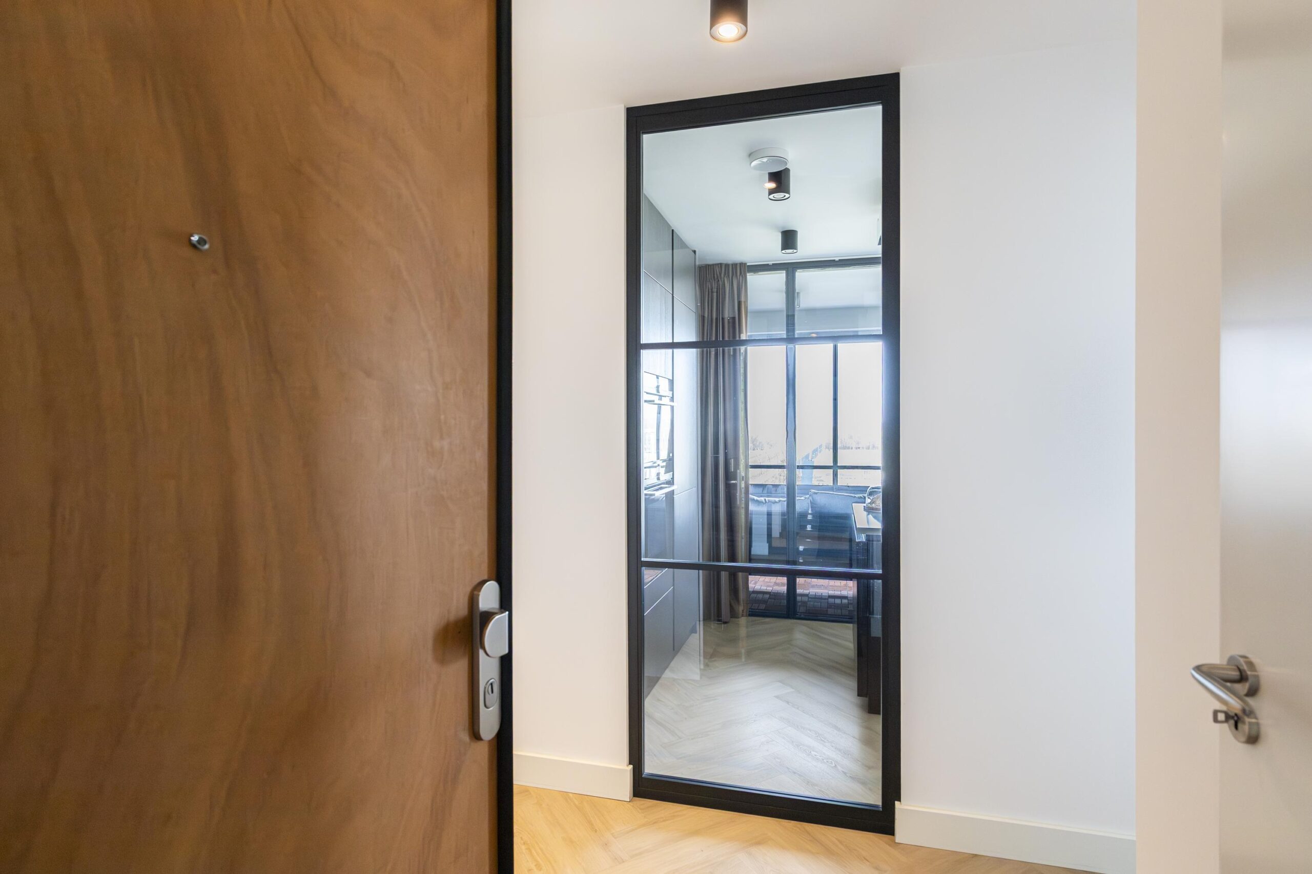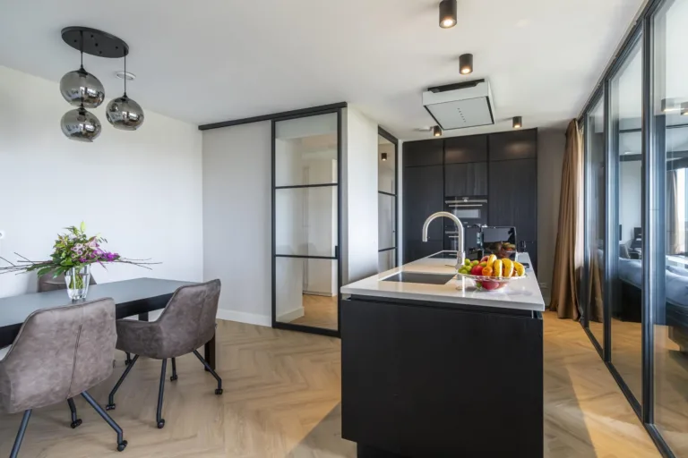 Je komt binnen in een lichte hal met ruimte voor een garderobe en toegang tot de meterkast. Dankzij het glazen kozijn in de hal ontstaat een mooie zichtlijn richting de keuken en de leefruimte, wat zorgt voor een open en ruimtelijk gevoel. Via een glazen schuifdeur bereik je de royale woonkeuken en woonkamer. De leefruimte is breed opgezet en dankzij de grote raampartijen opvallend licht. Door het gehele appartement ligt een doorlopende PVC visgraatvloer in een neutrale tint, geplaatst op een extra geluidsisolerende ondervloer.