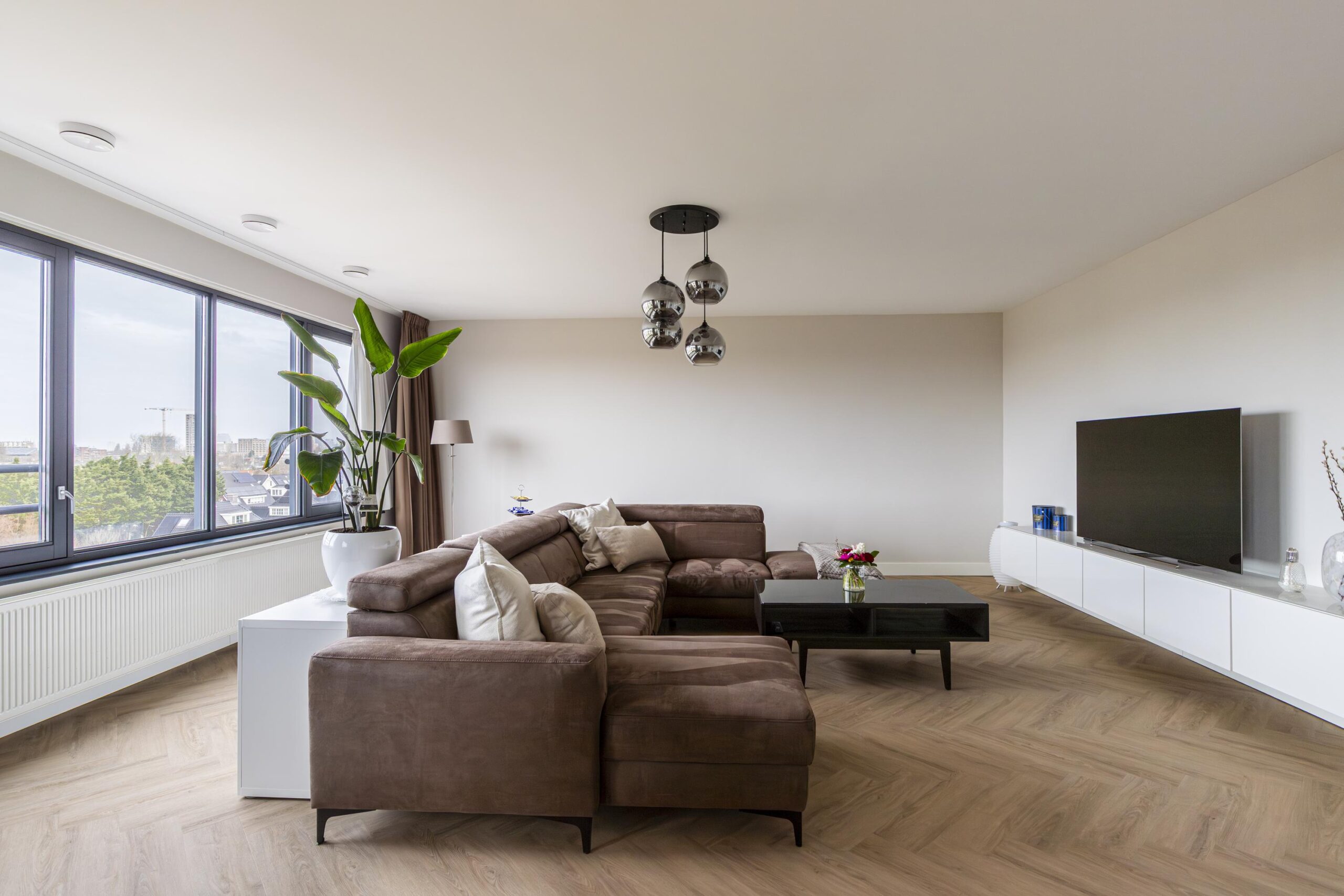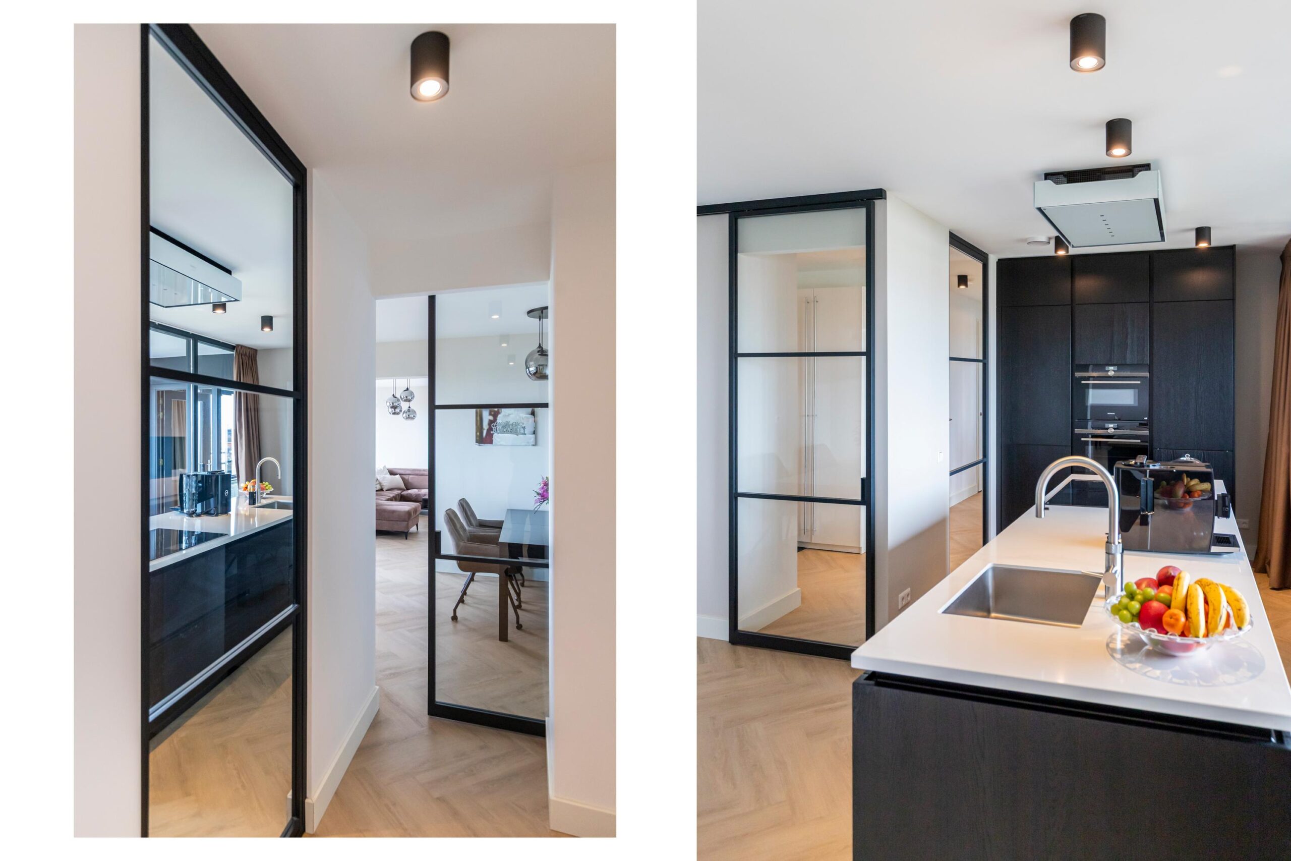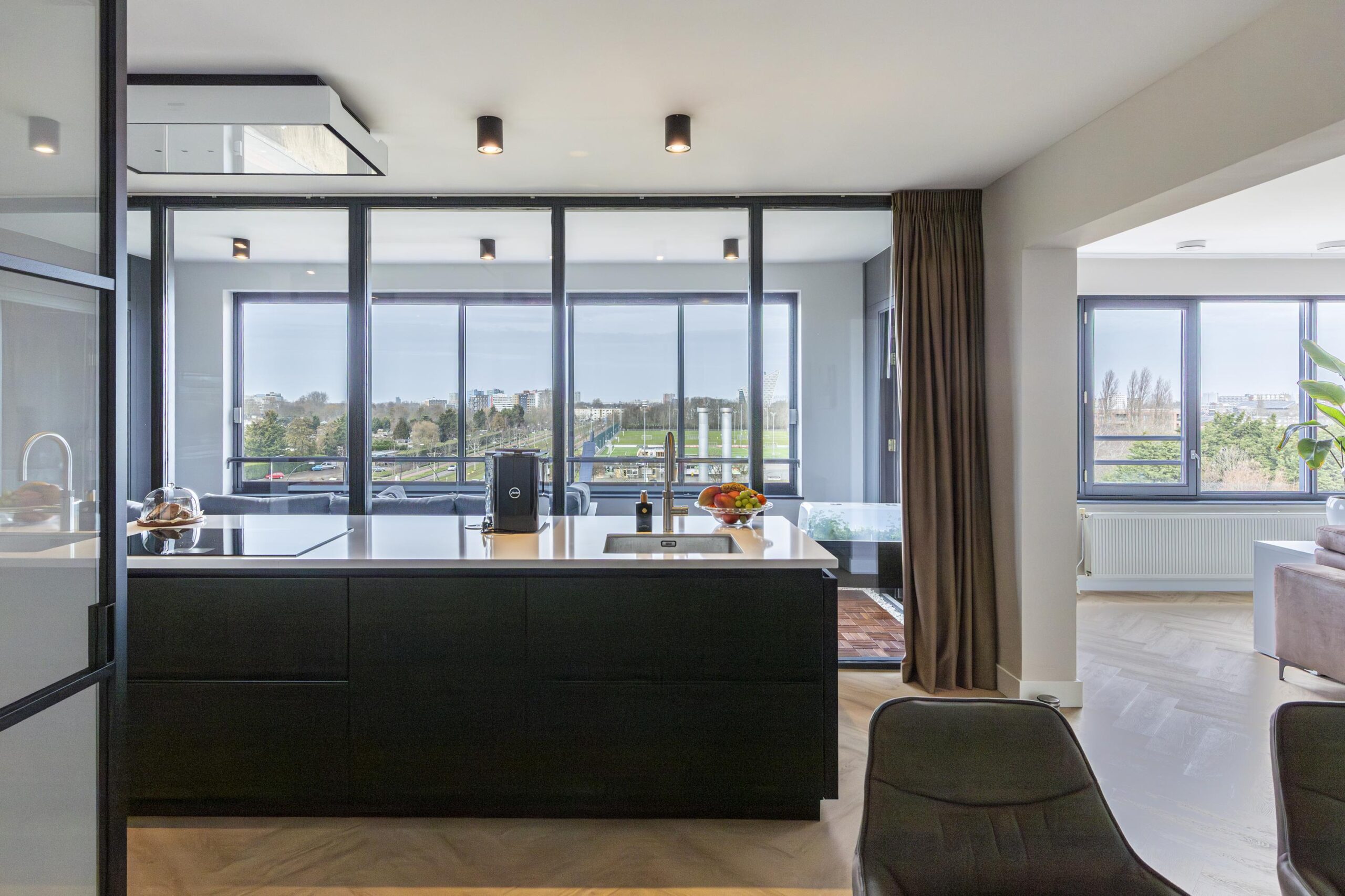 Je komt binnen in een lichte hal met ruimte voor een garderobe en toegang tot de meterkast. Dankzij het glazen kozijn in de hal ontstaat een mooie zichtlijn richting de keuken en de leefruimte, wat zorgt voor een open en ruimtelijk gevoel. Via een glazen schuifdeur bereik je de royale woonkeuken en woonkamer. De leefruimte is breed opgezet en dankzij de grote raampartijen opvallend licht. Door het gehele appartement ligt een doorlopende PVC visgraatvloer in een neutrale tint, geplaatst op een extra geluidsisolerende ondervloer.