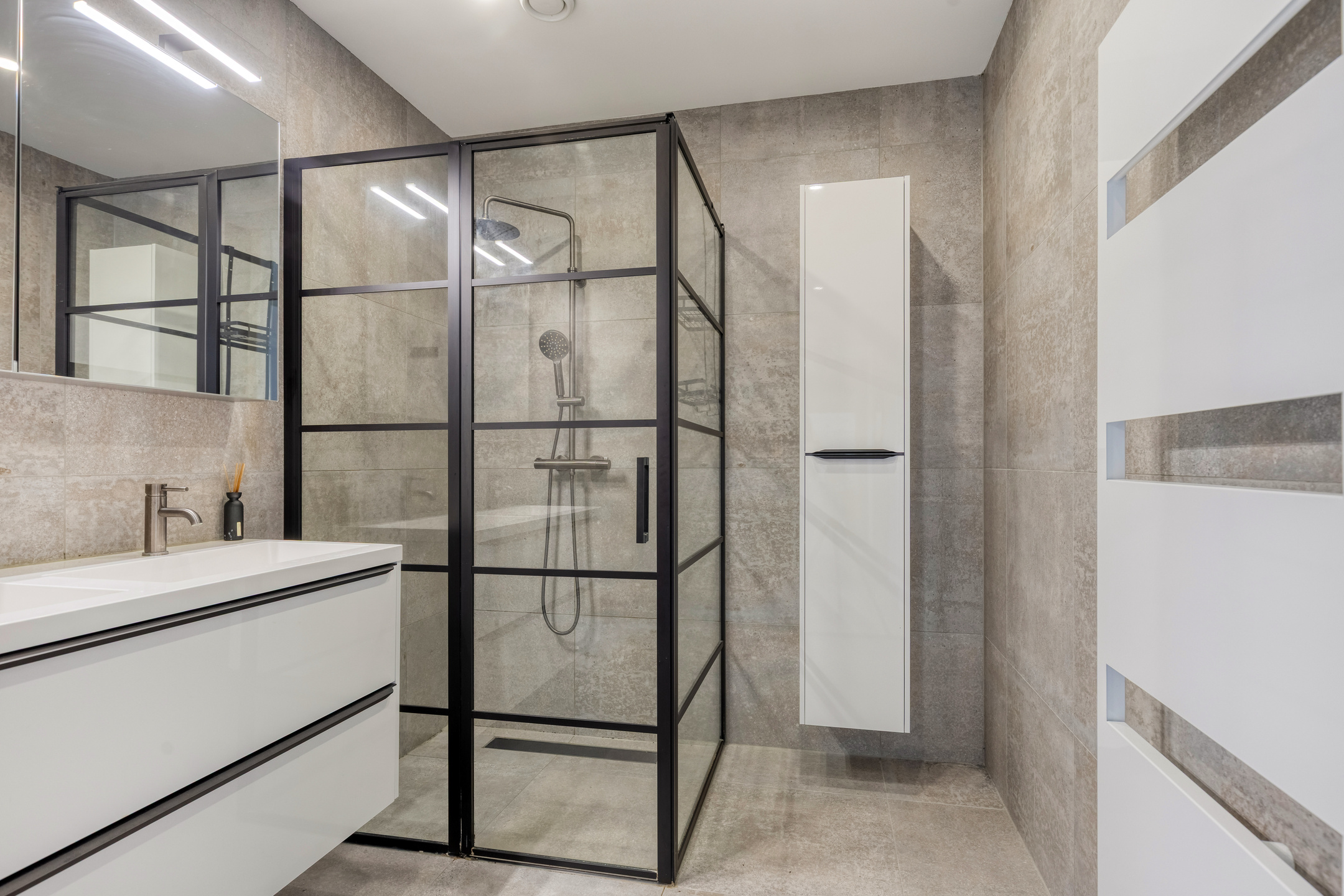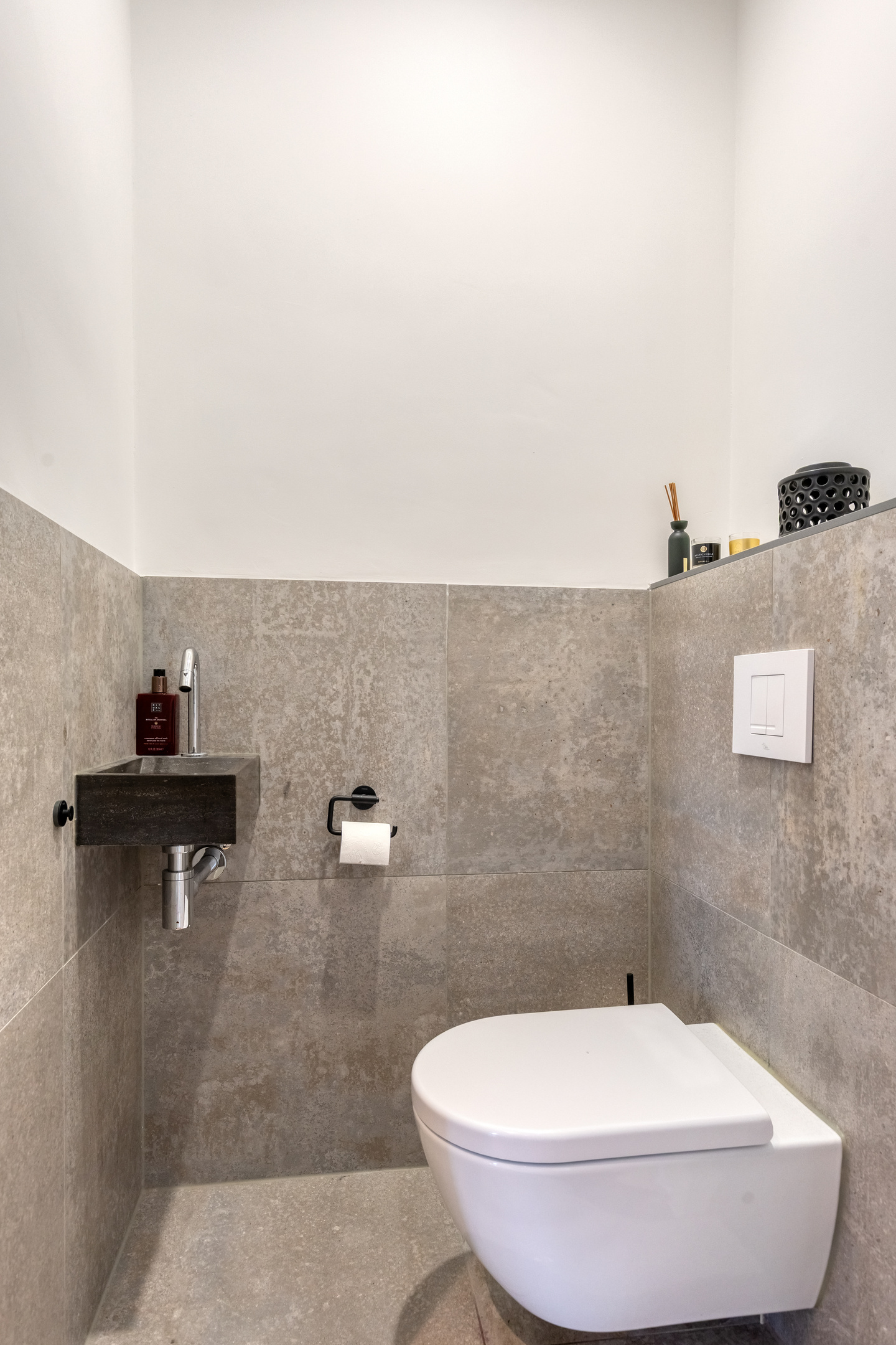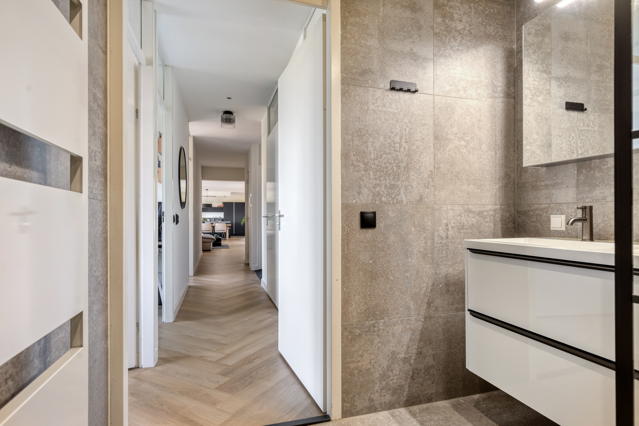Entree in de hal met meterkast. Hier zijn ook een vaste kast met wasmachine- en drogeraansluiting, een vaste kast met planken en een modern separaat toilet met fonteintje aanwezig. Het toilet is strak afgewerkt en geheel in een eigentijdse stijl uitgevoerd.