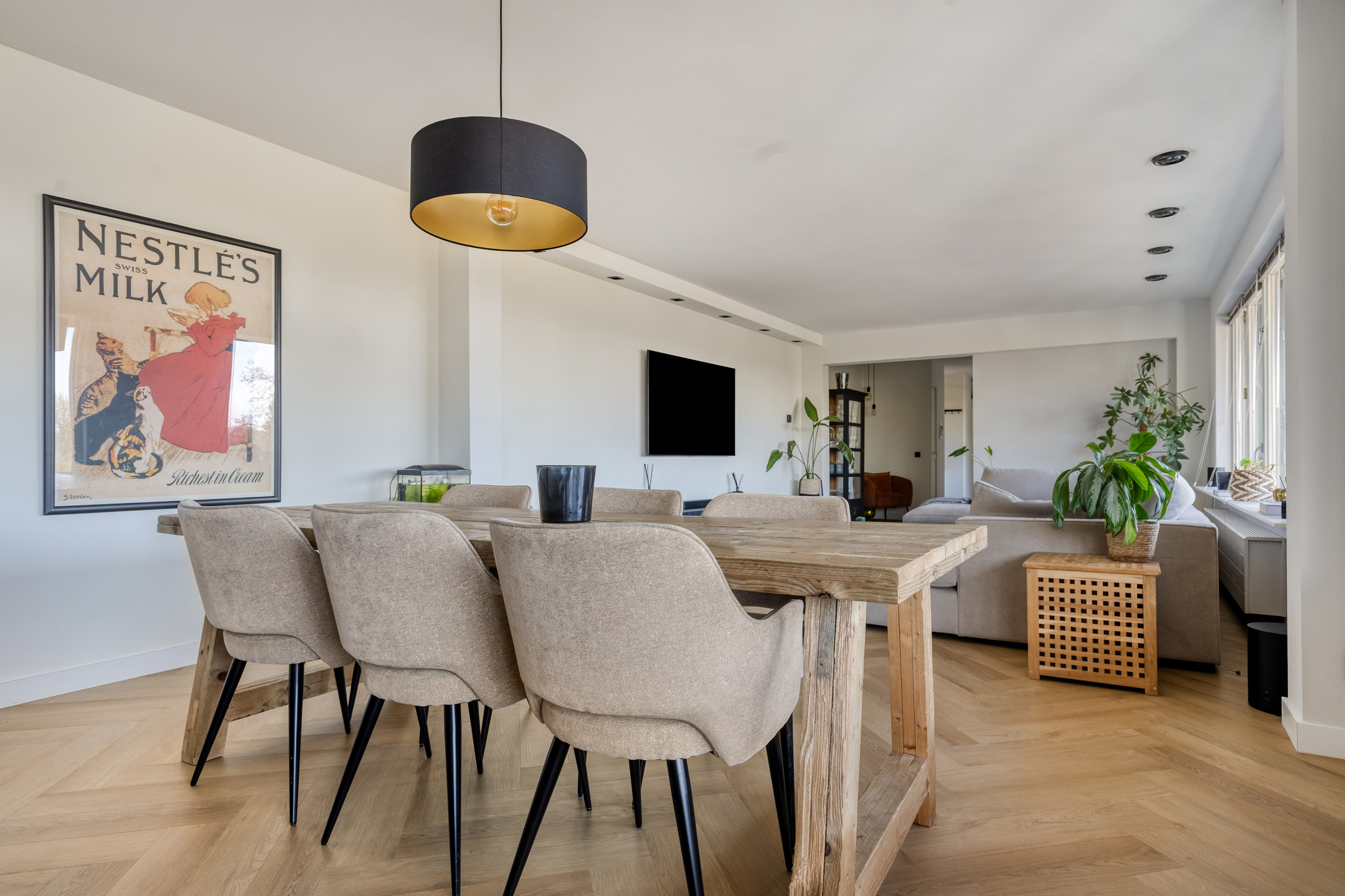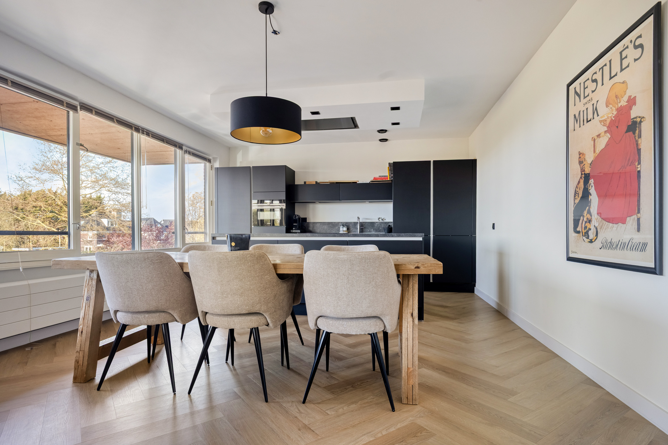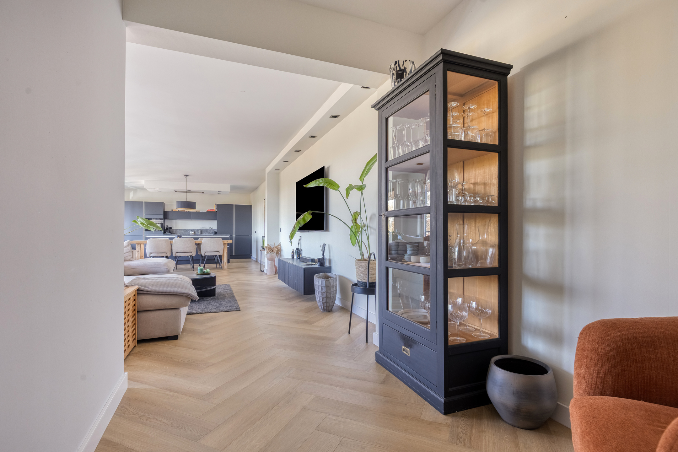Vanuit de hal toegang tot de woon-/eetkamer, een indrukwekkende leefruimte met grote ramen over de volle breedte. Hierdoor valt veel daglicht naar binnen en ontstaat een open en rustige sfeer. De woonkamer en eetkamer lopen mooi in elkaar over en vormen samen een heerlijke plek om te ontspannen, eten en gasten te ontvangen. De ruimte is afgewerkt met een fraaie visgraat PVC vloer, die bijdraagt aan de moderne en warme uitstraling van het appartement.