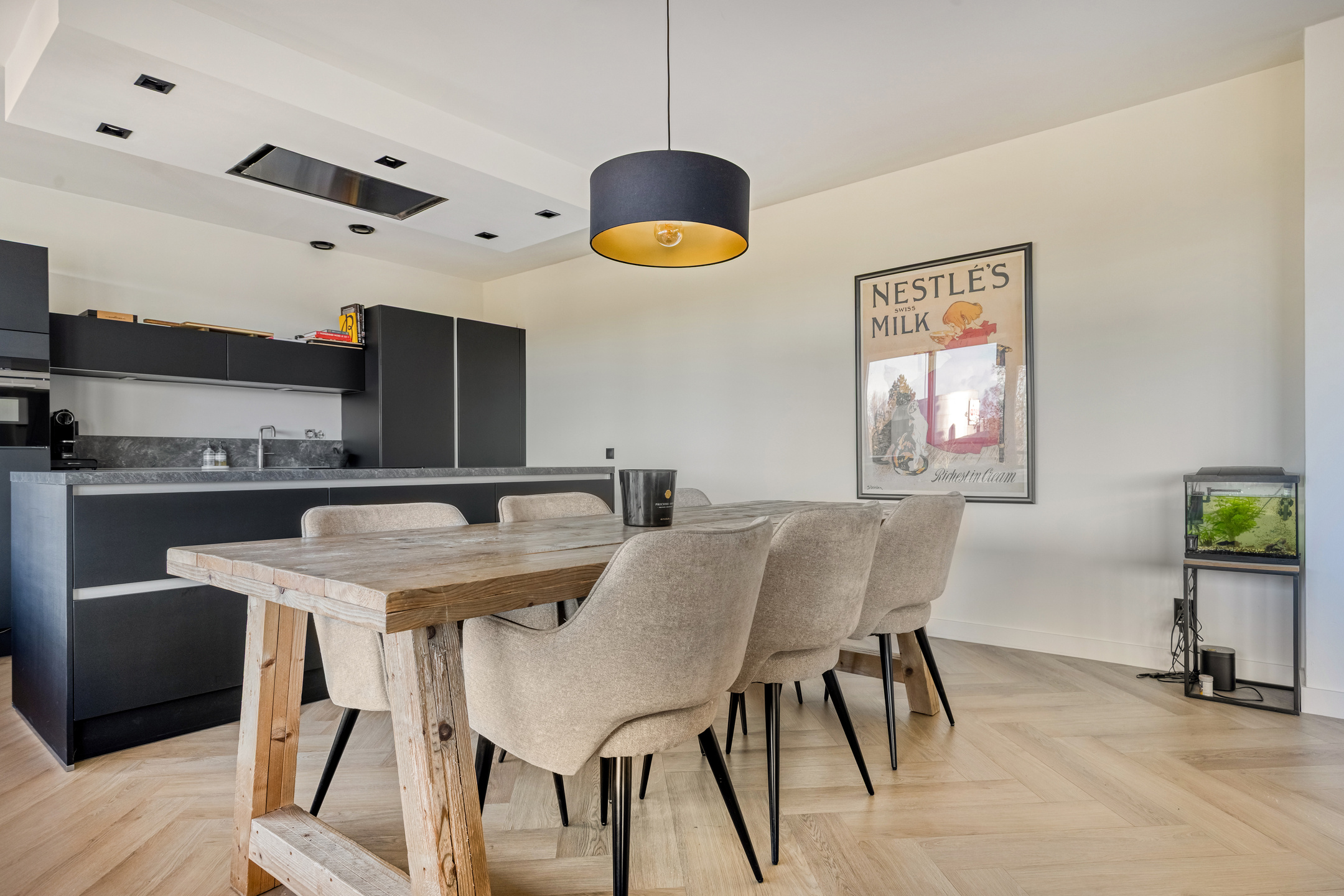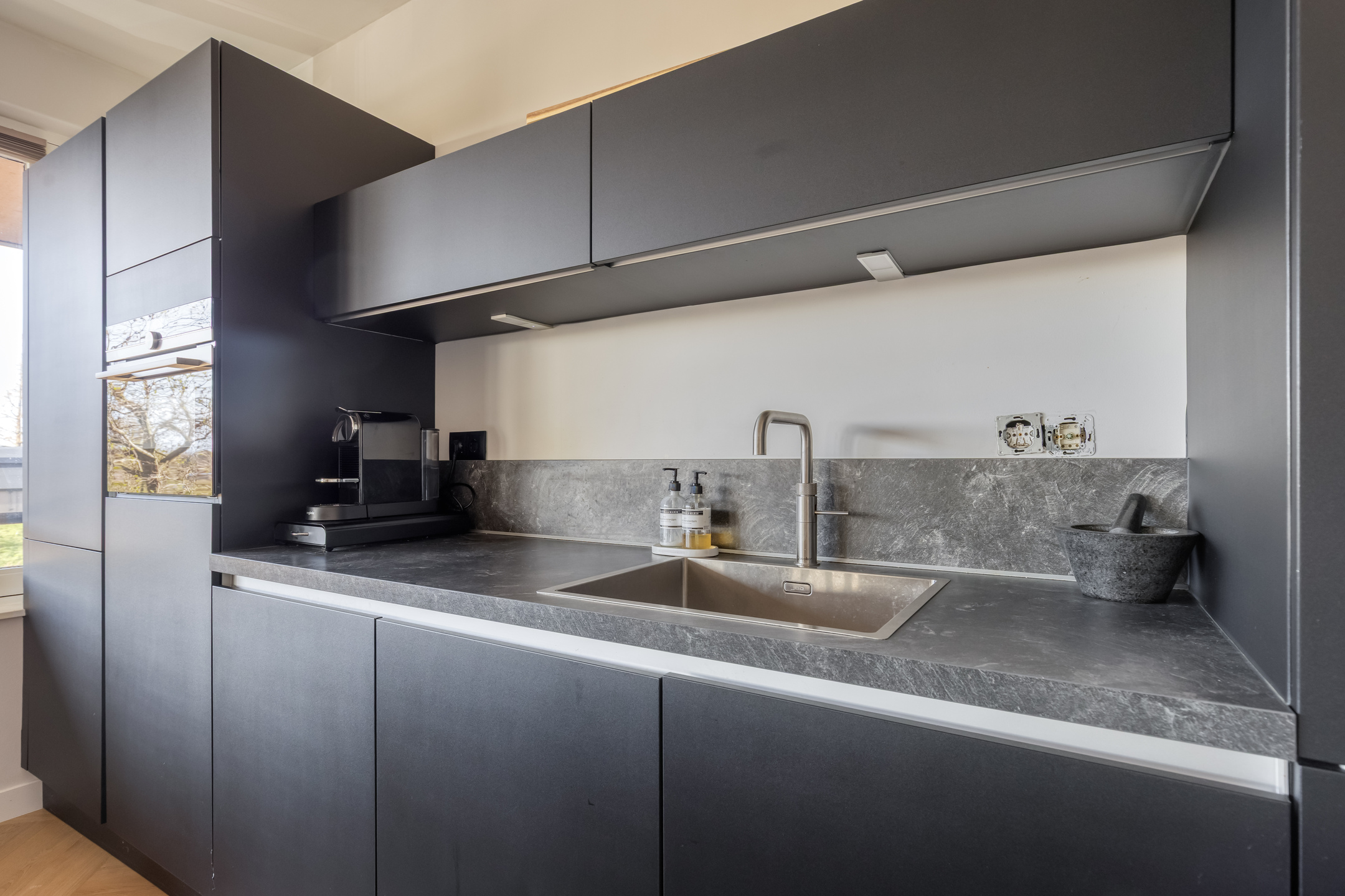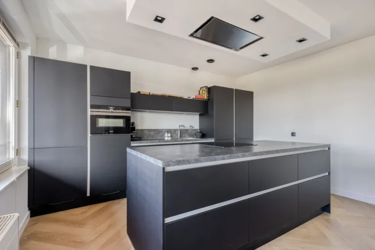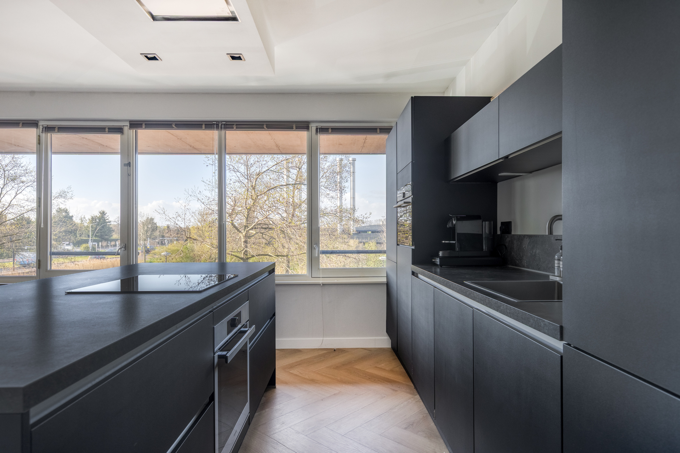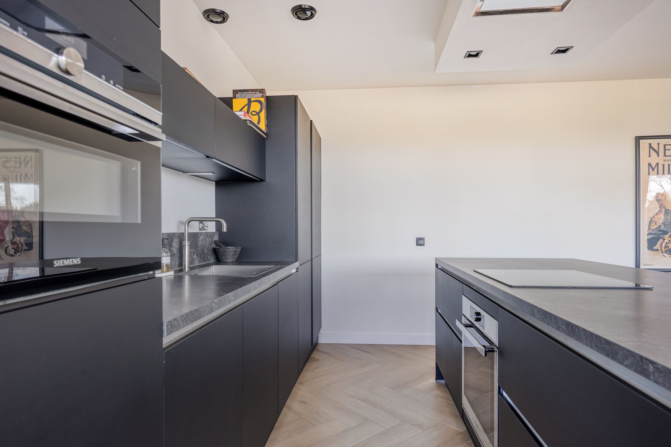 De open keuken sluit perfect aan op de leefruimte en heeft een modern ontwerp met donker frontwerk en een ruim kookeiland. De keuken is ingericht met diverse inbouwapparatuur en heeft volop werk- en bergruimte. Een fijne plek voor wie van koken en samenzijn houdt.