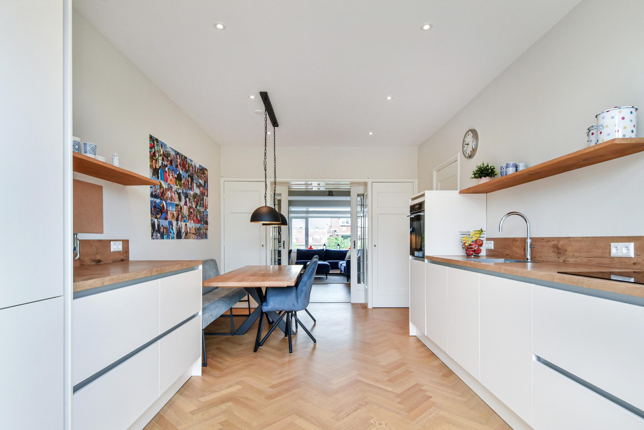 Om vervolgens naar de ruime woonkamer te gaan. De woonkamer heeft aan achterzijde een fijne woonkeuken om met de gehele familie lang te kunnen tafelen en aan de voorzijde een ruime zitkamer om te relaxen. Deze zijn te scheiden door middel van de originele schuifseparatie. Waarin tevens de praktische bergkasten zitten.