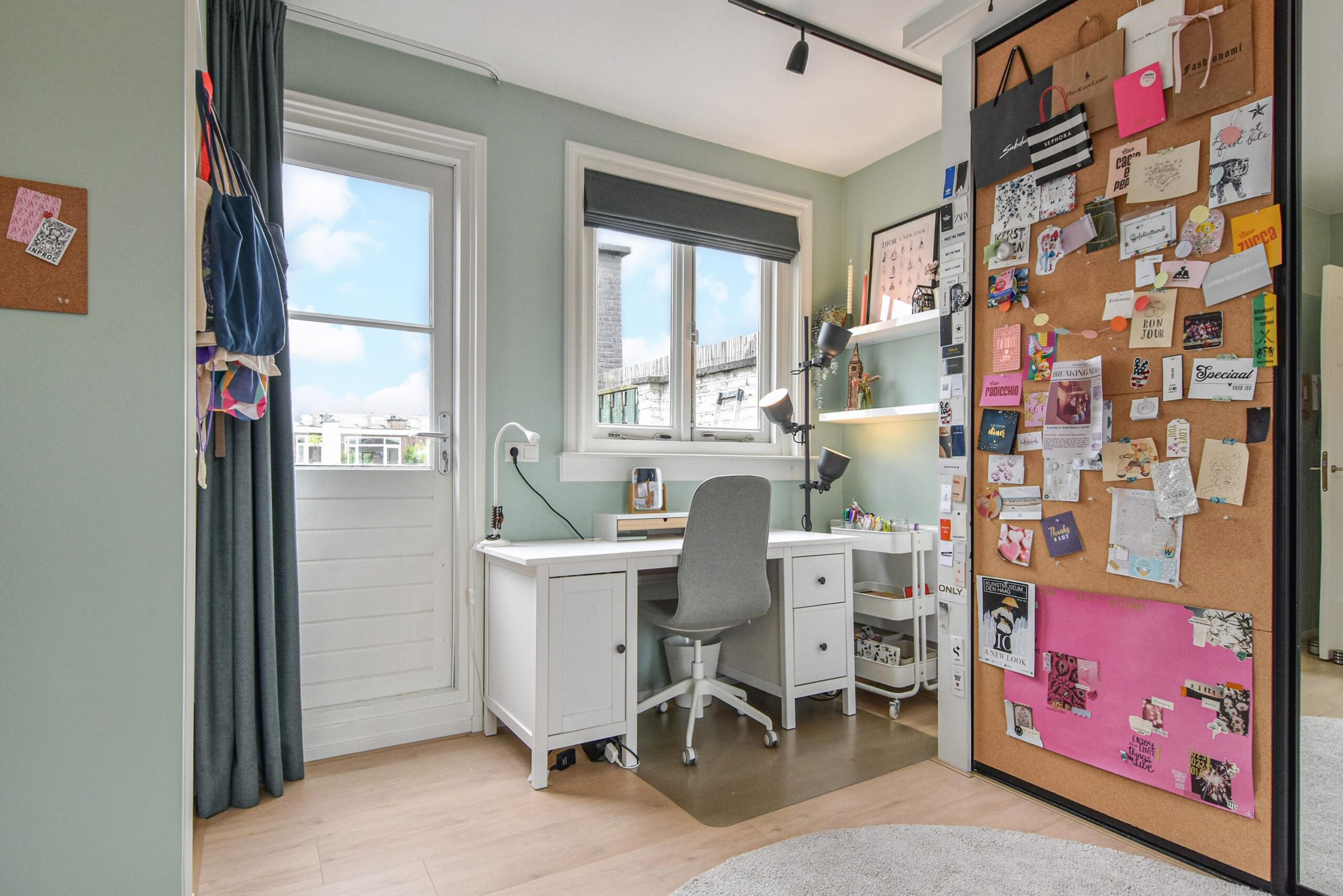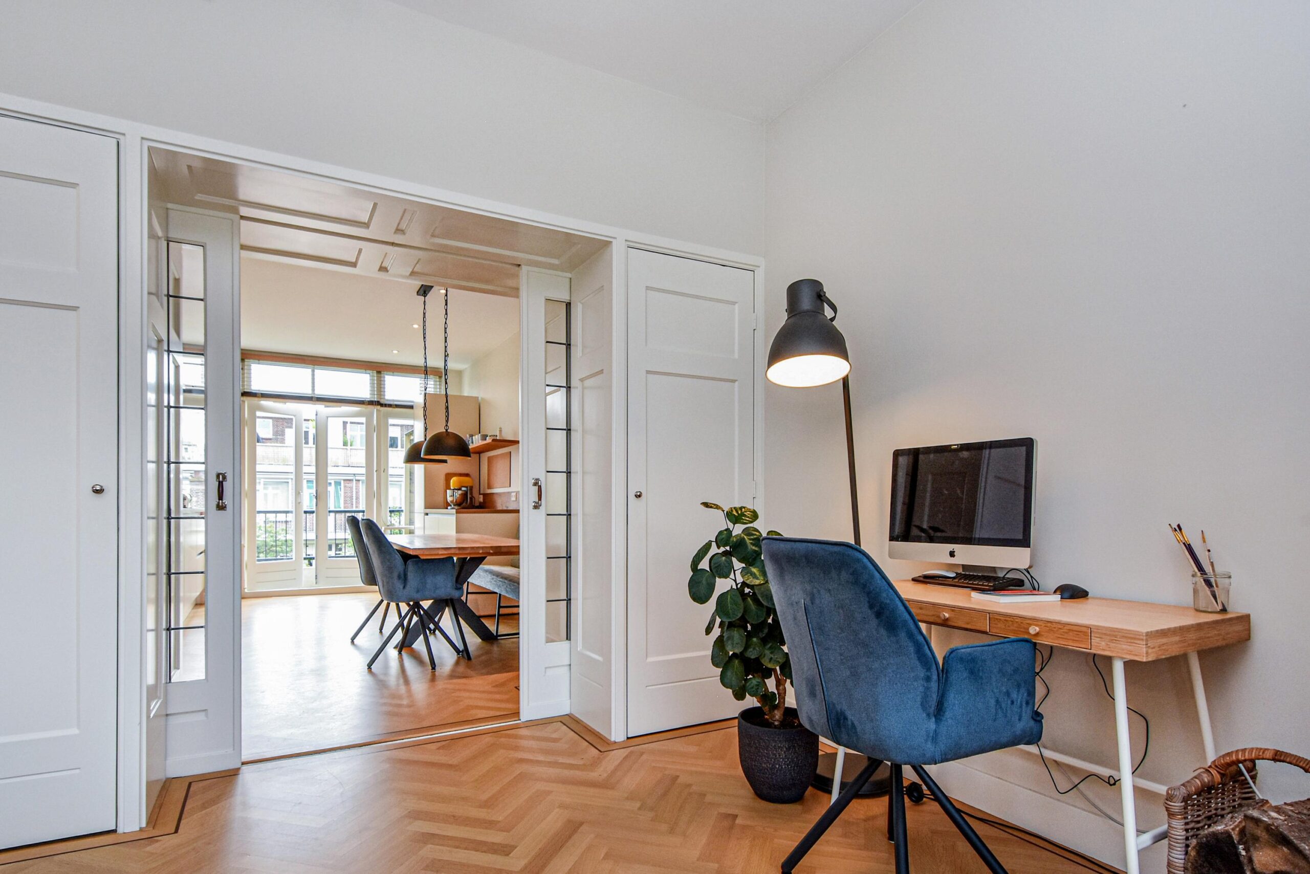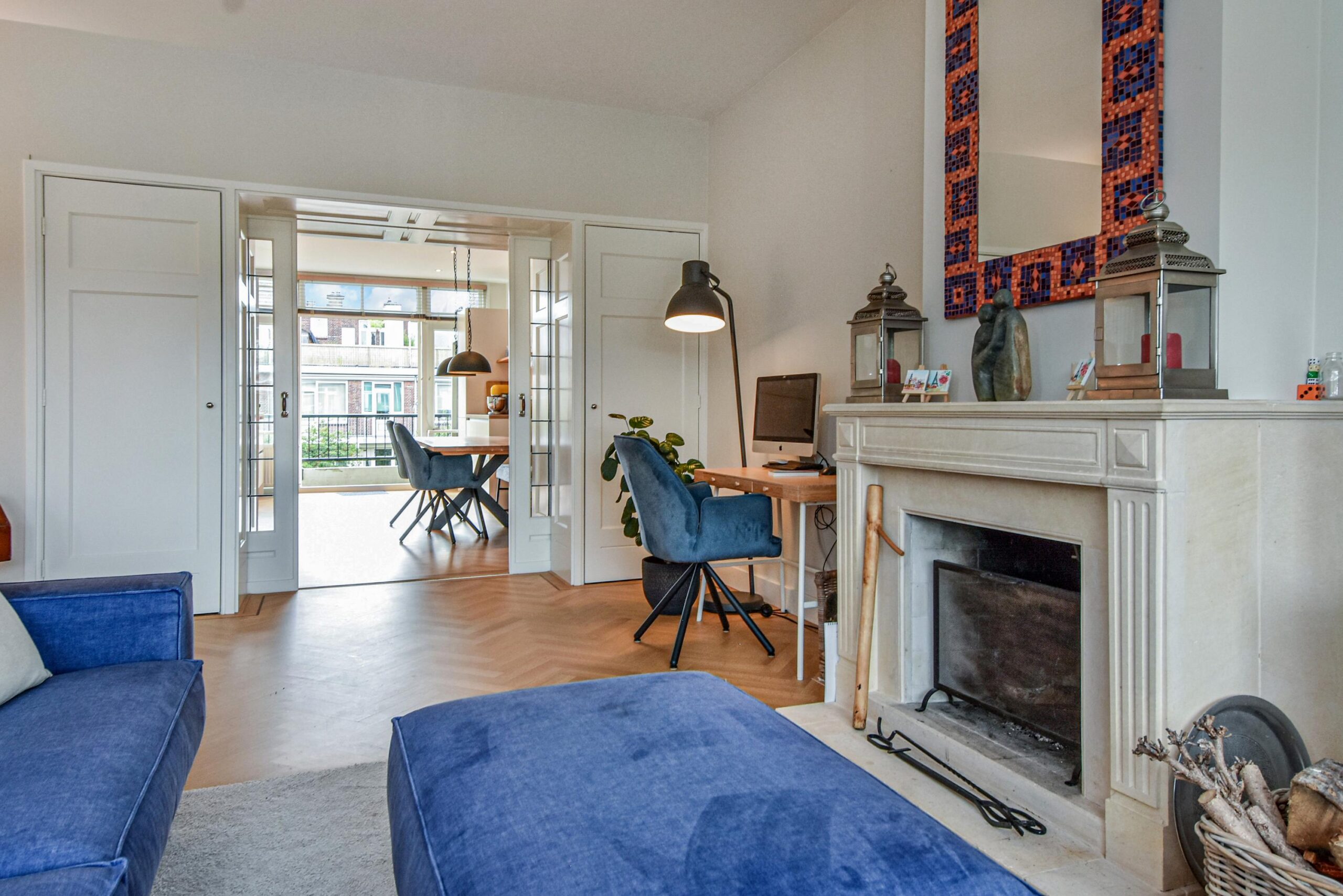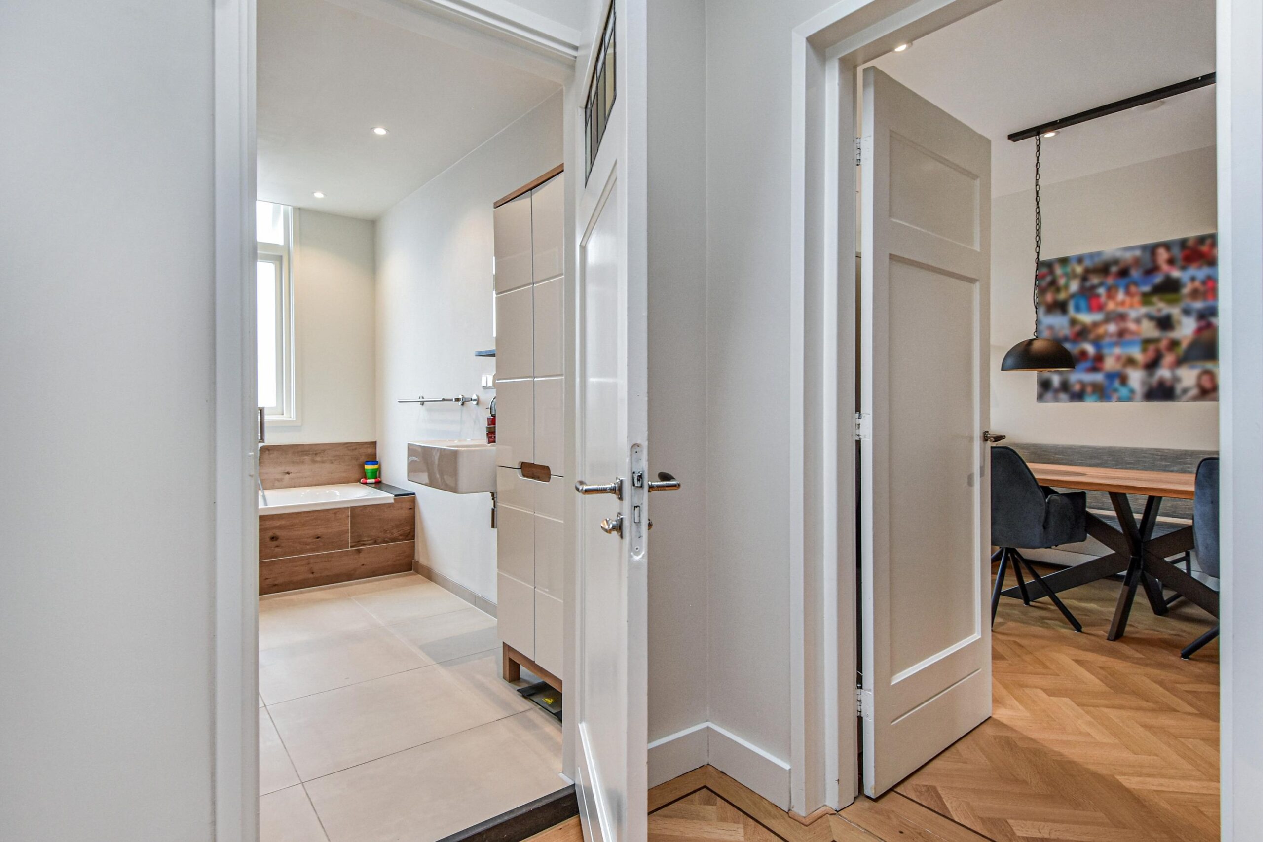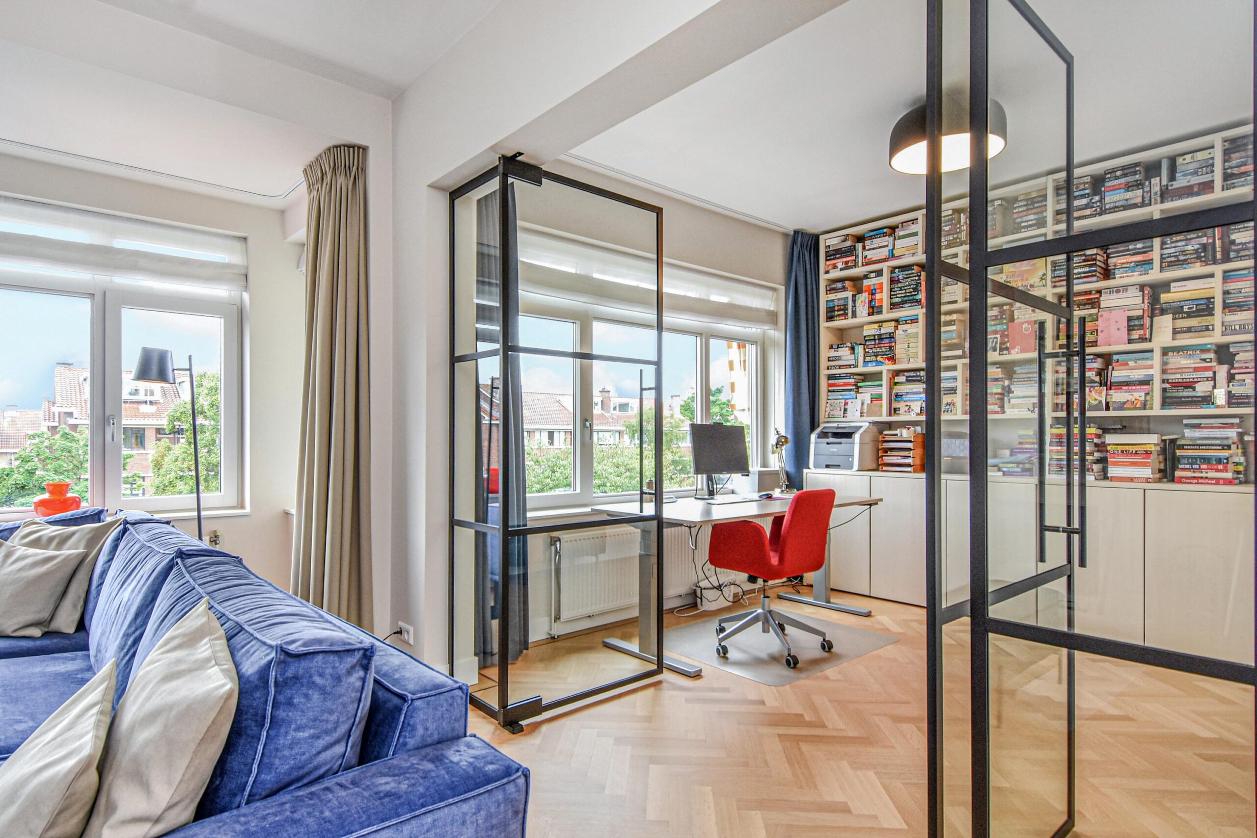 In de zitkamer is een open haard met fraaie kalkzandsteen schouw. En vanuit de erker een weids uitzicht over het plantsoen met waterpartij. De zijkamer is door een moderne separatie van zwart steel-look deuren gescheiden van de zitkamer. Daardoor voor diverse doeleinden te gebruiken. Denk hierbij aan een thuiswerkplek, een speelkamer voor de kinderen of bijvoorbeeld een muziekkamer.