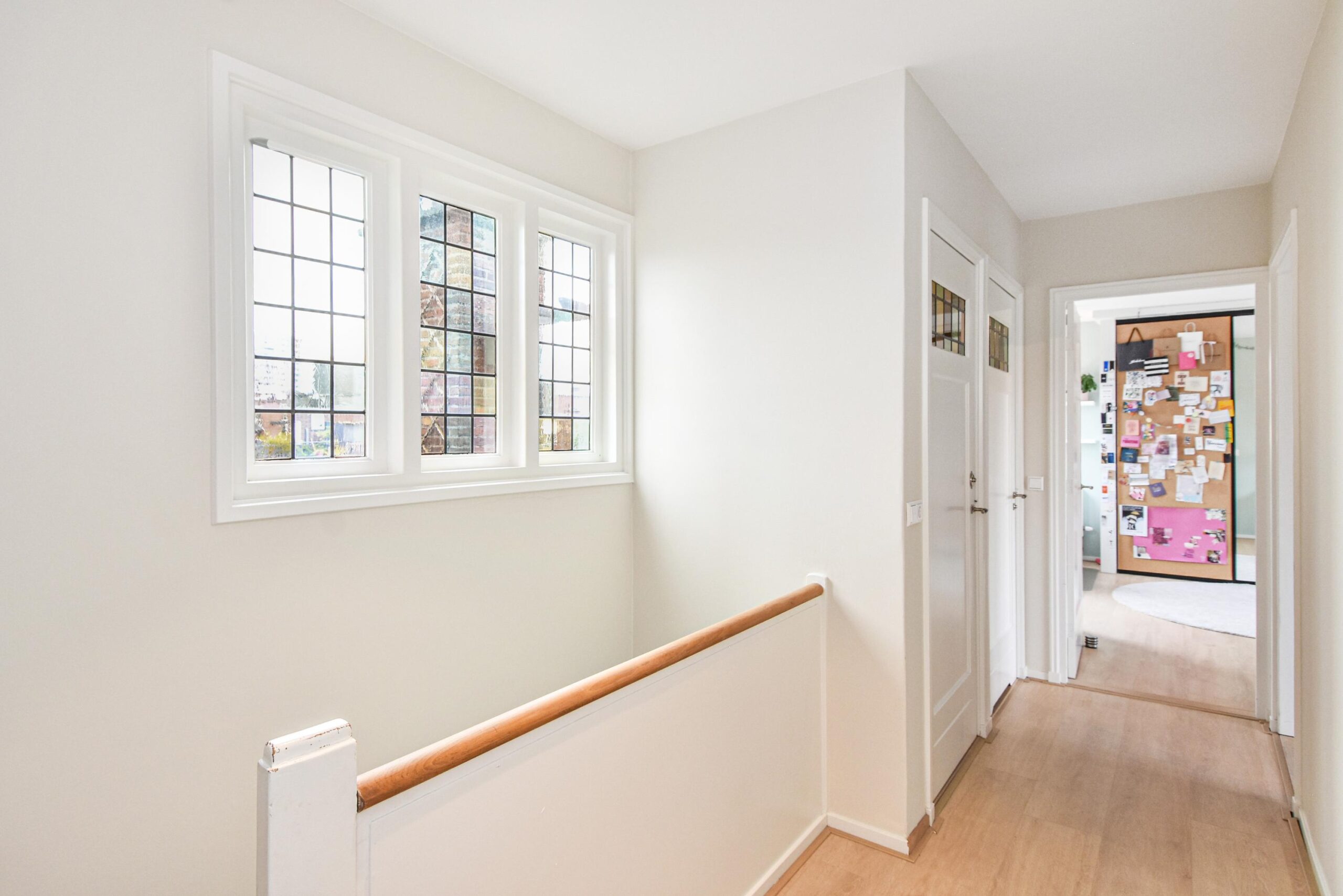 Vanuit hal is er een trap naar de verdieping. Hier komt u op een overloop die met de grote raampartij erg licht is en een glas in lood raam bevat. Aan de buitenzijde bevindt zich een voorzetraam ter isolatie.