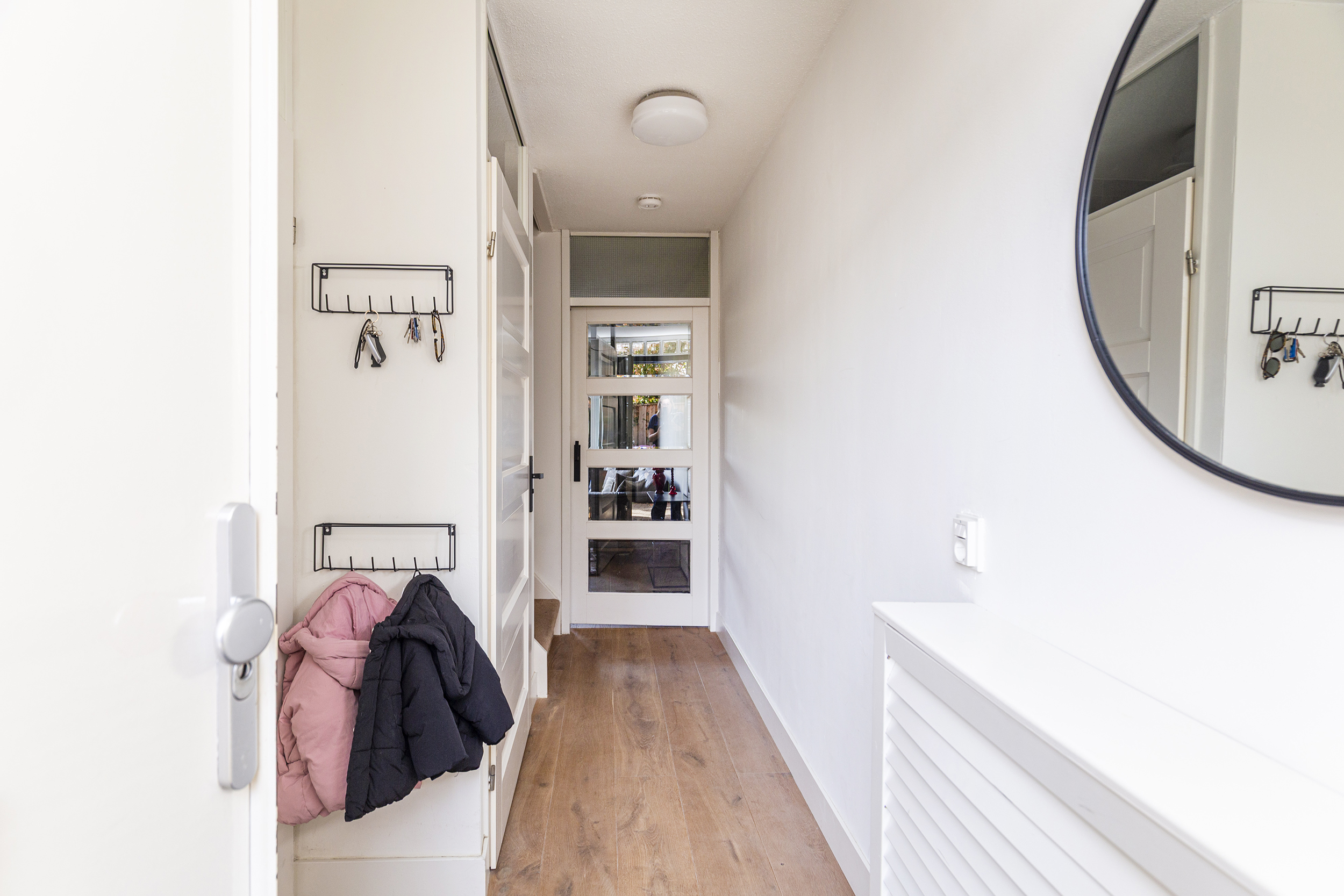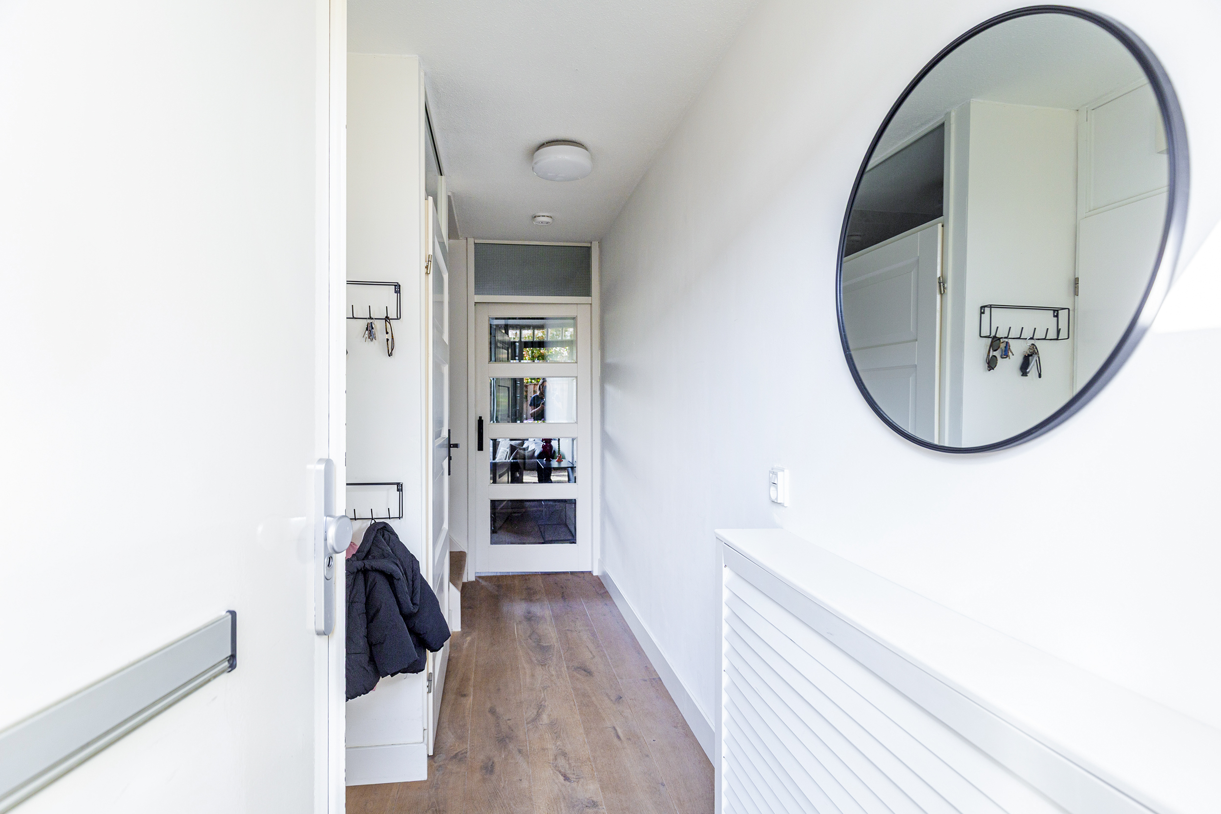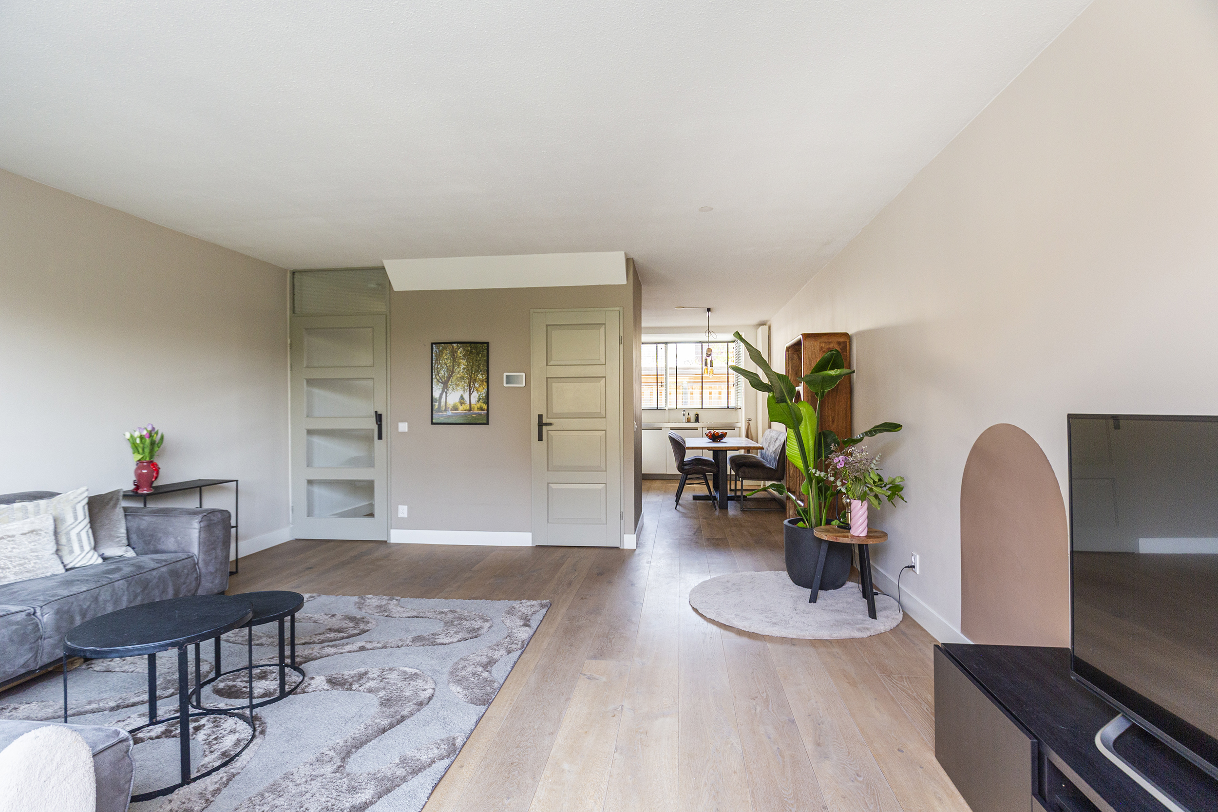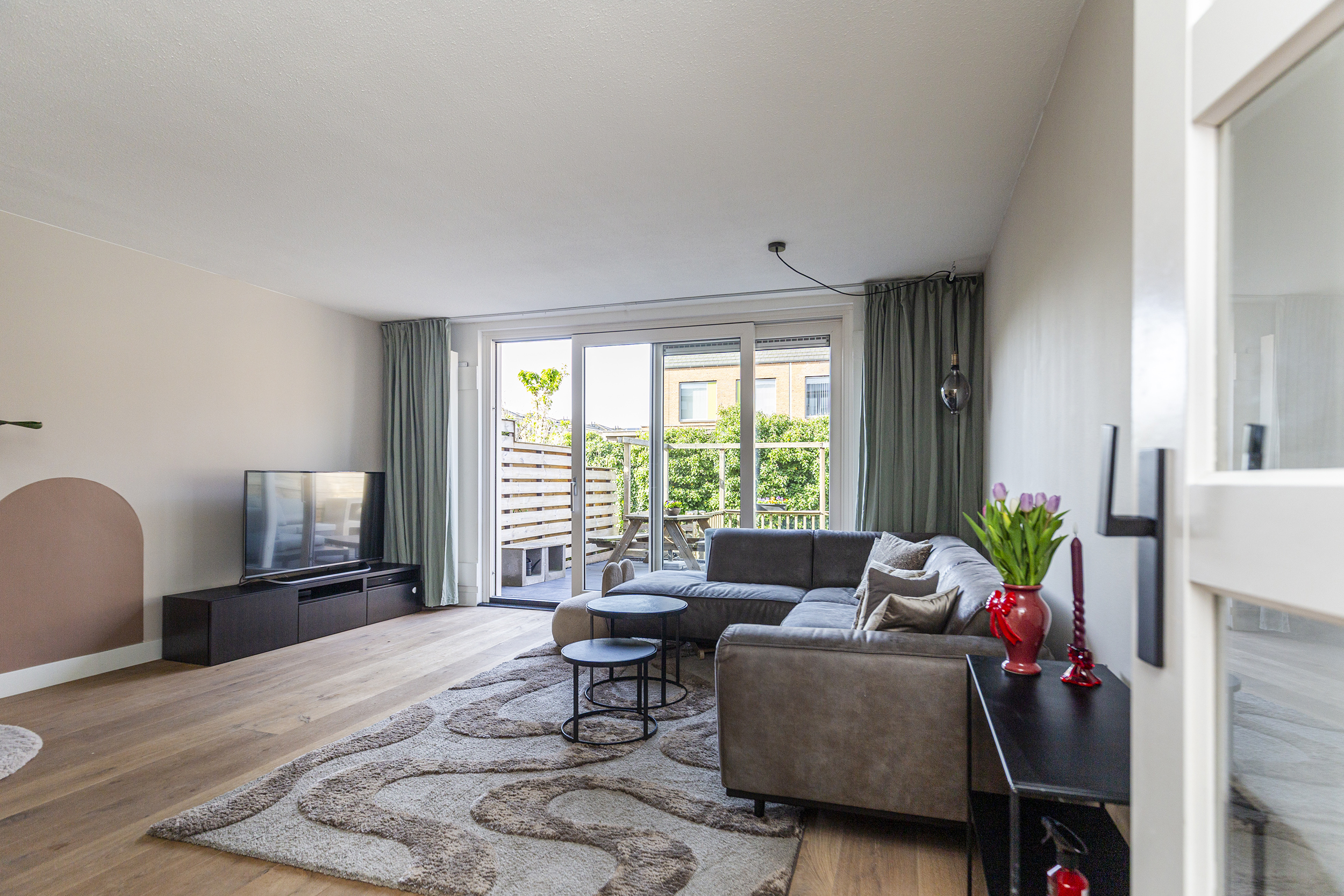 Bij binnenkomst valt direct de warme uitstraling van de begane grond op, voorzien van een prachtige echte eikenhouten vloer. De lichte woonkamer, met veel zonuren, biedt een fijne leefruimte met directe verbinding naar de tuin.