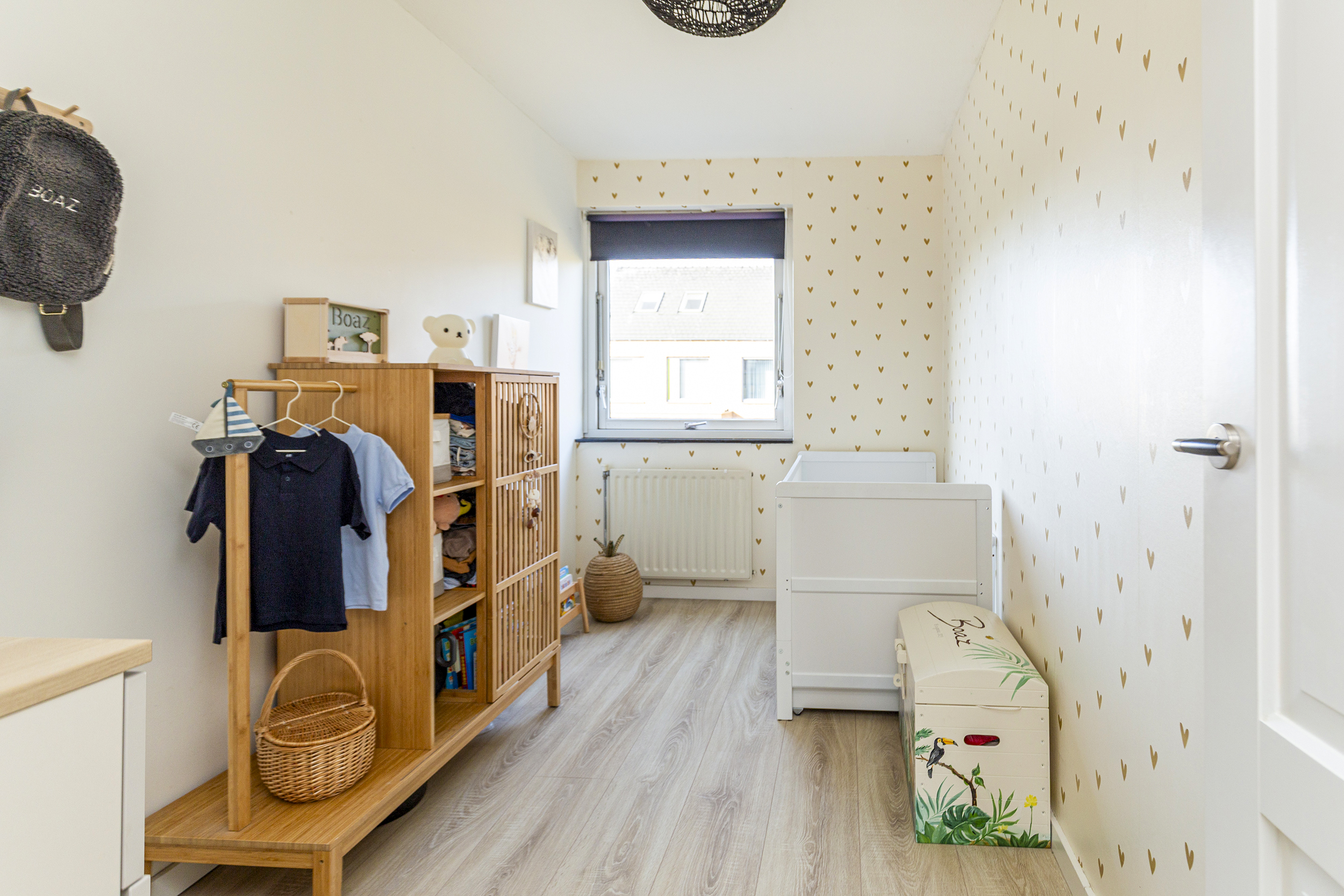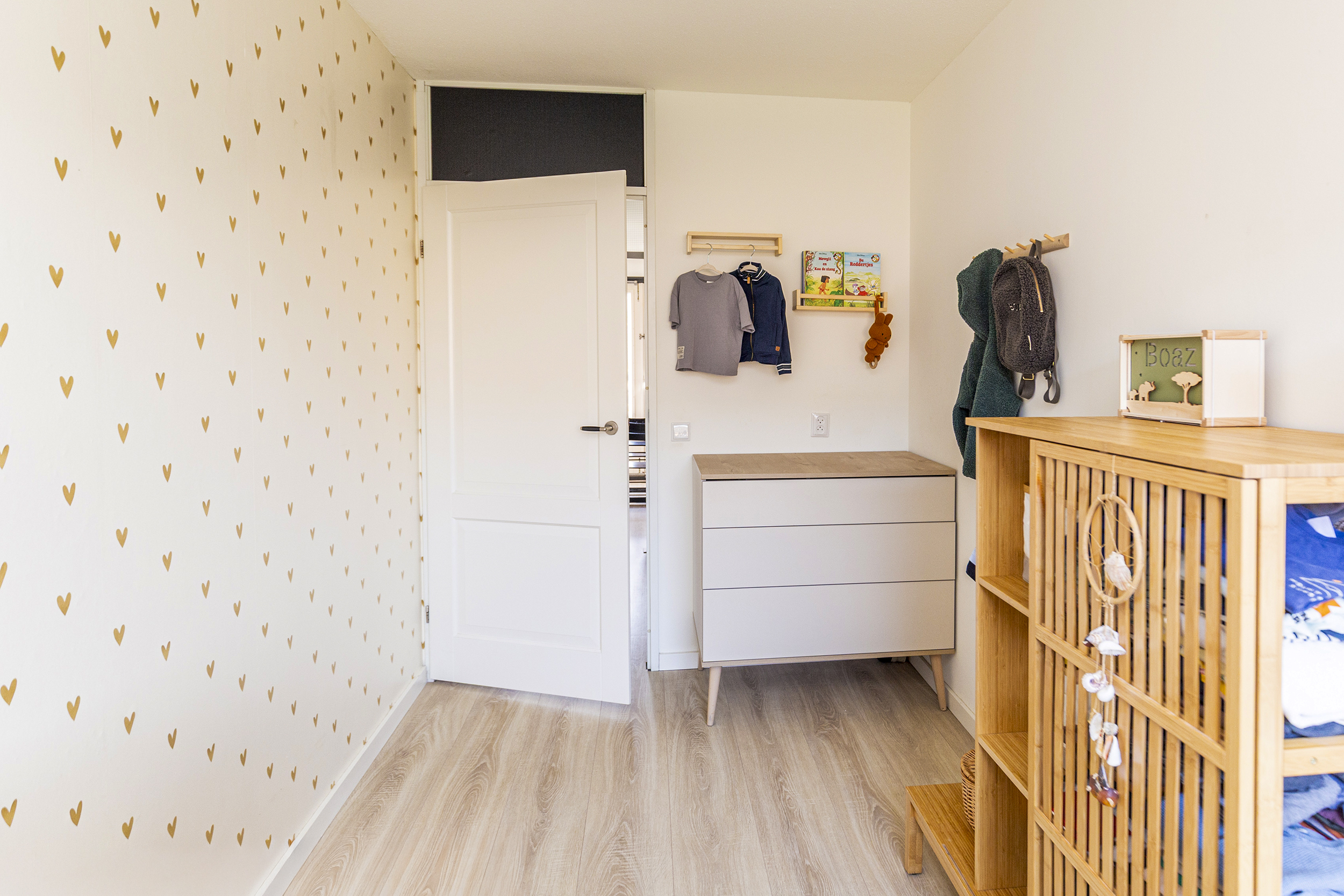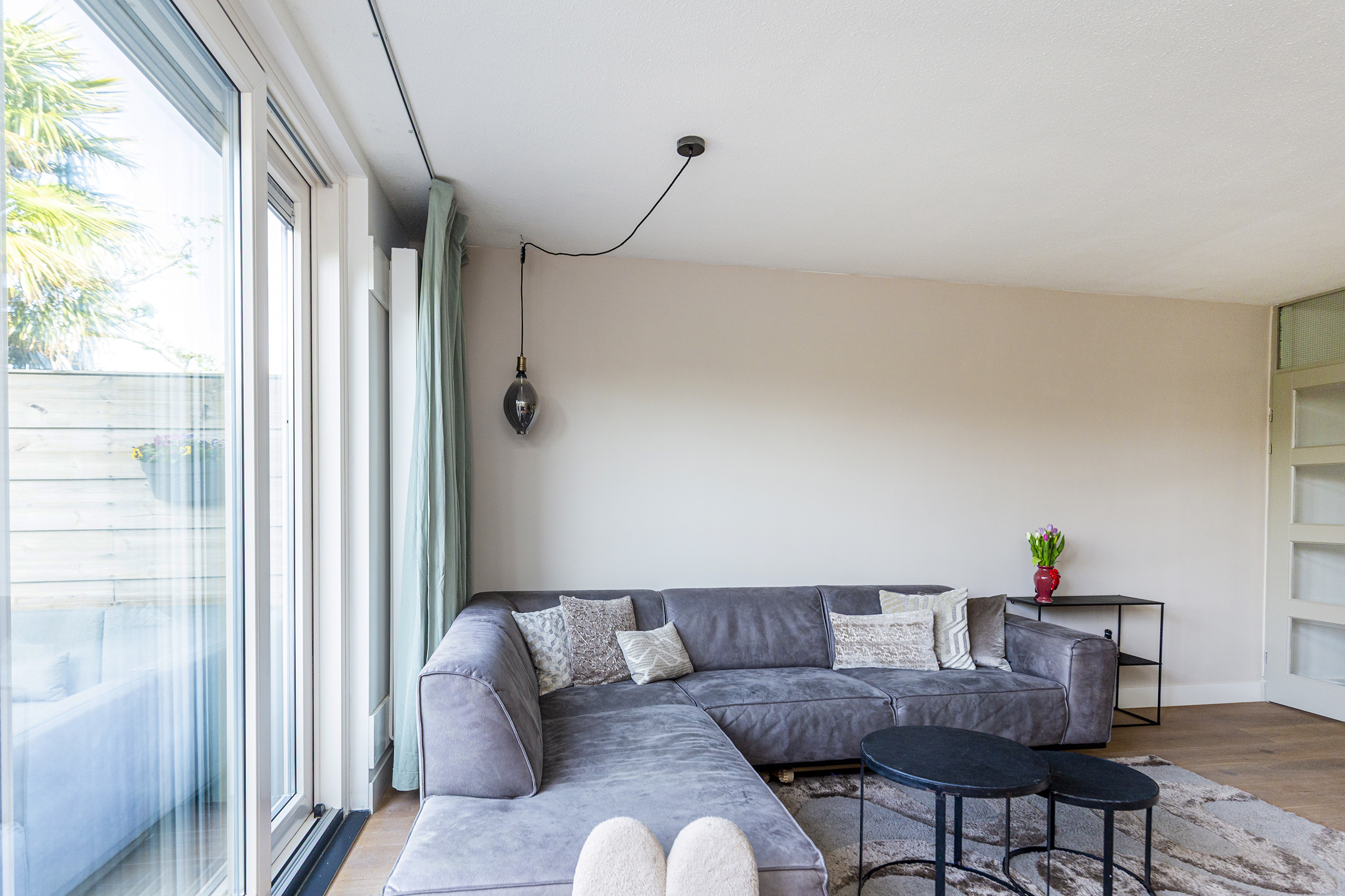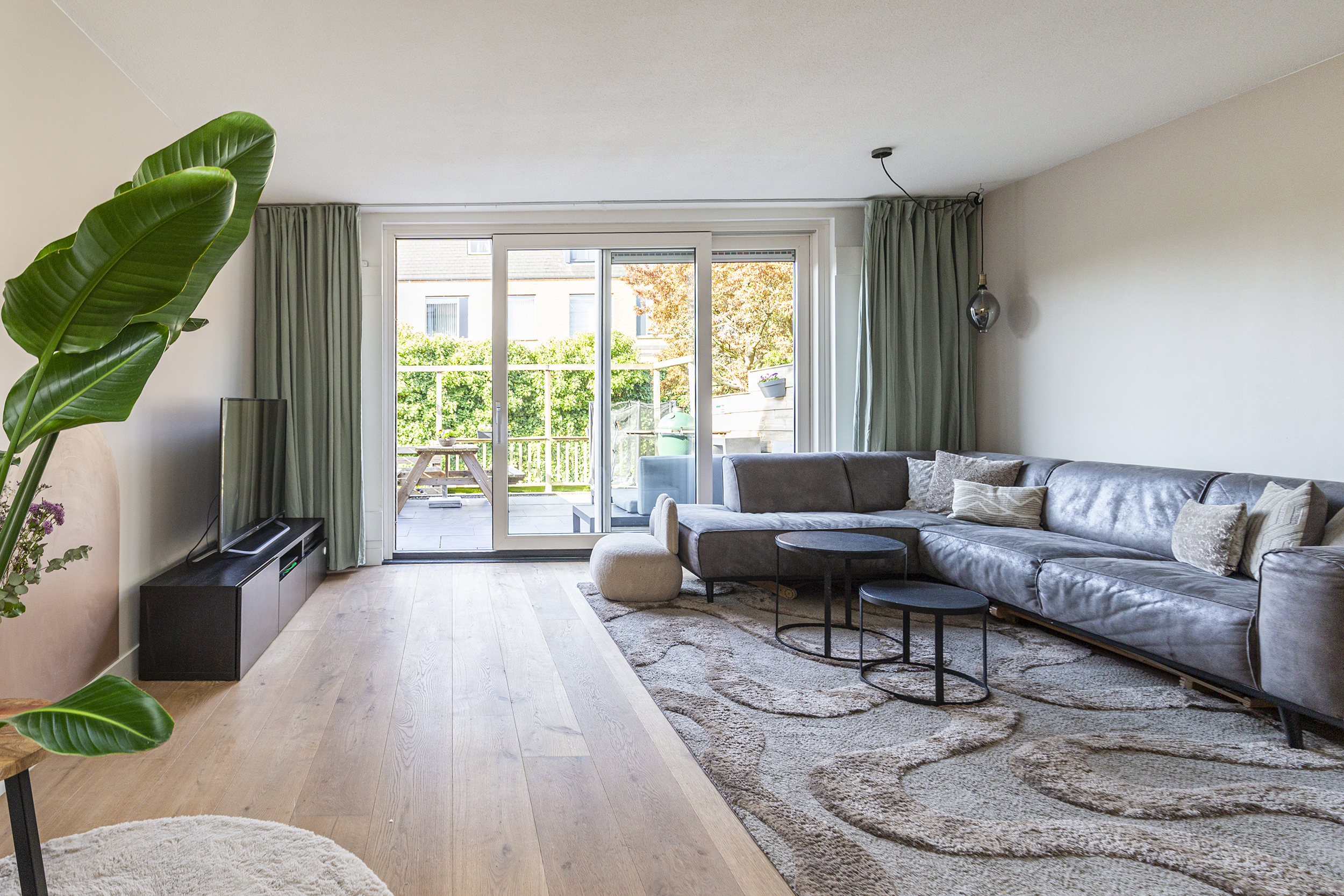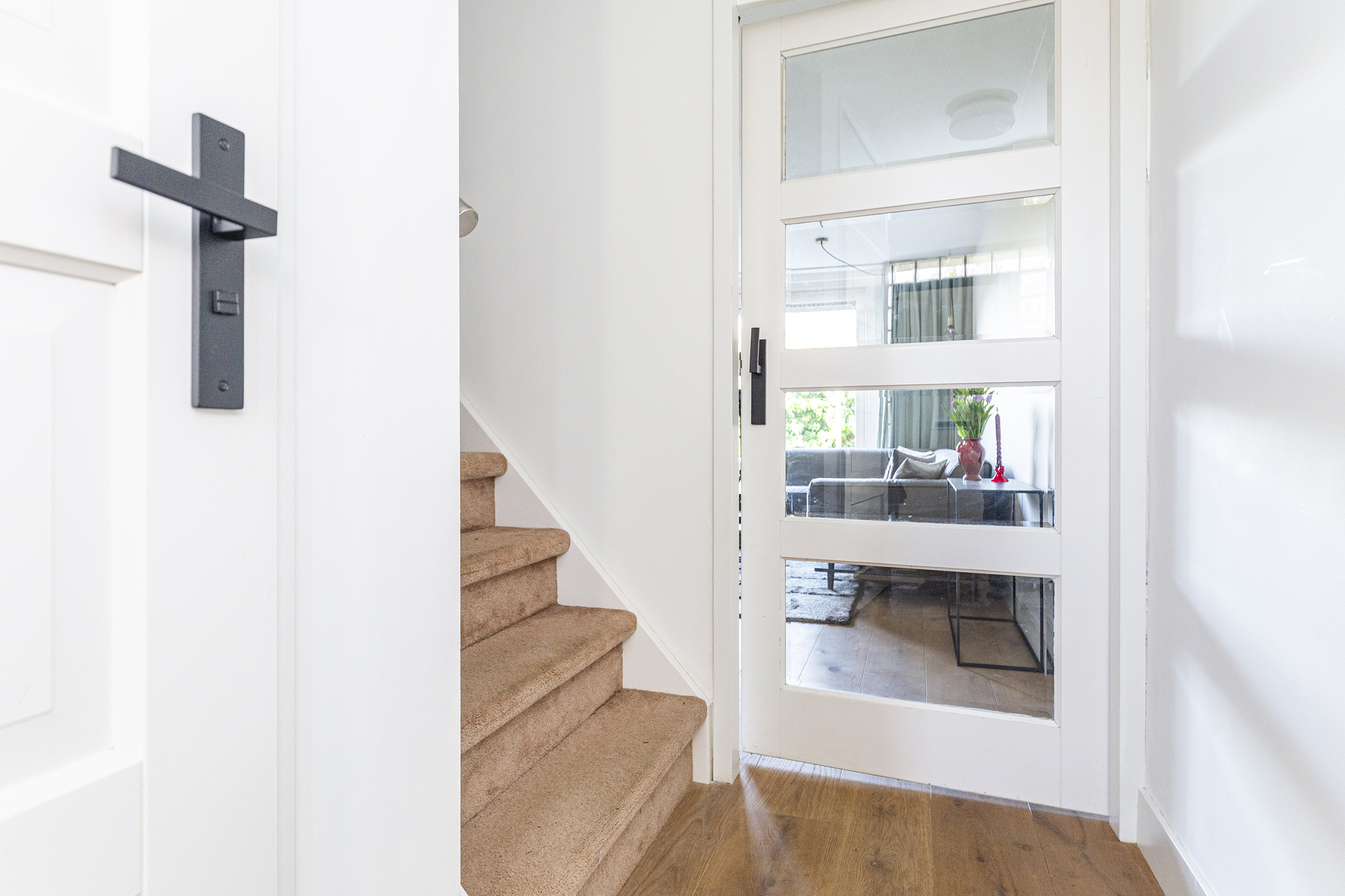 Bij binnenkomst valt direct de warme uitstraling van de begane grond op, voorzien van een prachtige echte eikenhouten vloer. De lichte woonkamer, met veel zonuren, biedt een fijne leefruimte met directe verbinding naar de tuin.