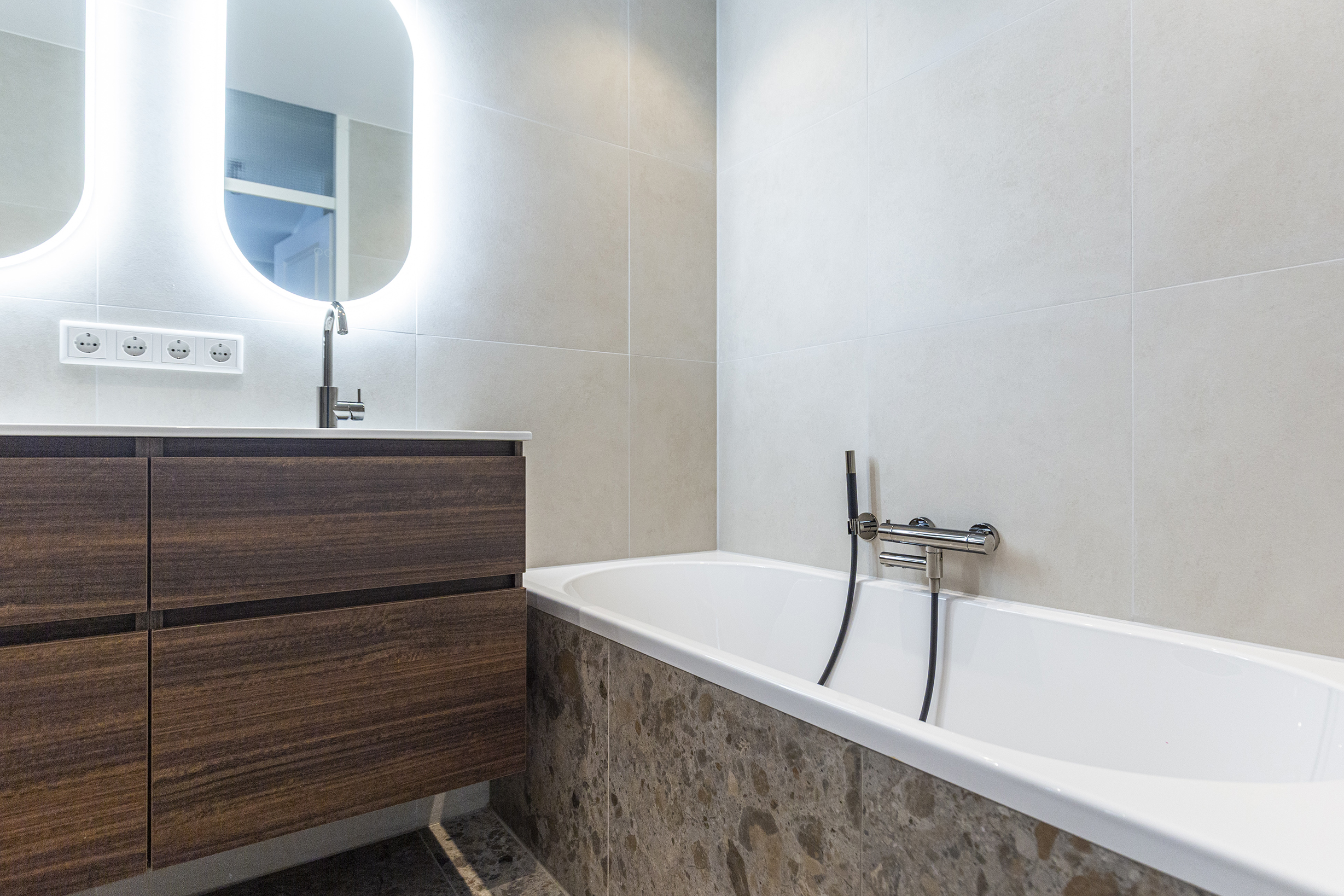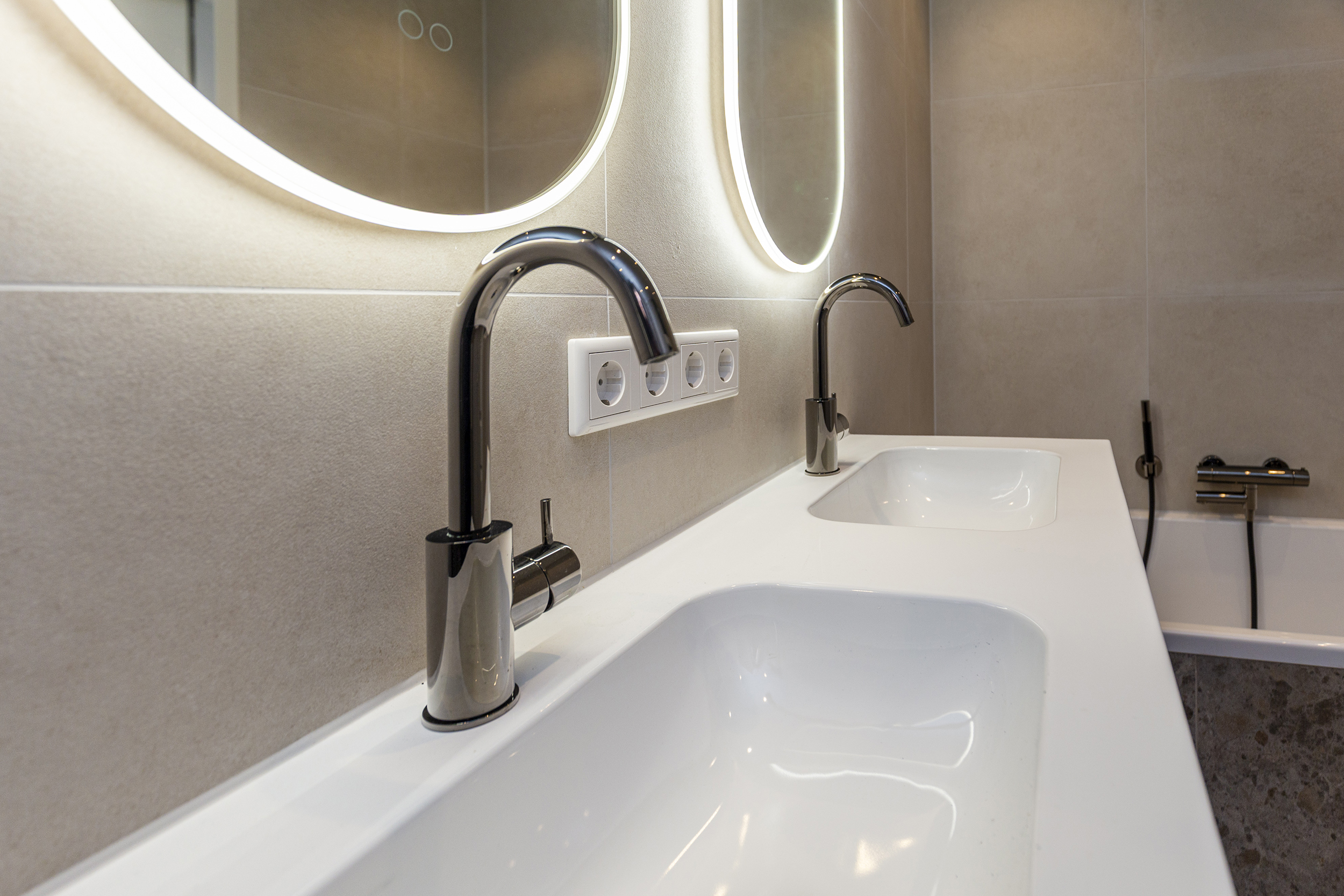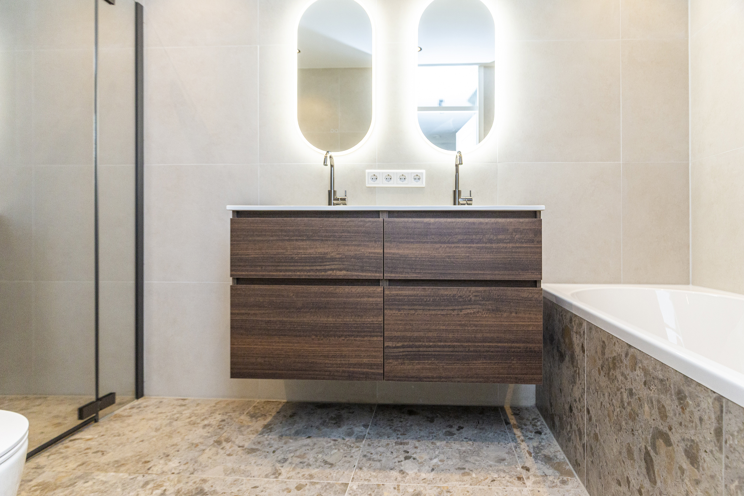 - Badkamervoorzieningen Ligbad, toilet, dubbele wastafel, wastafelmeubel, inloopdouche